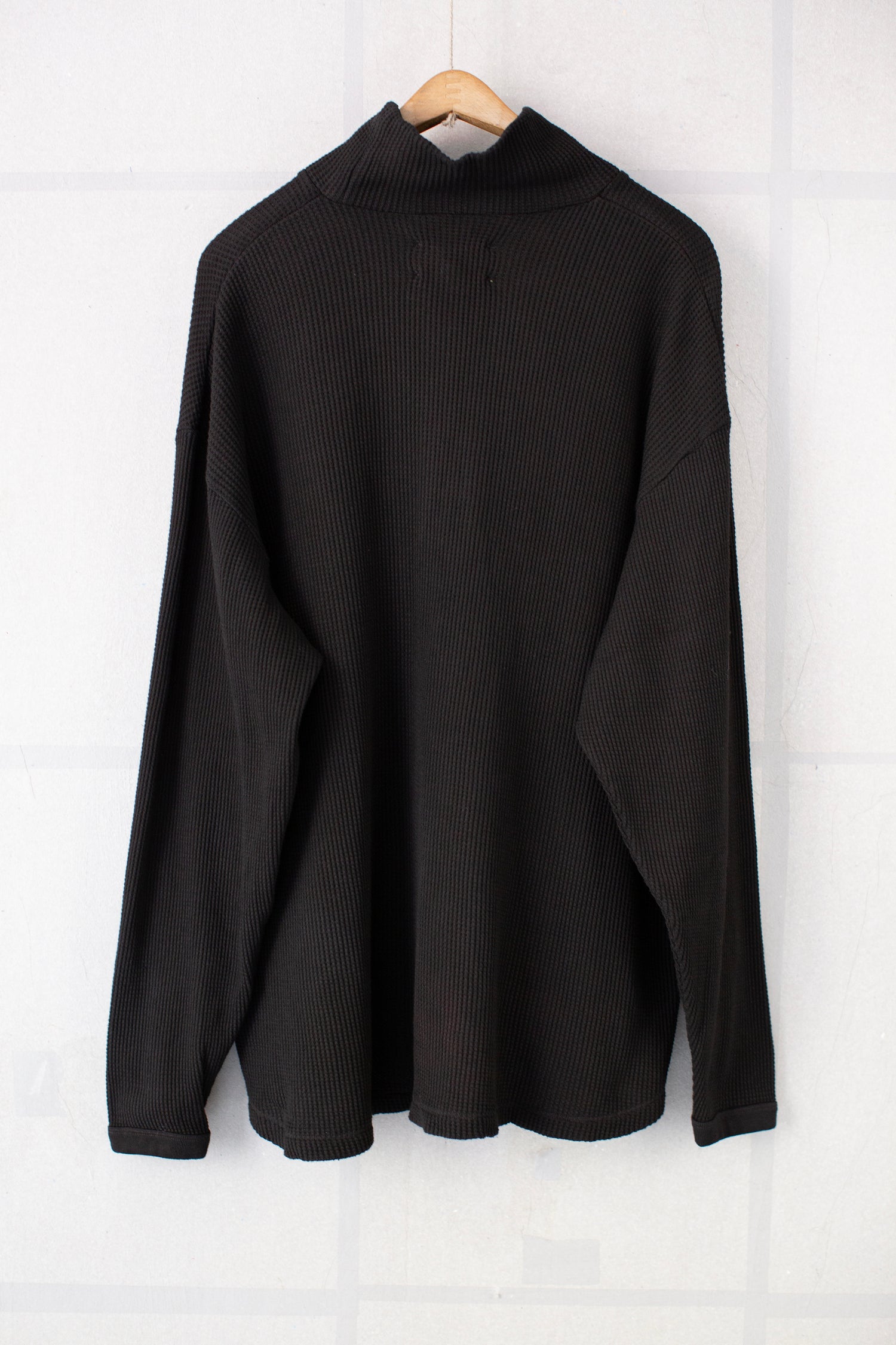 High neck pullover by Yoko Sakamoto in natural kakishibu (persimmon tannin) dyed mid weight thermal jersey with dropped shoulders, a loose silhouette and rib edged long sleeves.