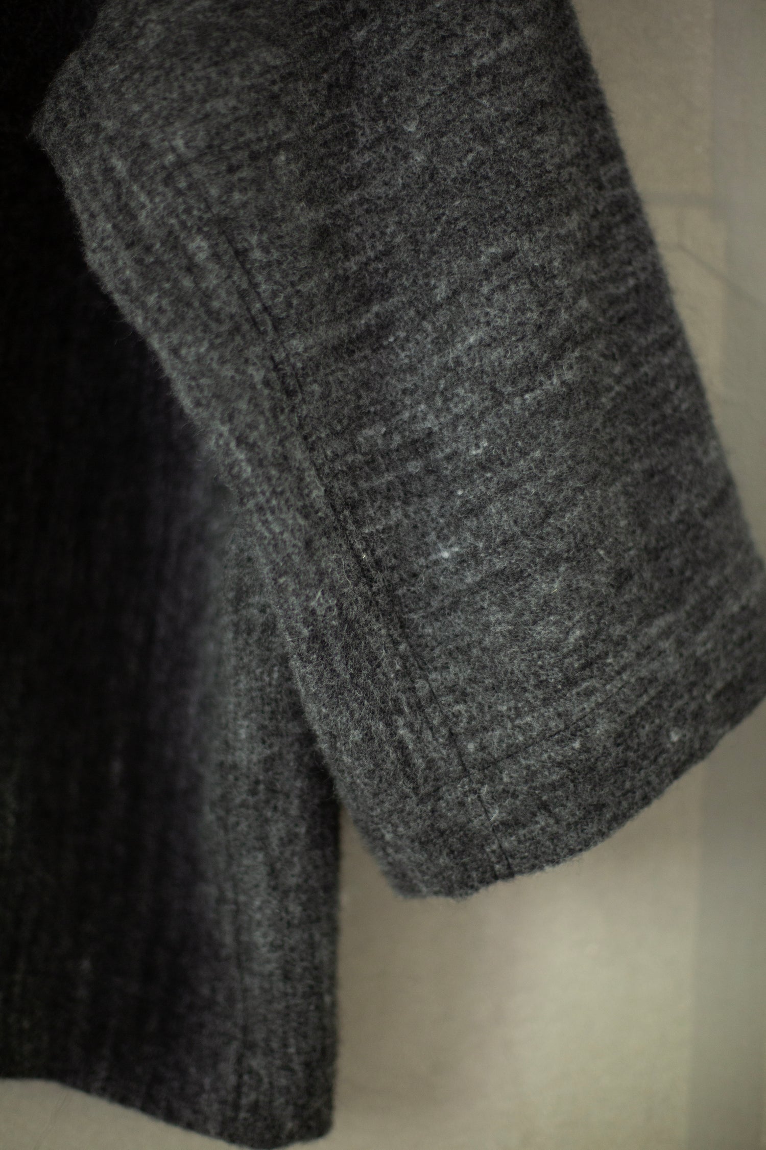 A brushed surface, woven in an off black-dyed Chinese hemp, English Shetland wool and Italian linen.