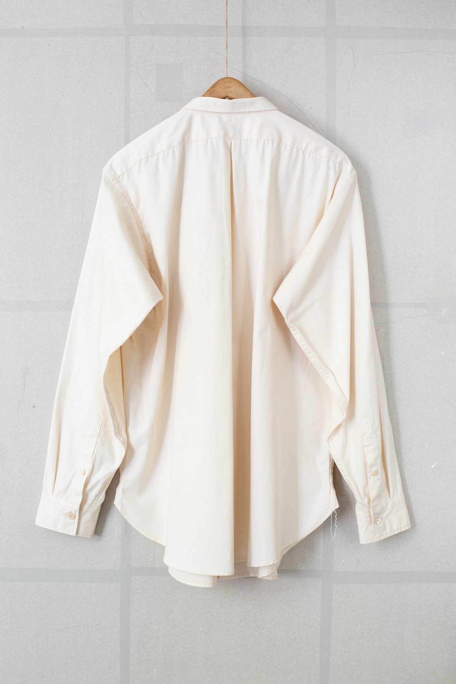 Ivory narrow collar shirt by Taiga Takahashi with patch chest pocket, mother of pearl buttons, round hem and inverted box pleat in back.