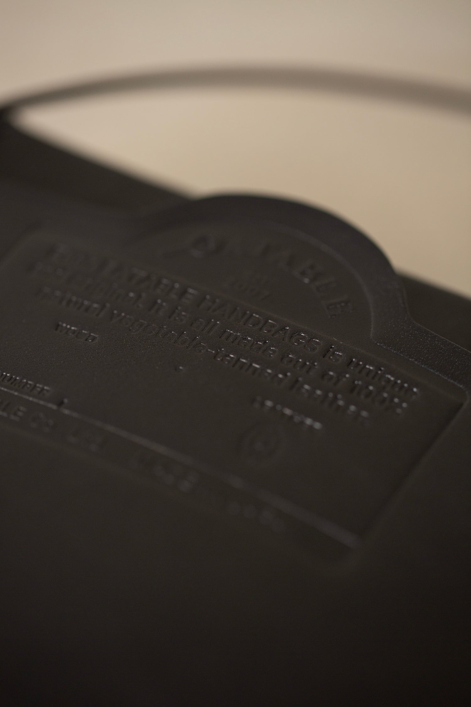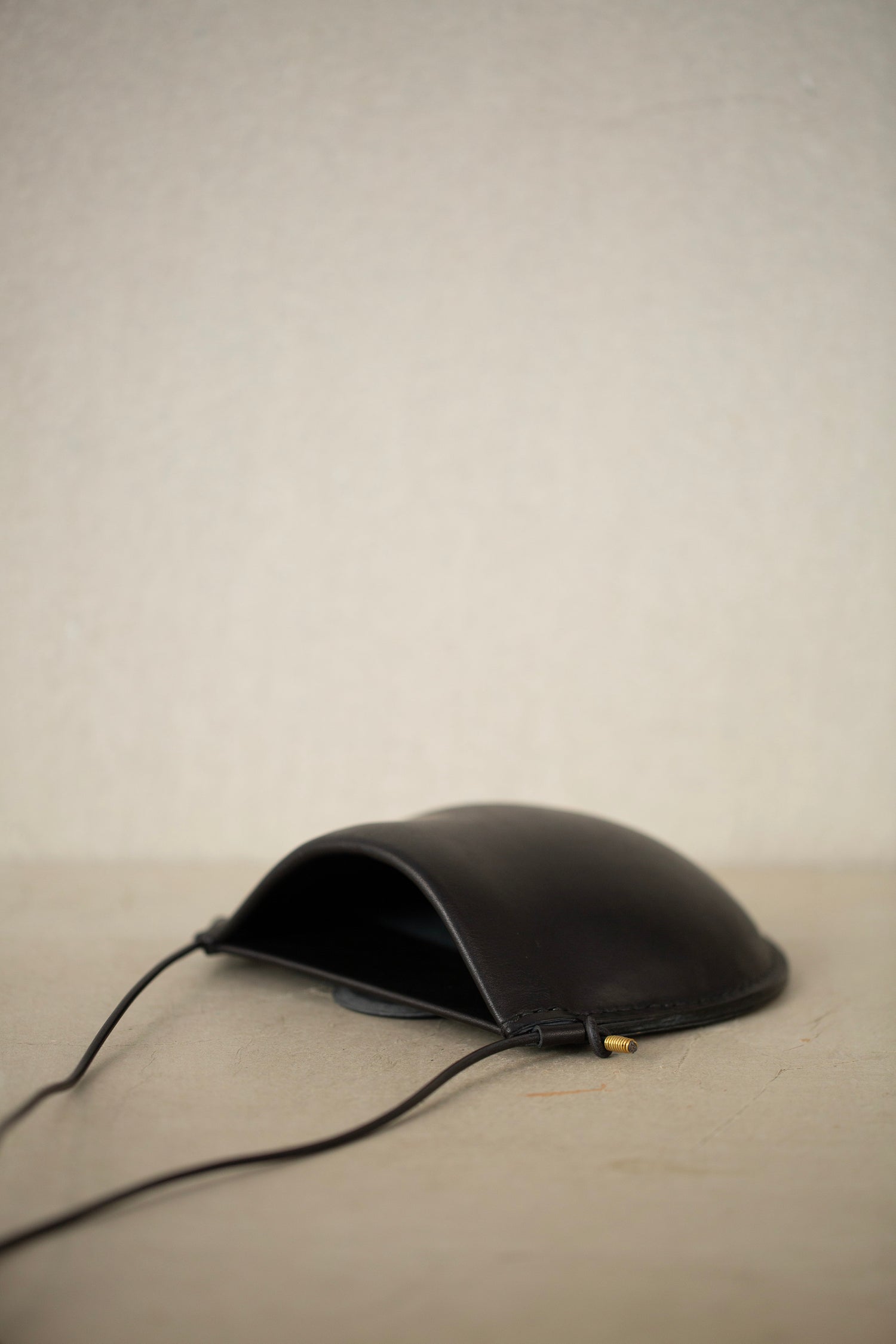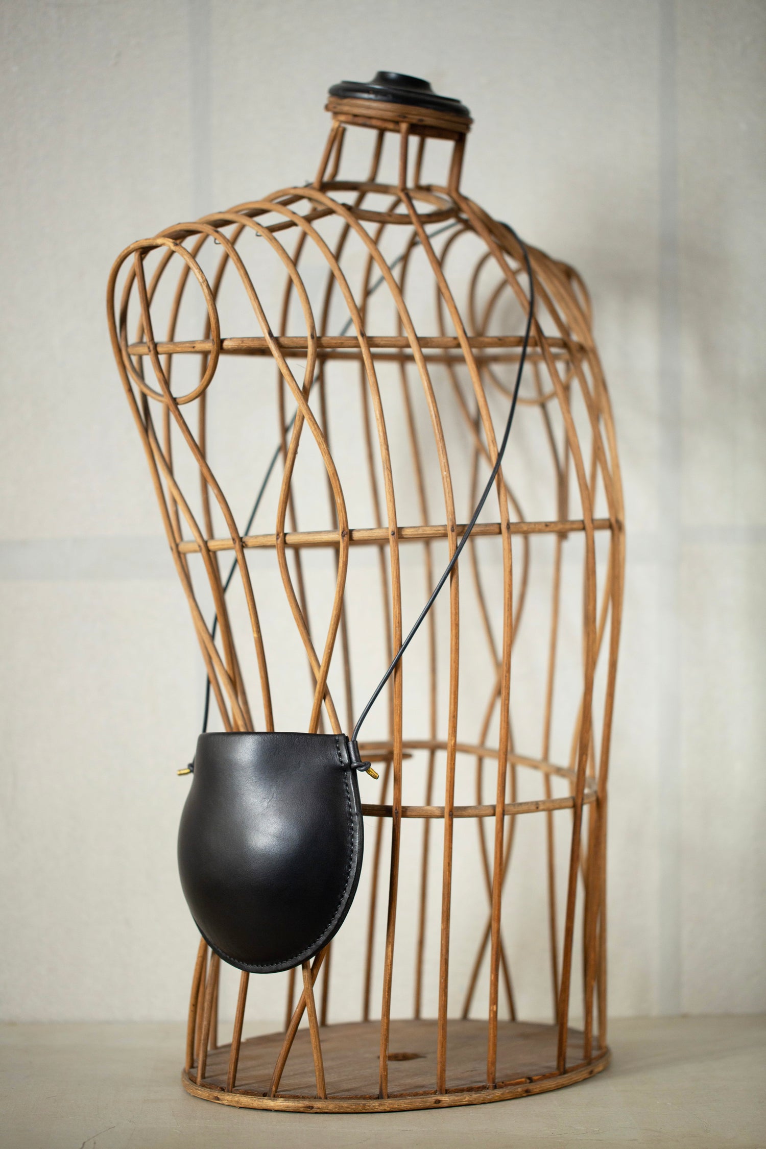 Pocket shoulder bag by Eatable Of Many Orders in black cow leather, with seperate back compartment.