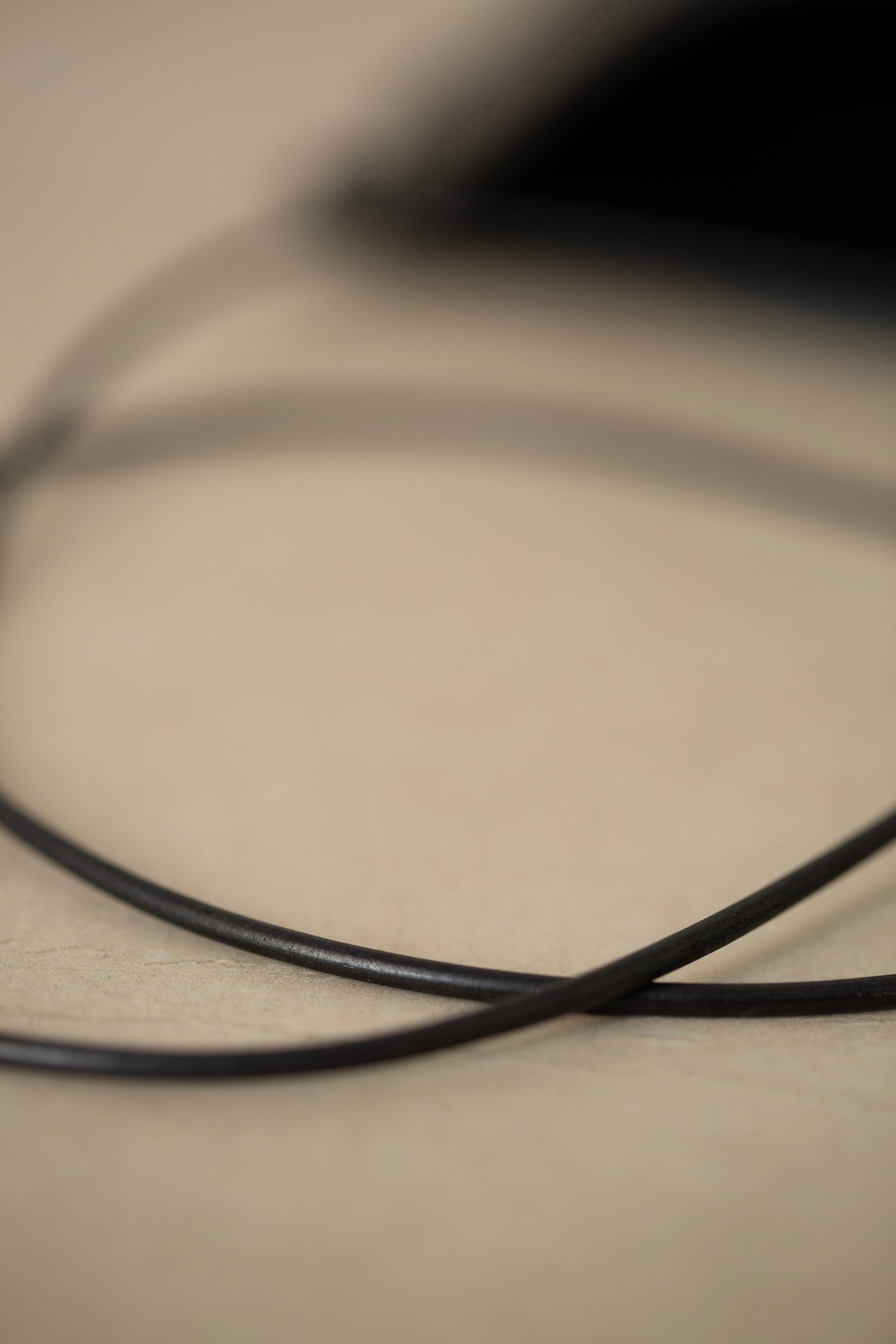 The fine leahter strap is coiled with brass wire on the end and is adjustable in length.