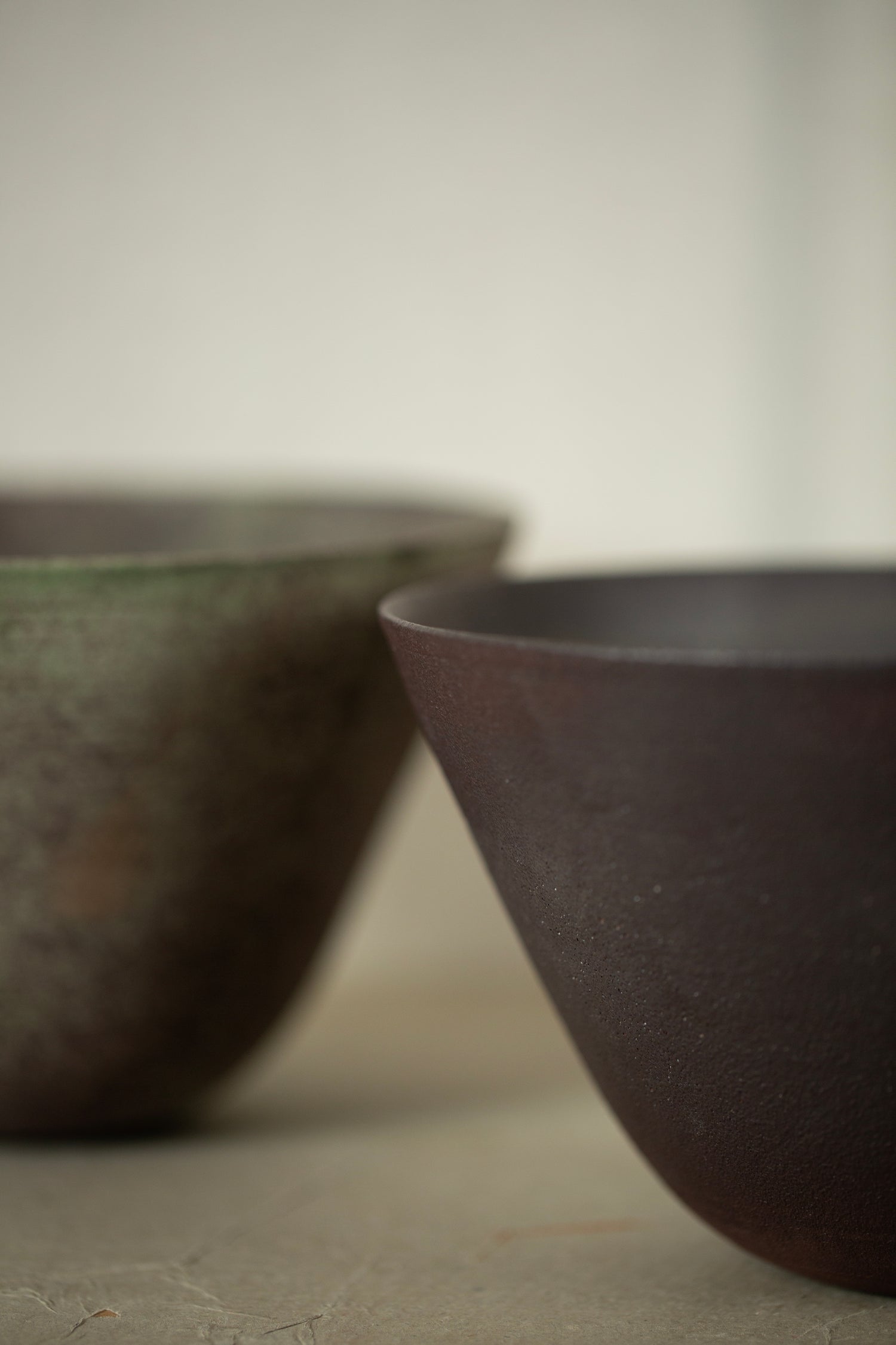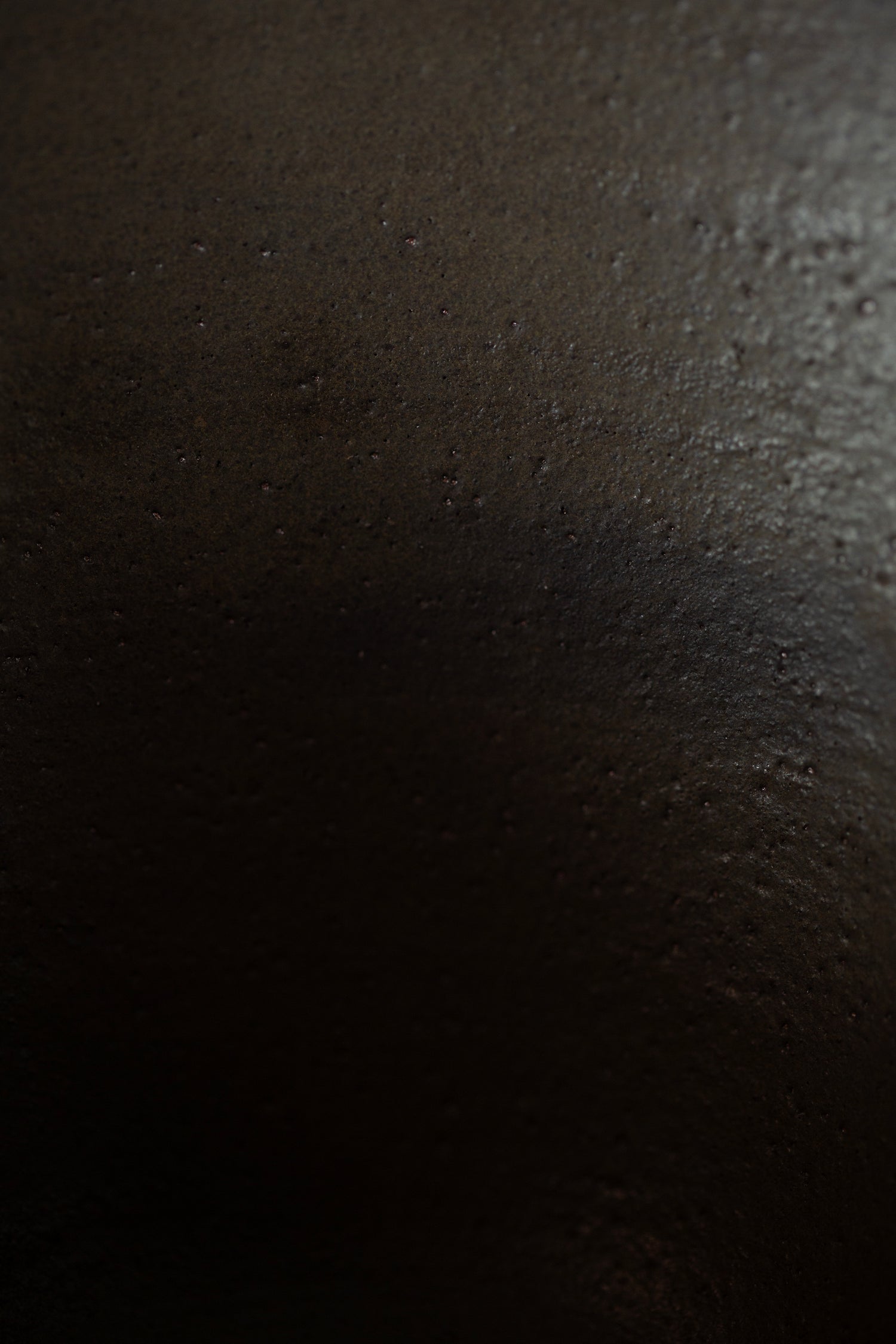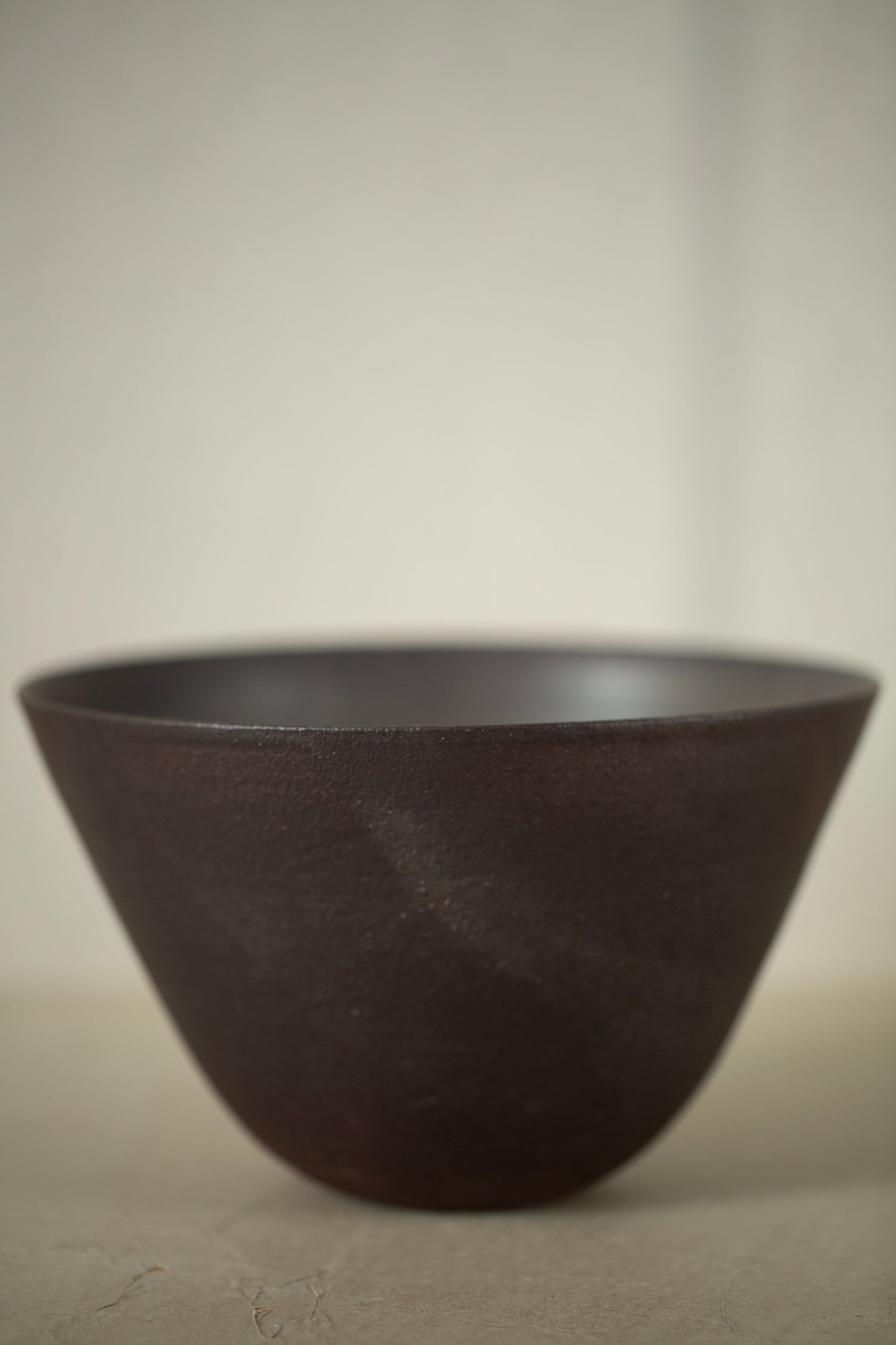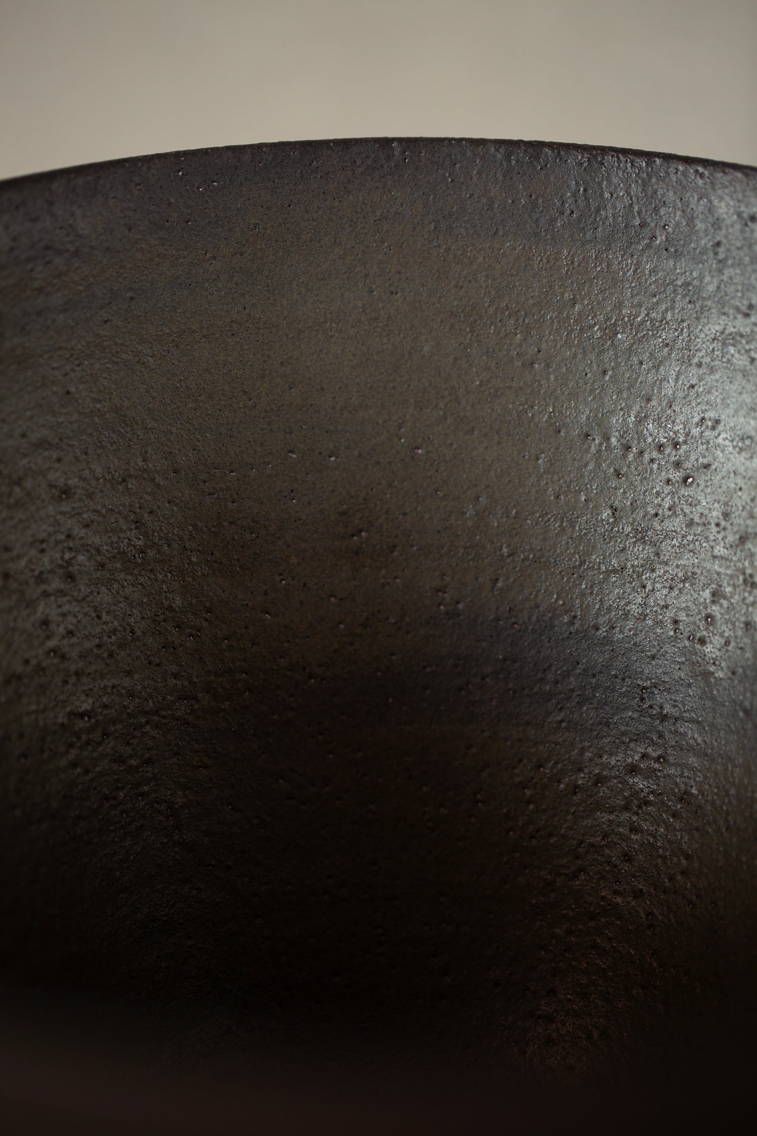 An elegant large ceramic bowl by Ciprian Tocu hand turned in blackish sandstone with structures resembling hammering work.