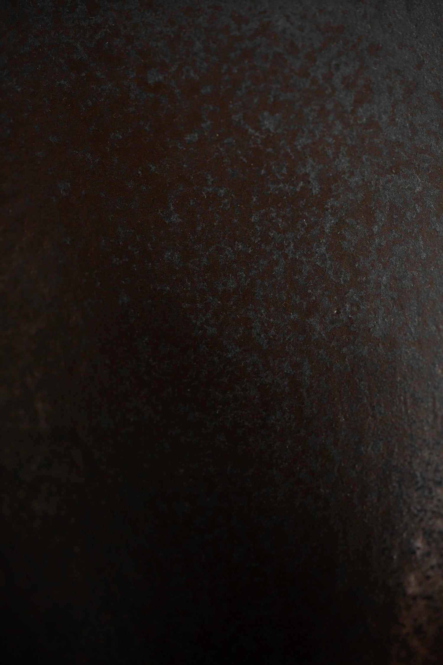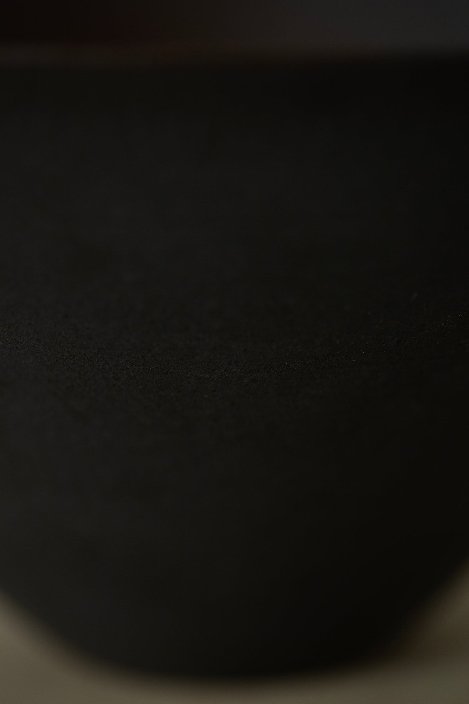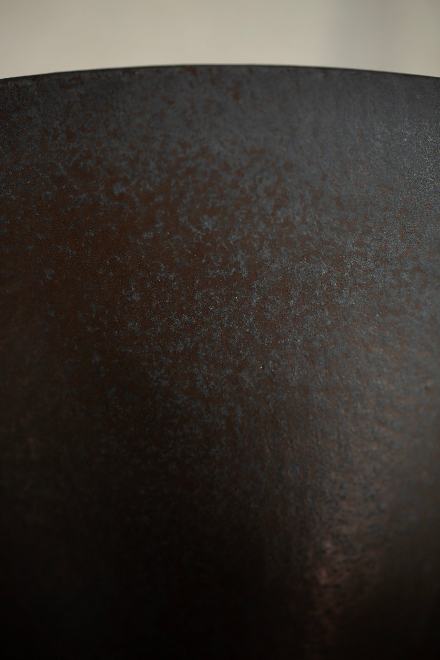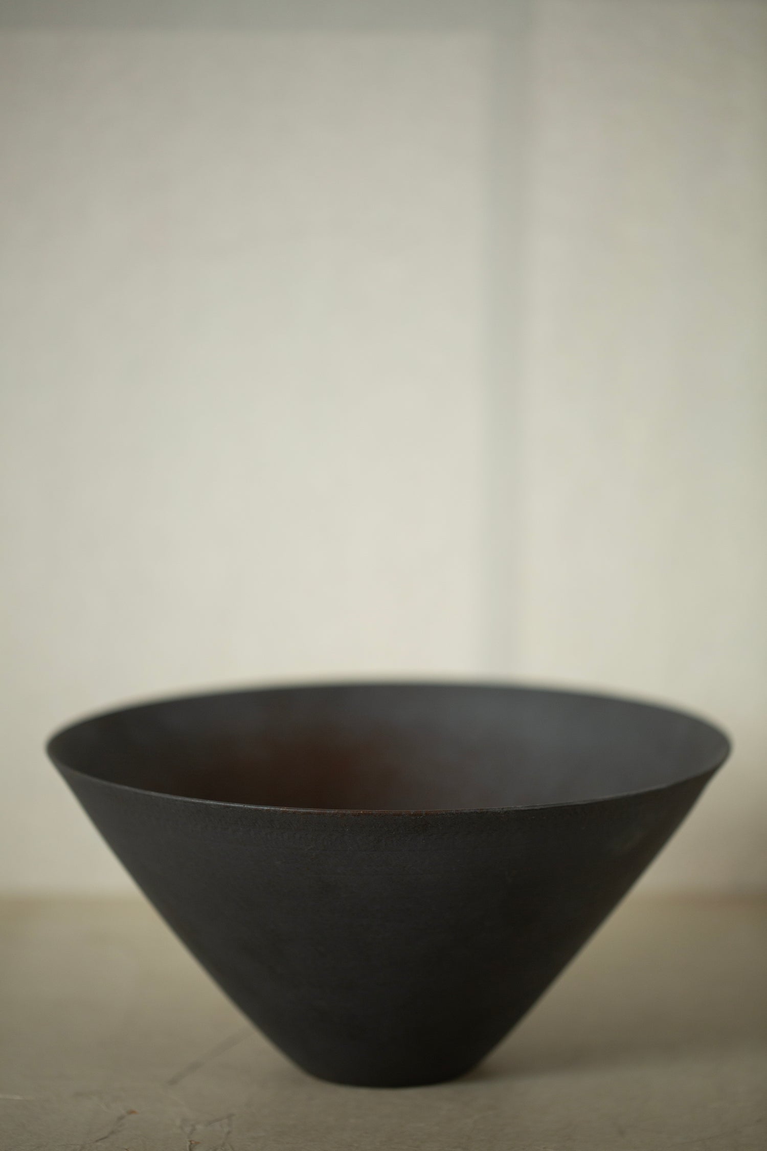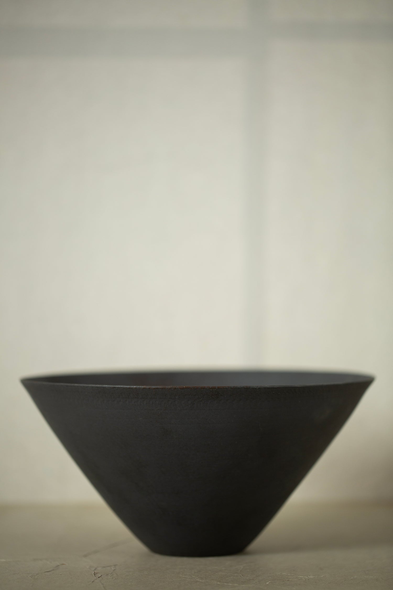An elegant large ceramic bowl by Ciprian Tocu hand turned in blackish sandstone with structures resembling hammering work.