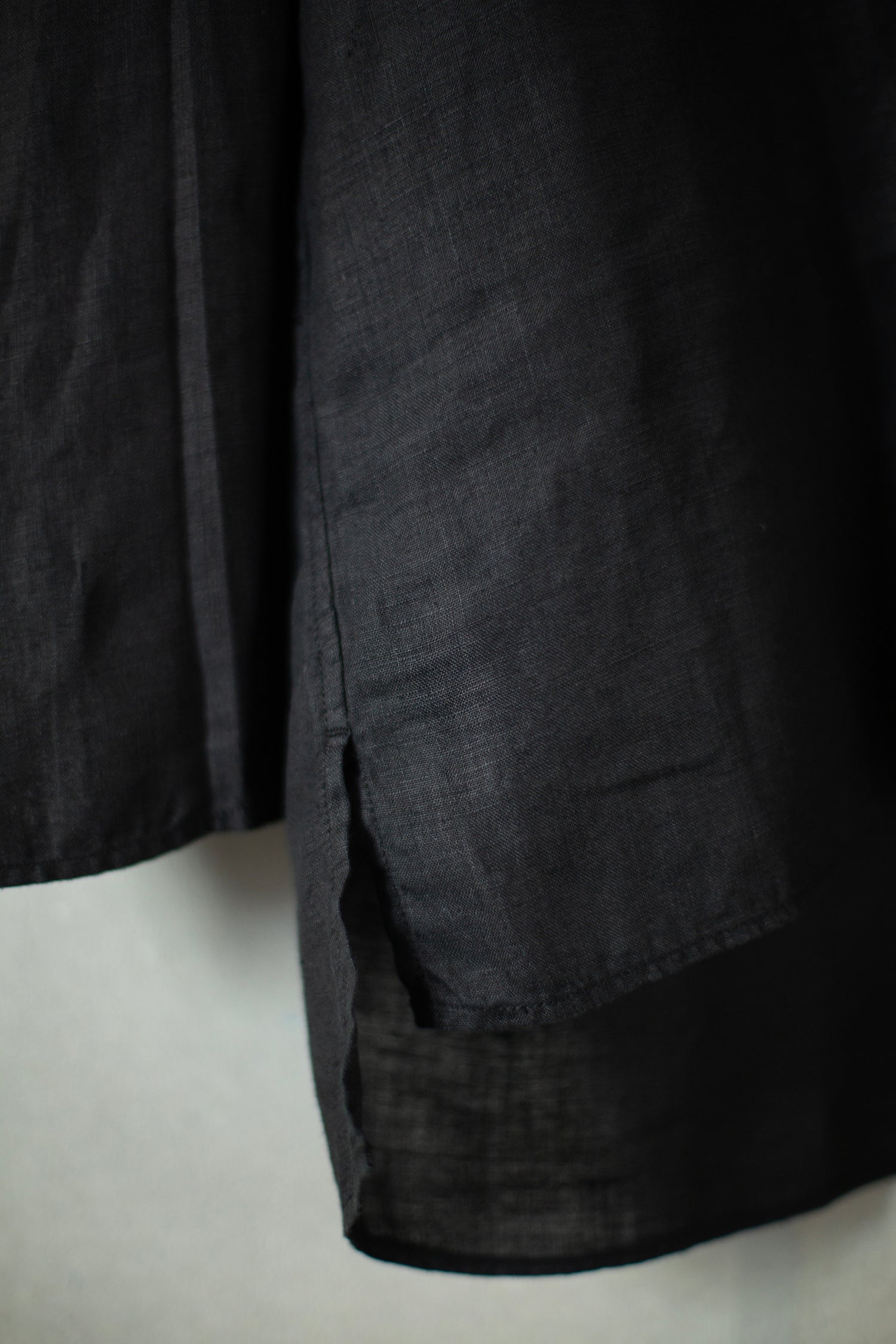 Oversized long sleeve pullover in black hemp by Mittan with small split on the sides, back longer than front, V-shaped henley neck and a single camel bone button.