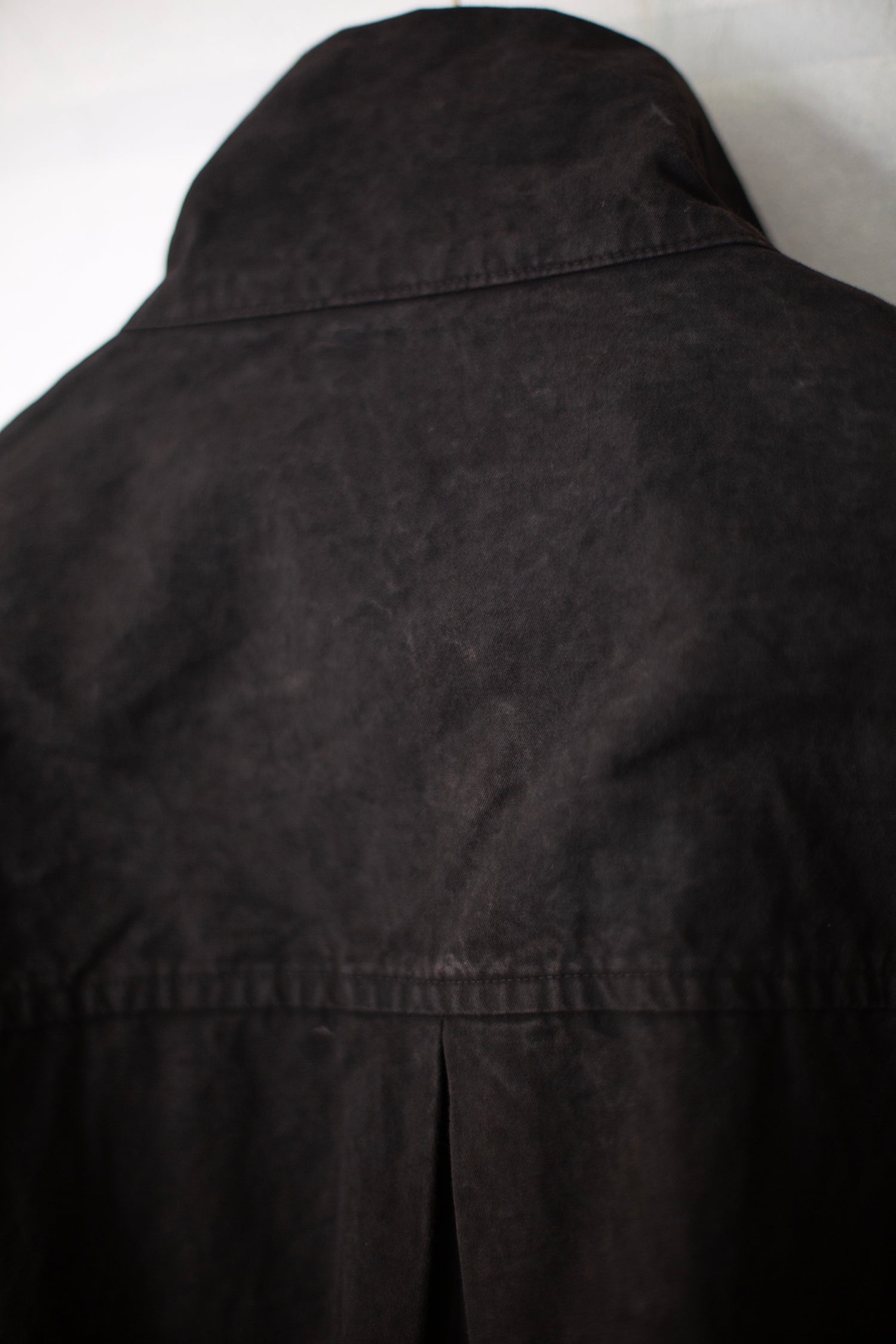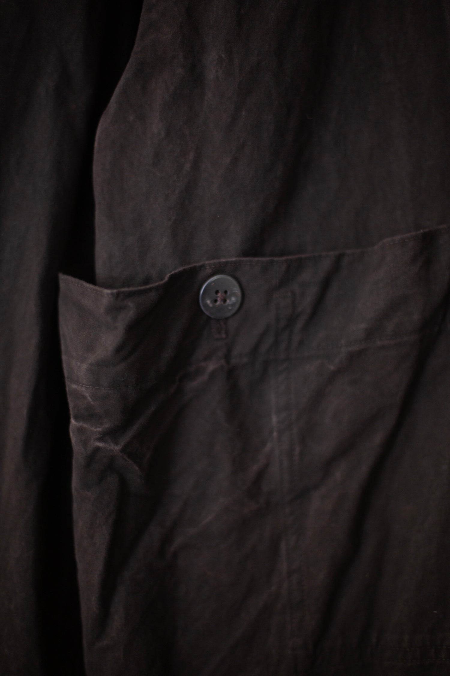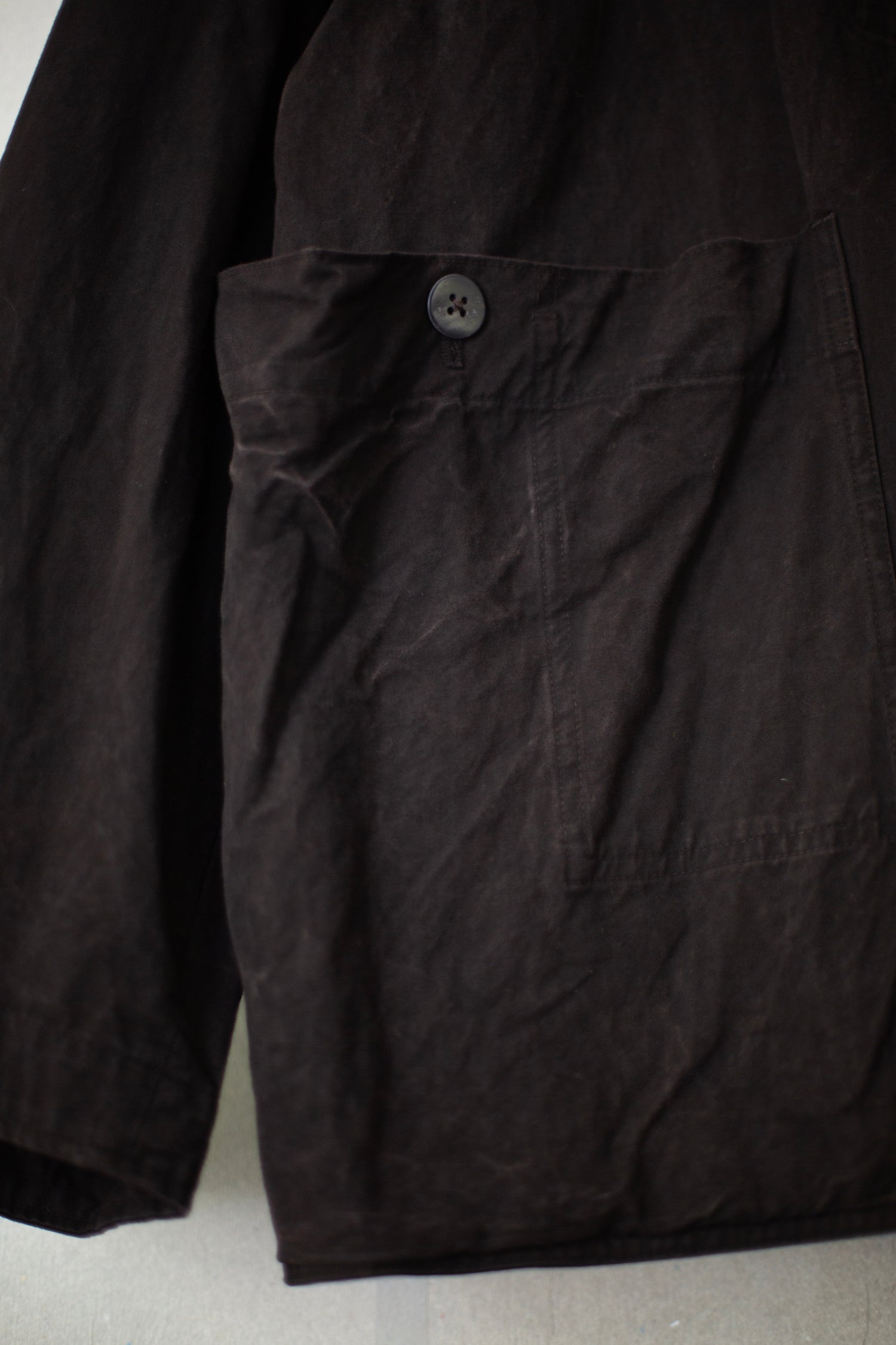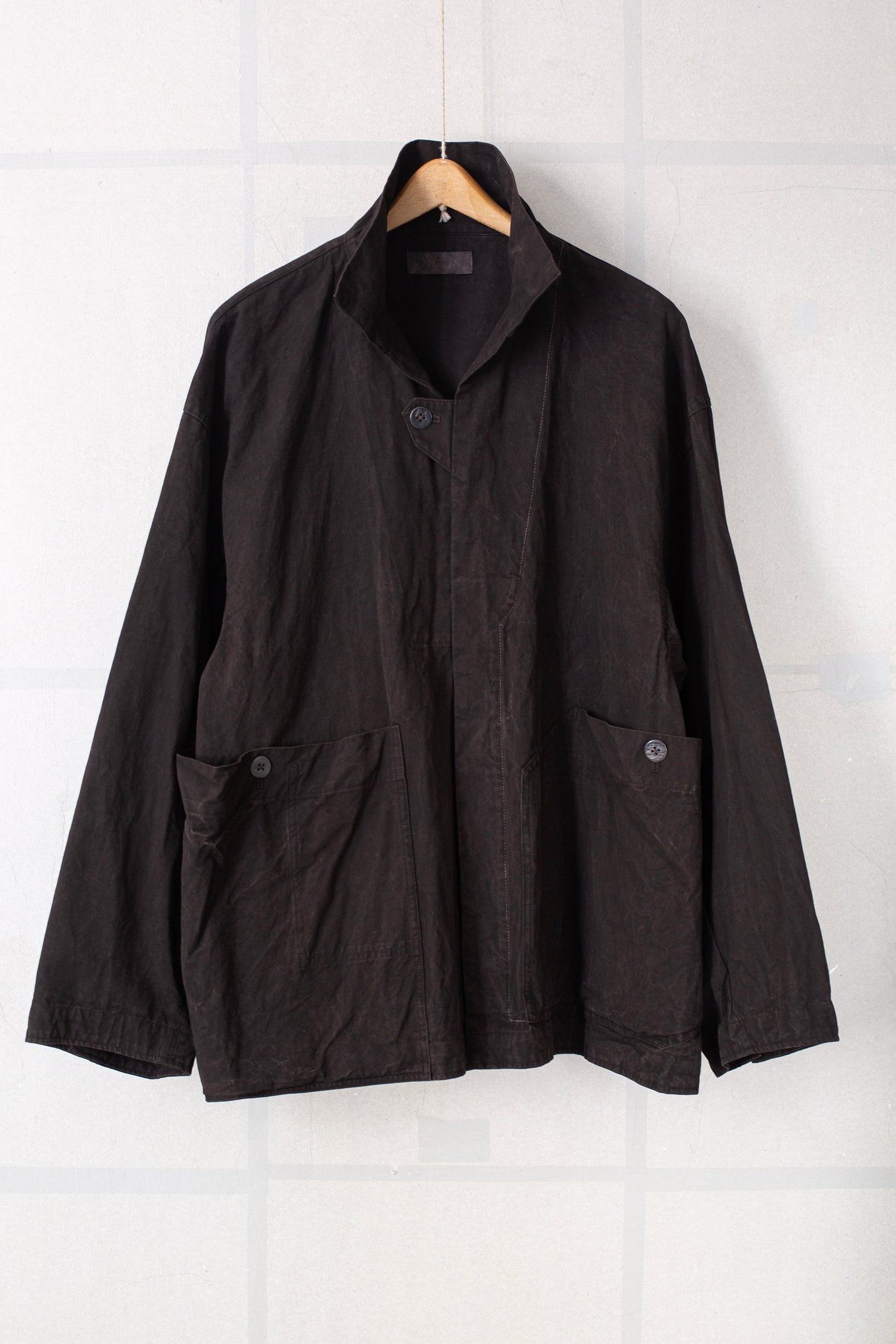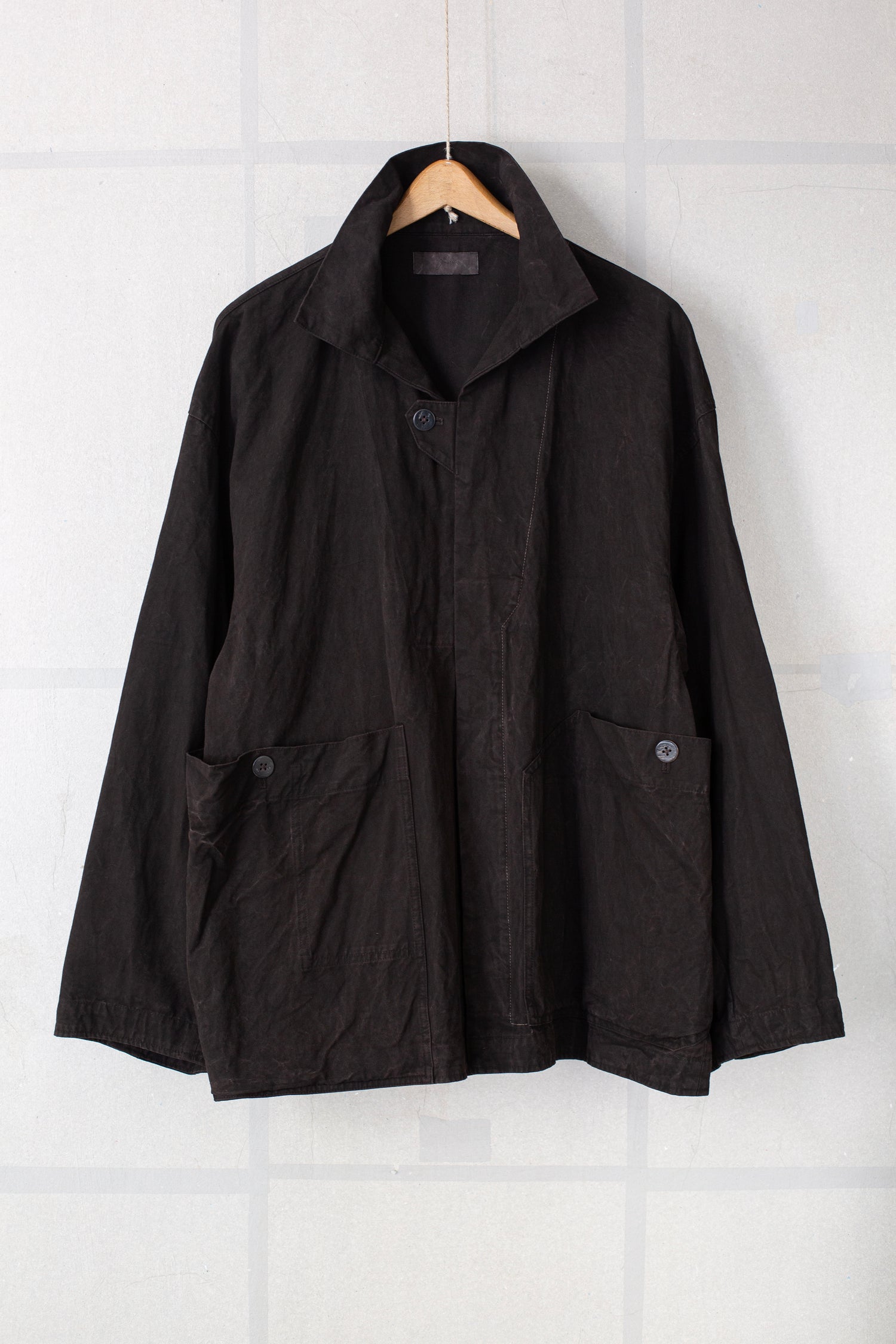 Meeting jacket by Amachi in Natural Dye Dark Mud Brown with open collar, partial blind placket button closure, two big patch pockets with one inside pocket and button closure, and inverted box pleat in back.