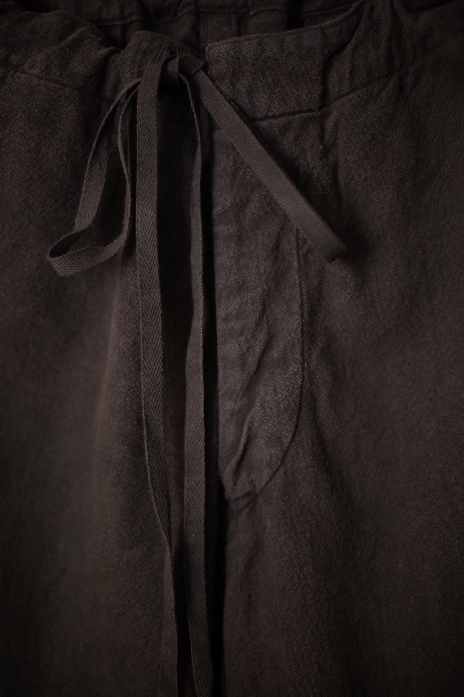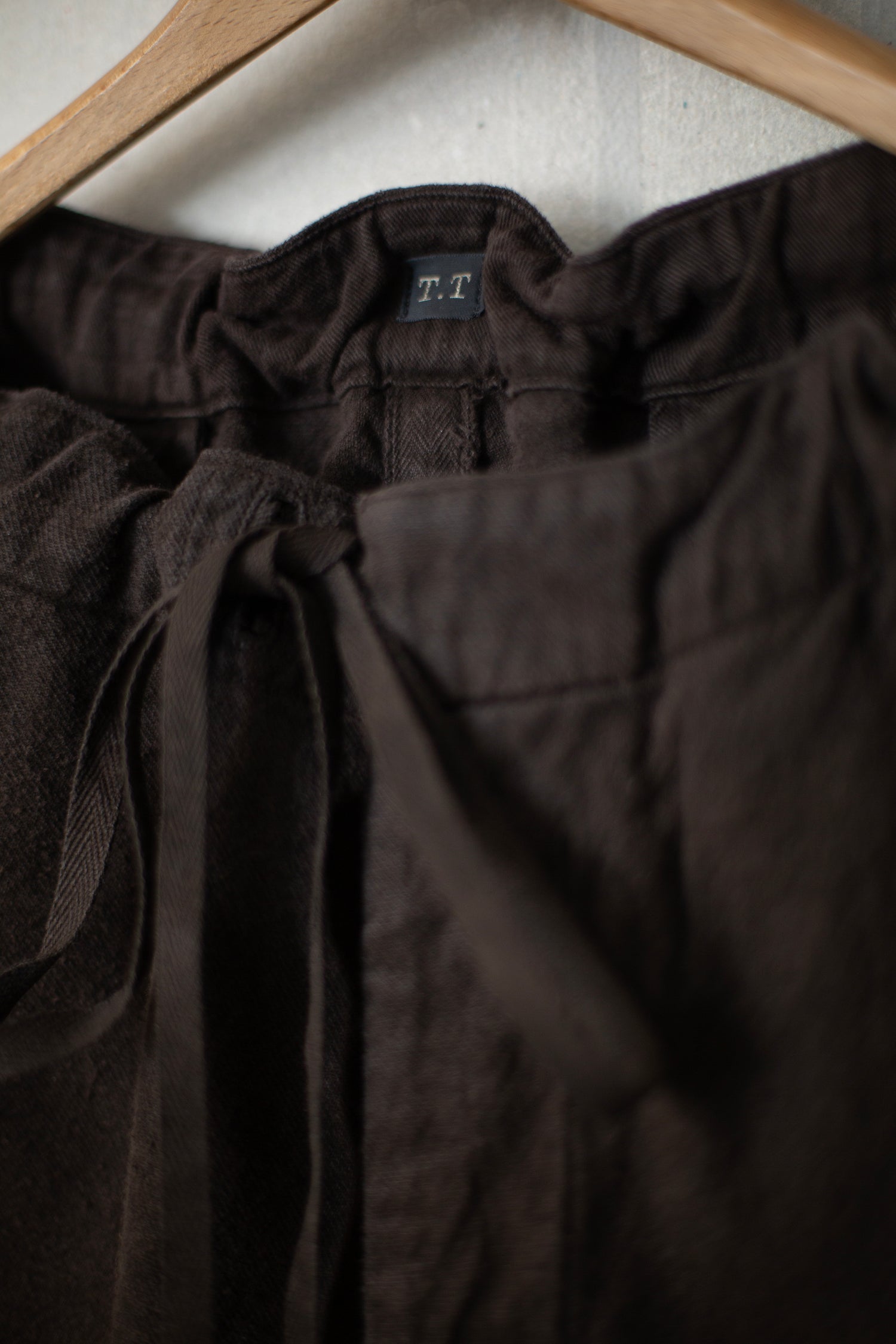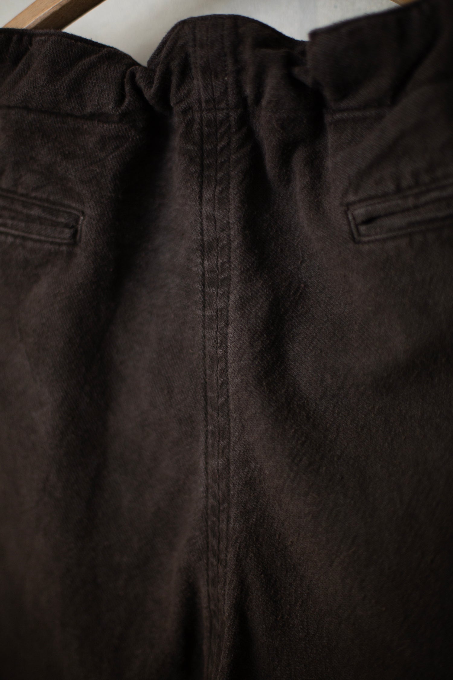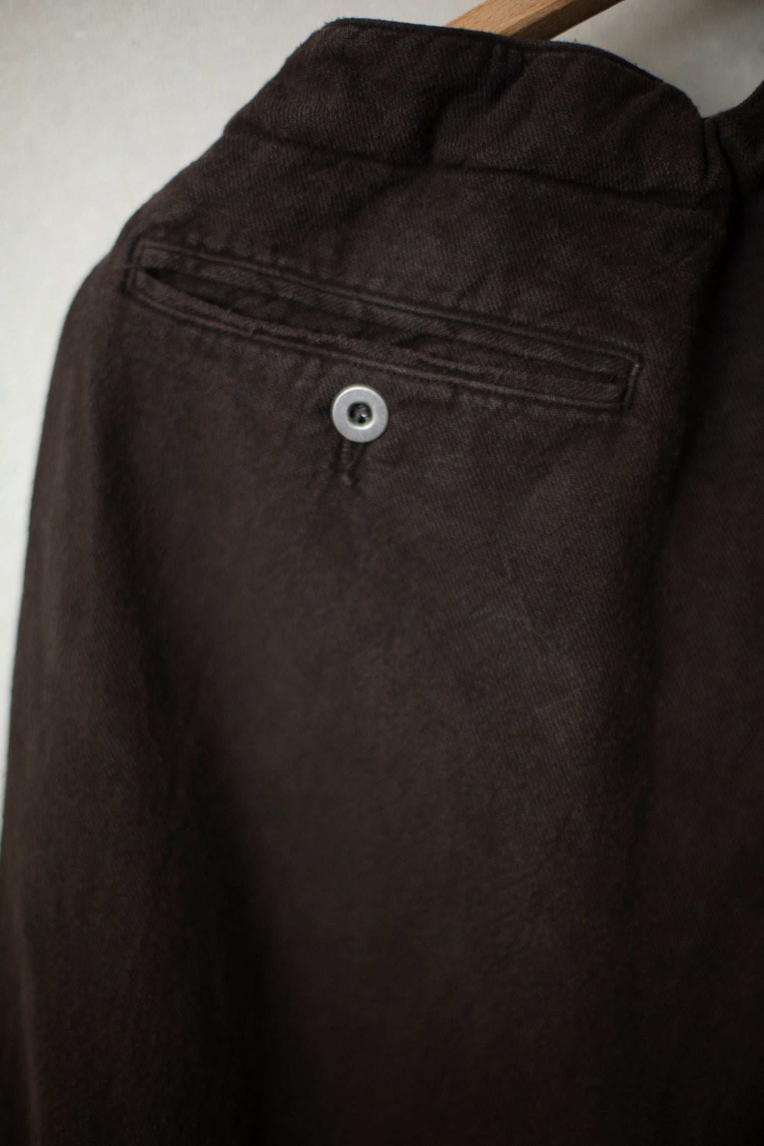 Mud dyed (doro zome) brown hospital trousers by Taiga Takahashi with side pockets, two welt button closure jetted back pockets, metal buttons and ribbon in waist.