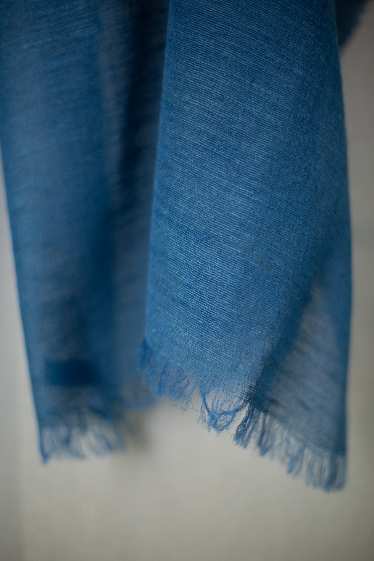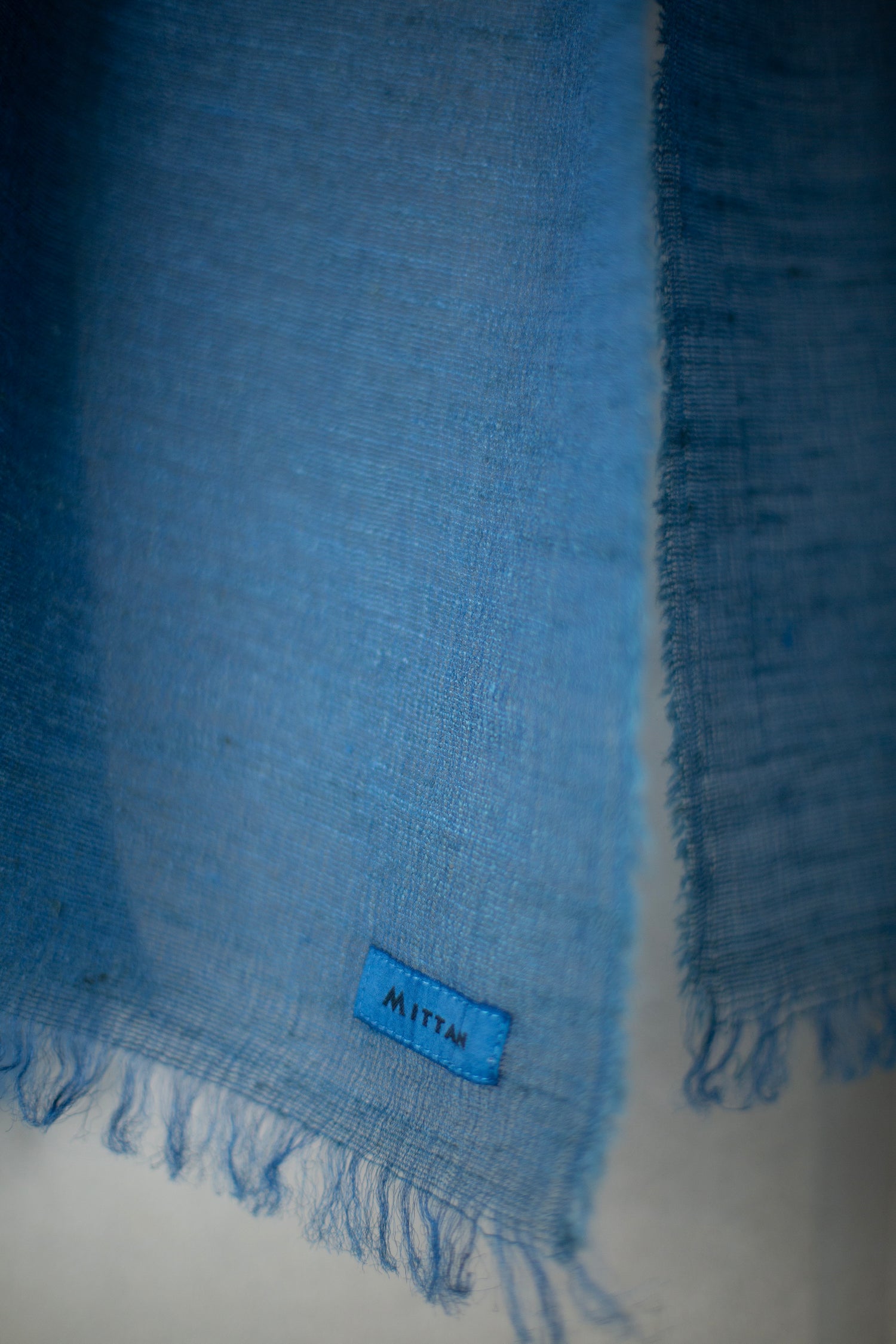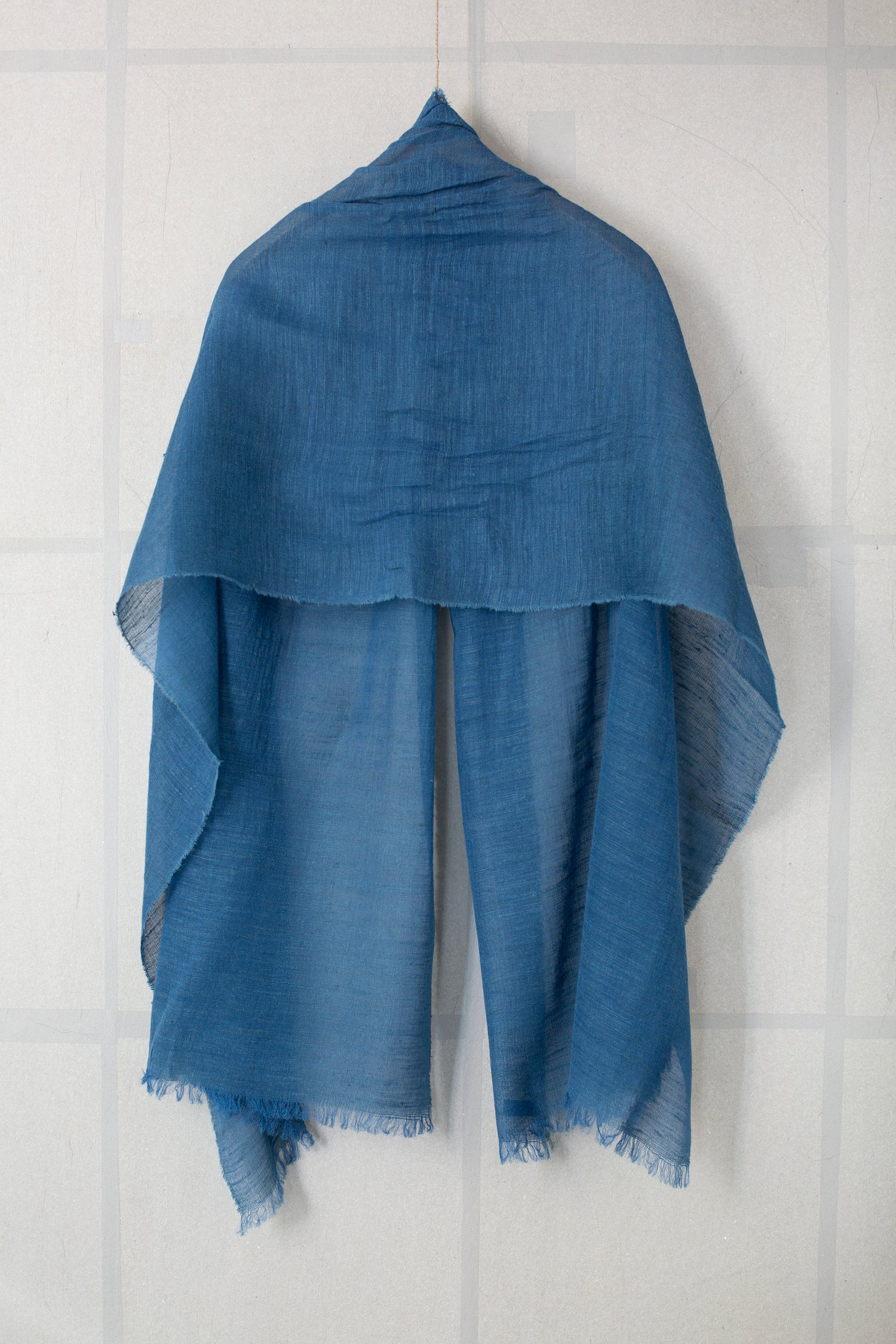 Large lightweight semi sheer silk scarf by Mittan in light natural indigo dye with crisp texture.