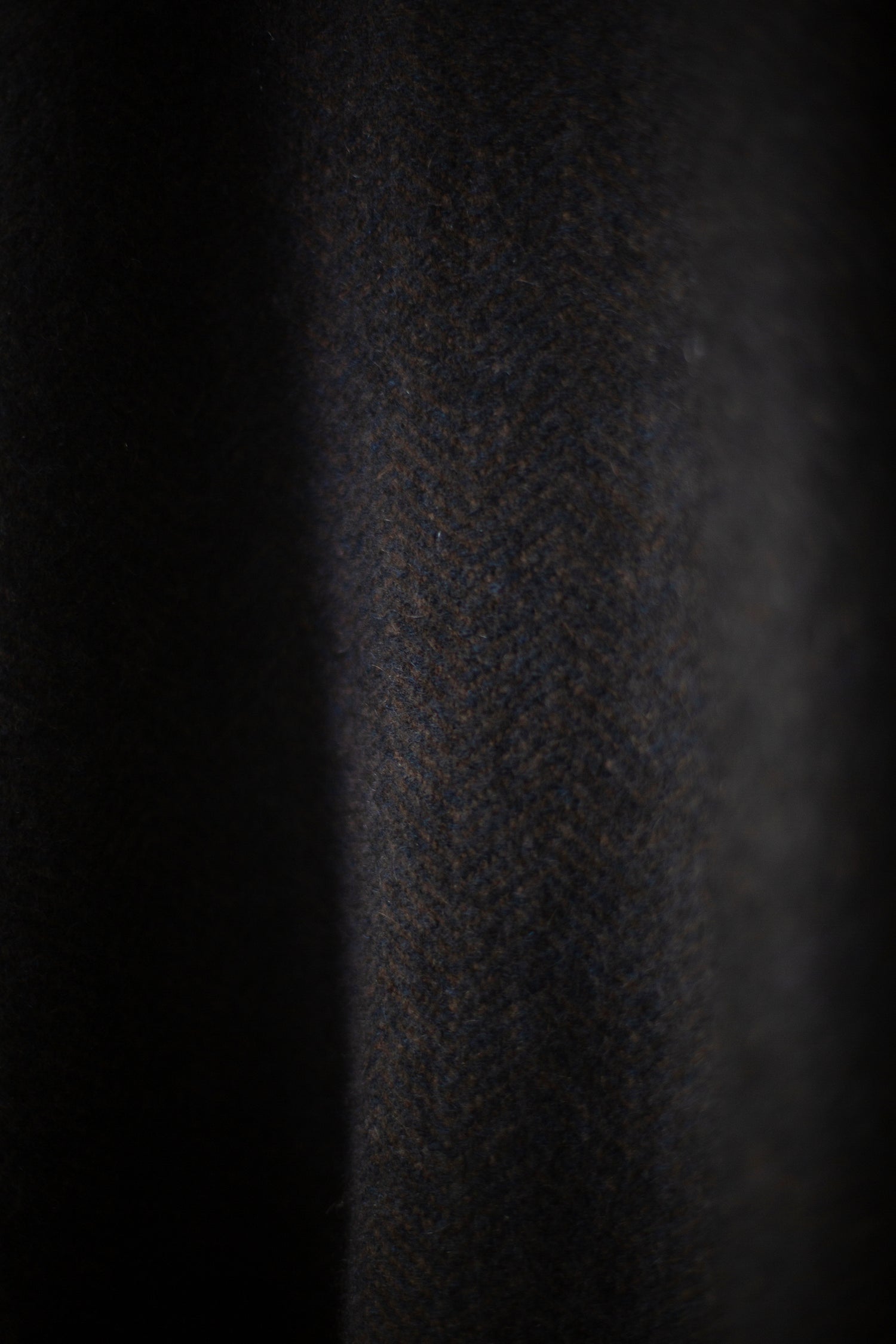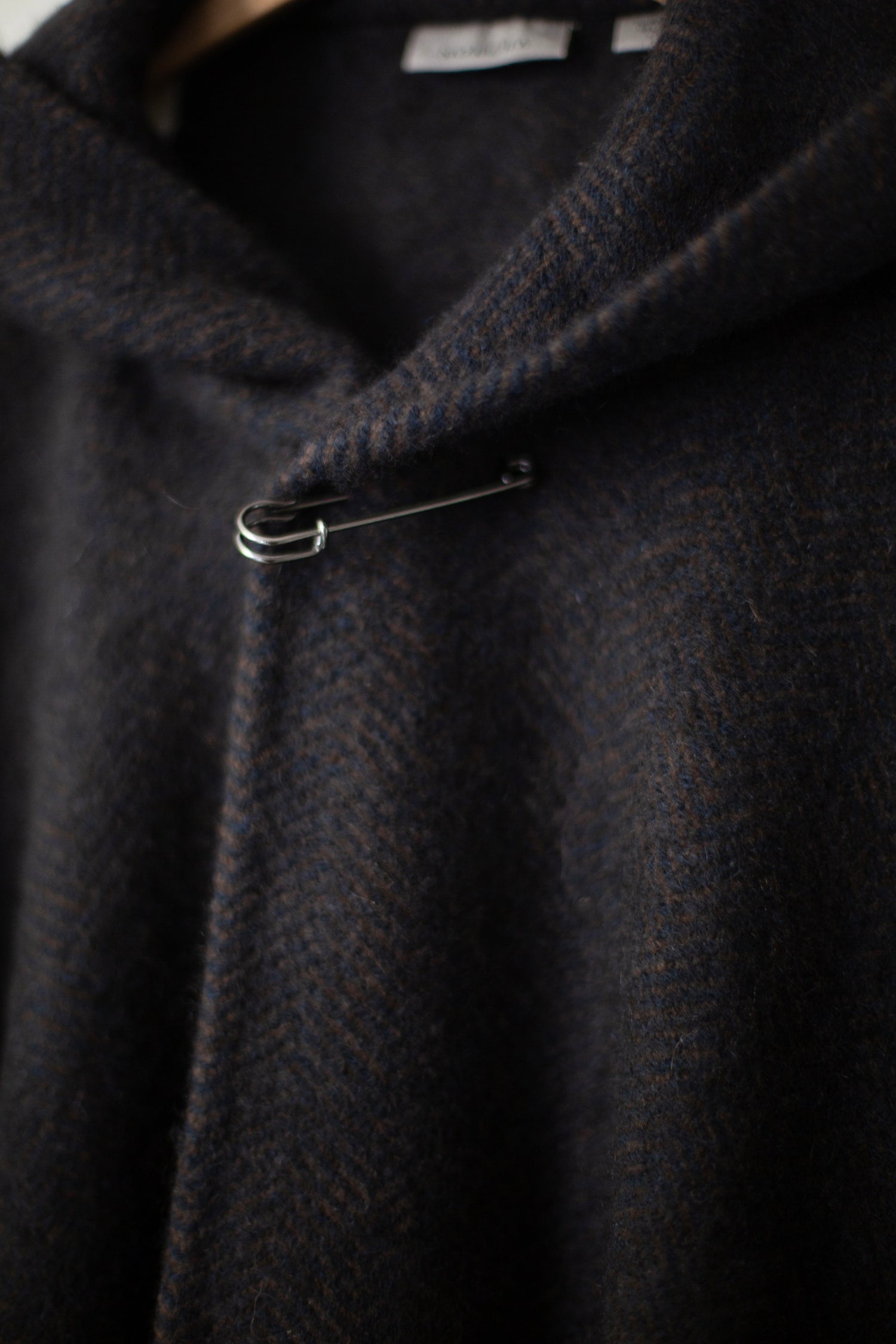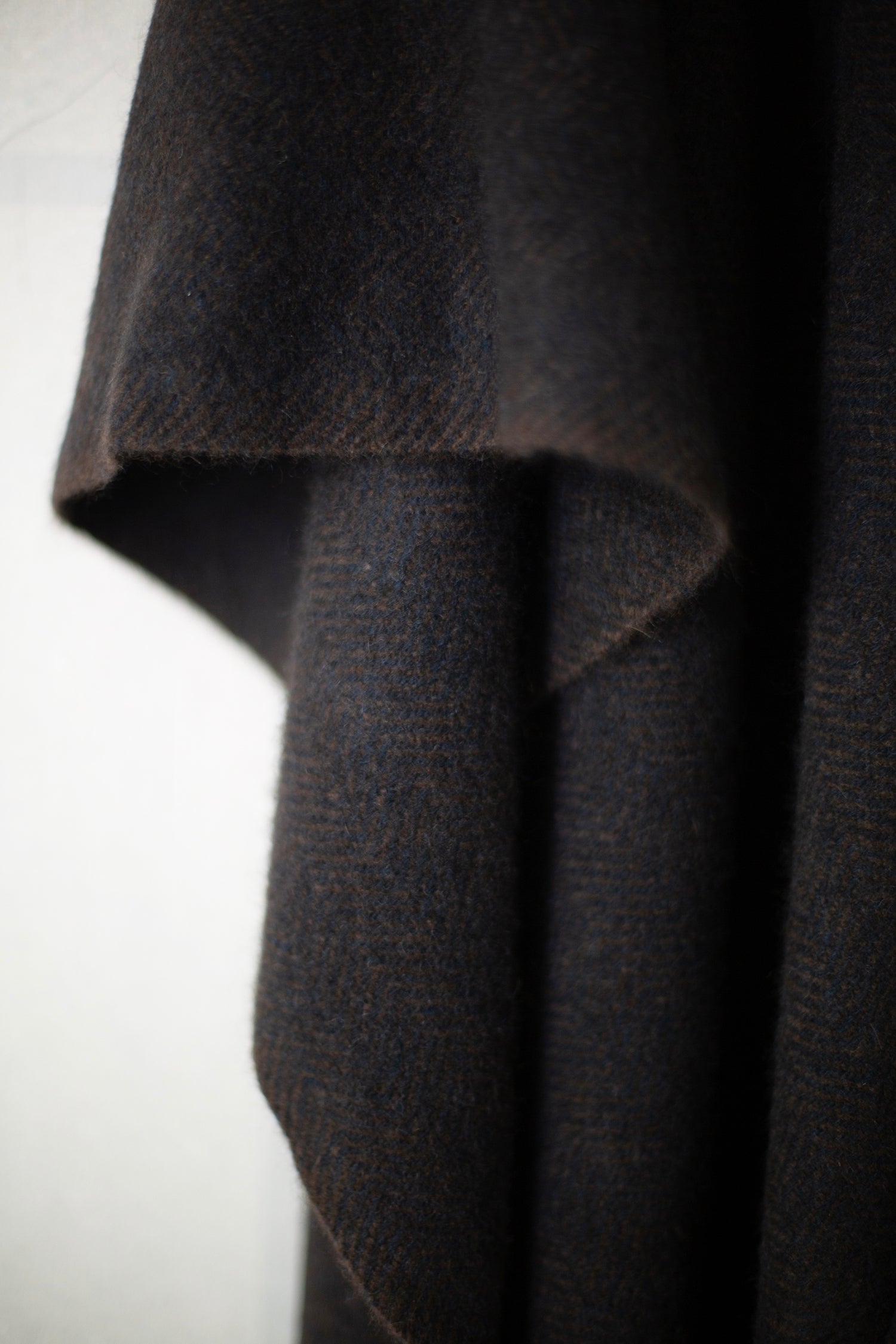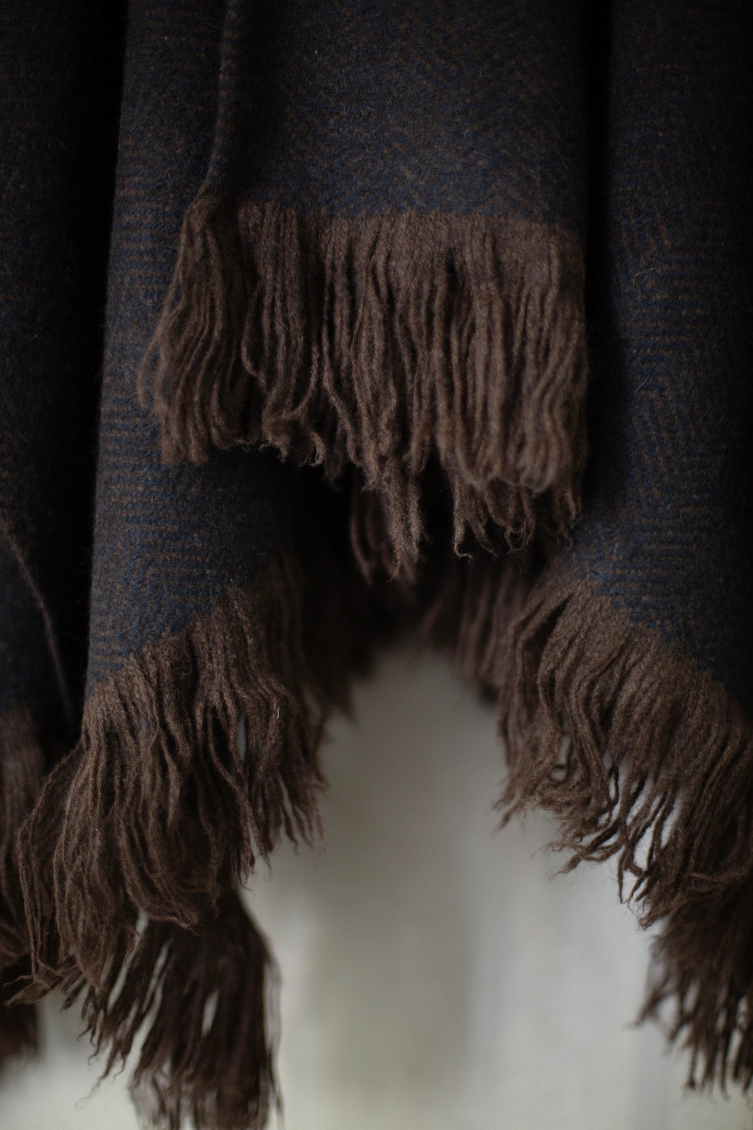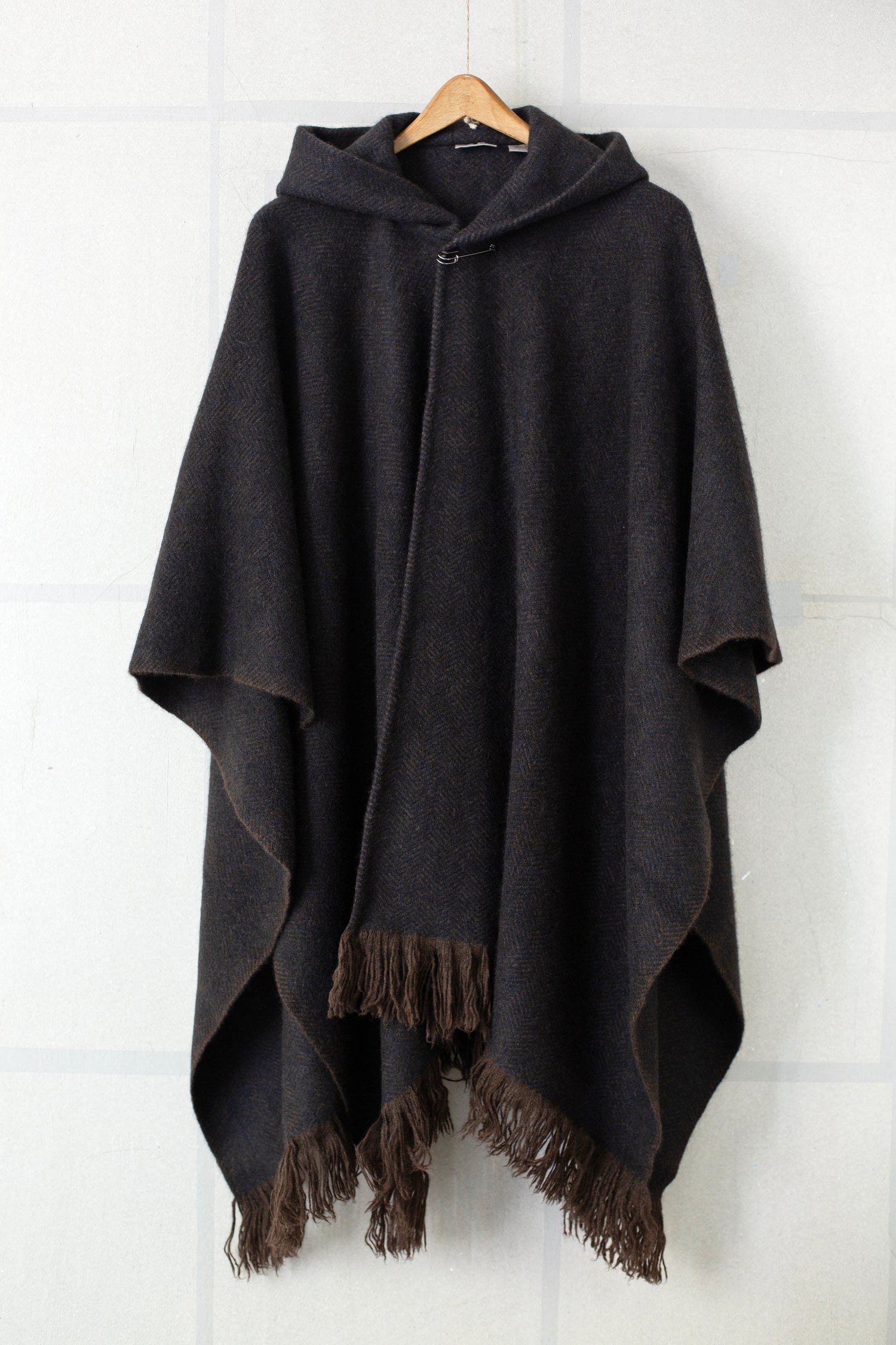 This midweight open-front hooded poncho is made in a pure yak khullu herringbone. It drapes generously over the body with a cropped length for easy wear. The fabric is dense and soft for ultimate winter warmth and comfort.