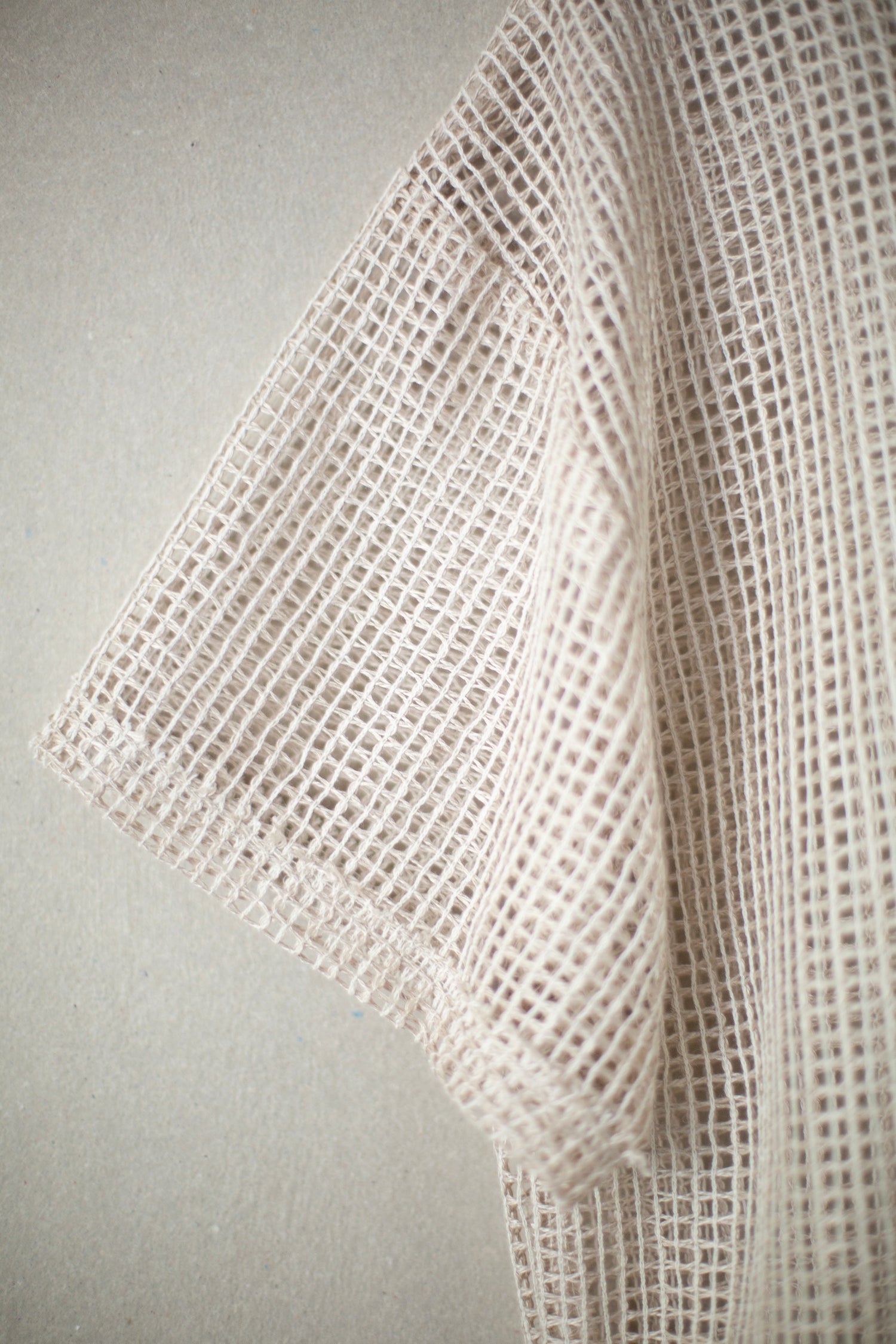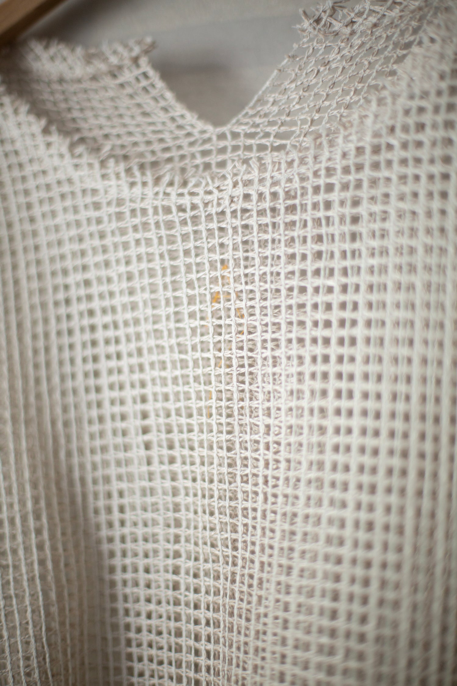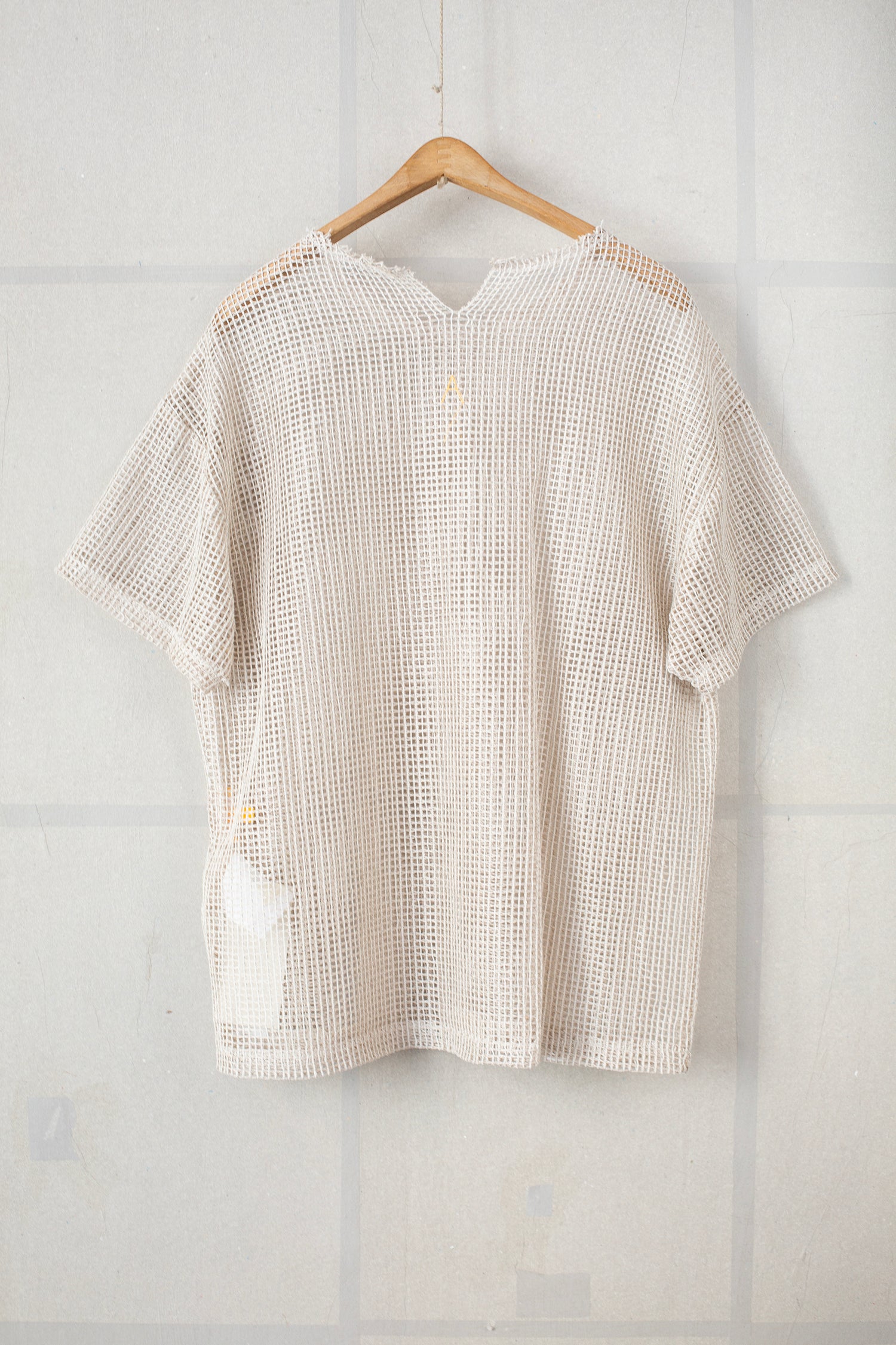 Airy open-netted shortsleeve shirt by AIREI with raw edges around the neck opening and small split in back neck.