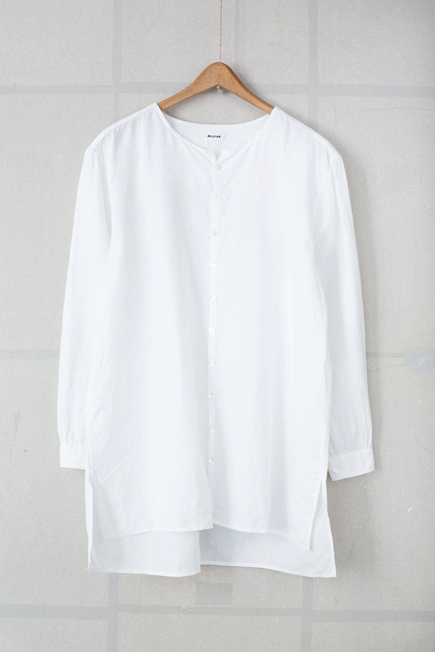 Wide fit no collar shirt in white high density hemp by Mittan with a crisp touch,.