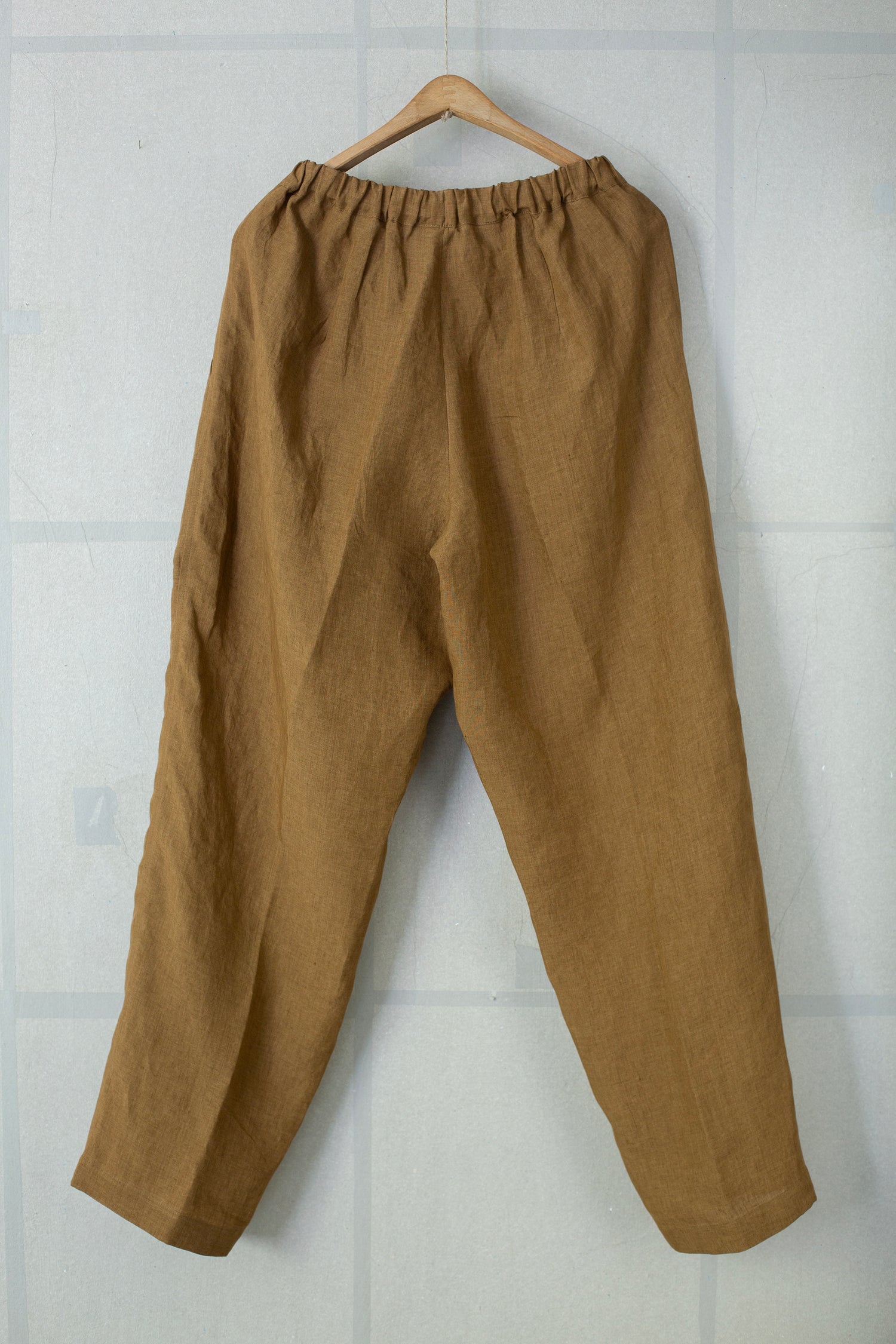 Light trousers by Jurgen Lehl in ochre linen with slit pockets, elasticated waist and ribbon in waist.