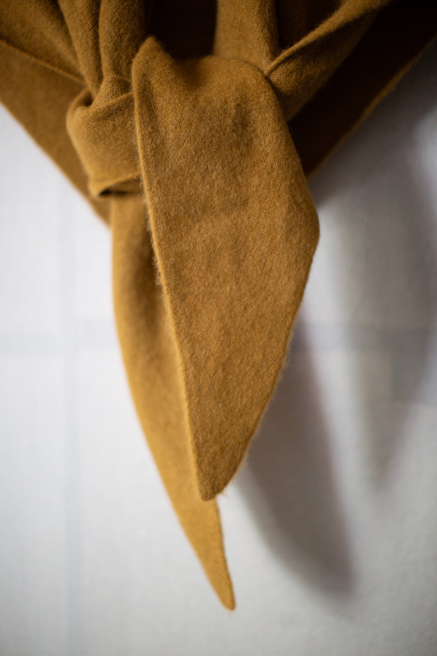Ochre triangle knitted scarf by Jurgen Lehl in yak wool.
