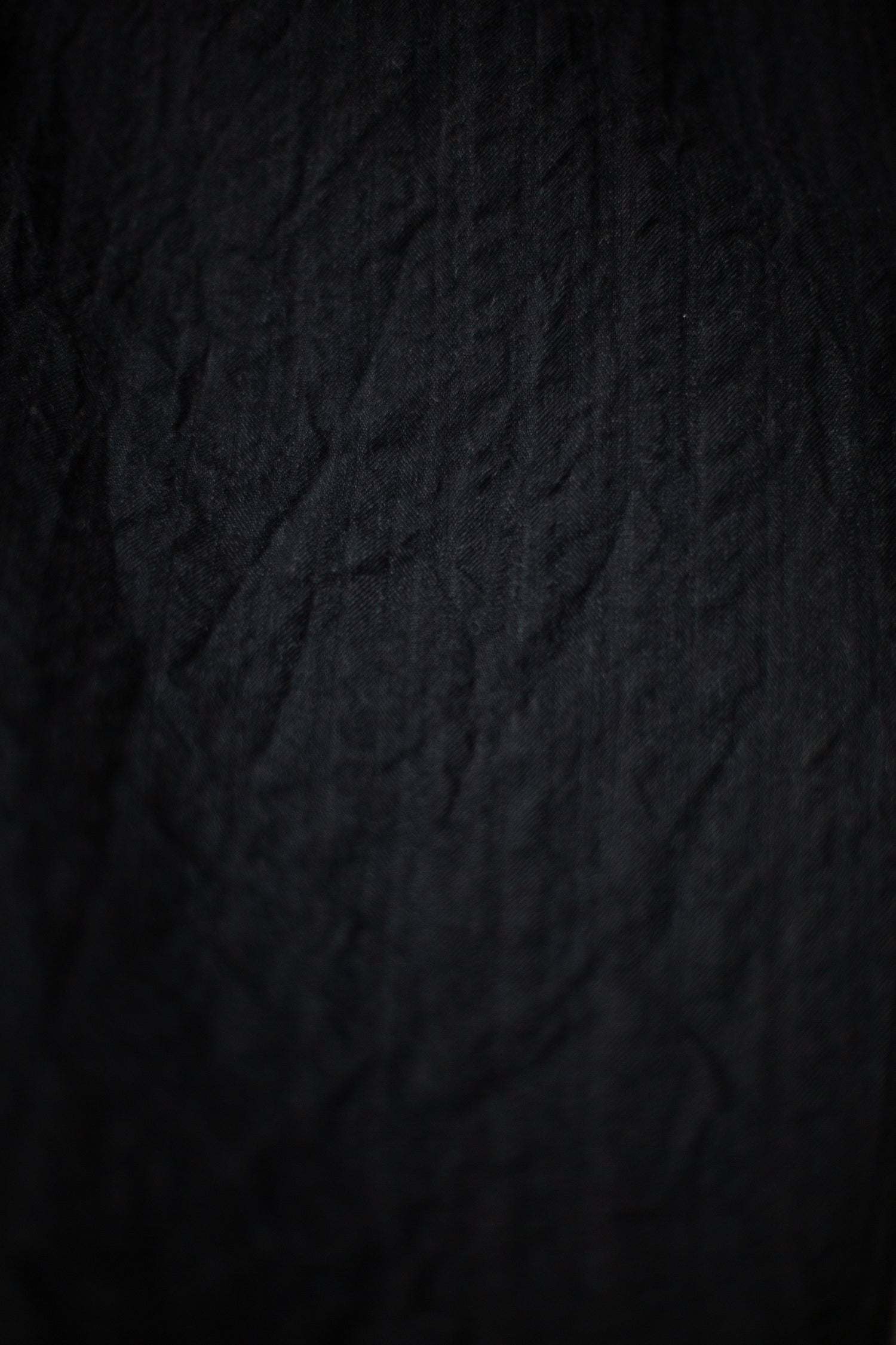 Off black tucked loose pants by Forme D'Expression with two pleats, side pockets, two button closure back pockets, elasticated waist, belt loops, ribbon inside waist and subtle textured stripe pattern.