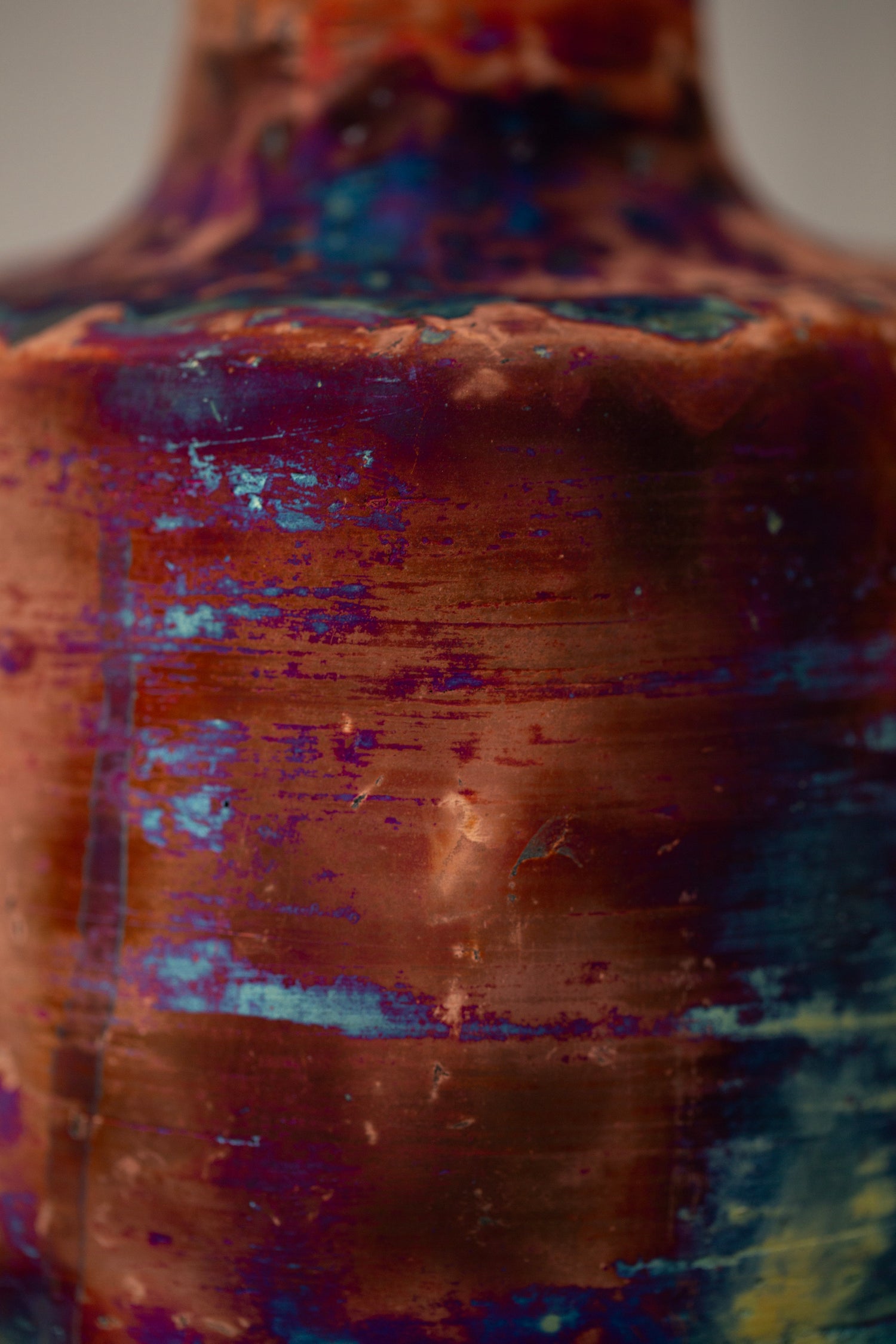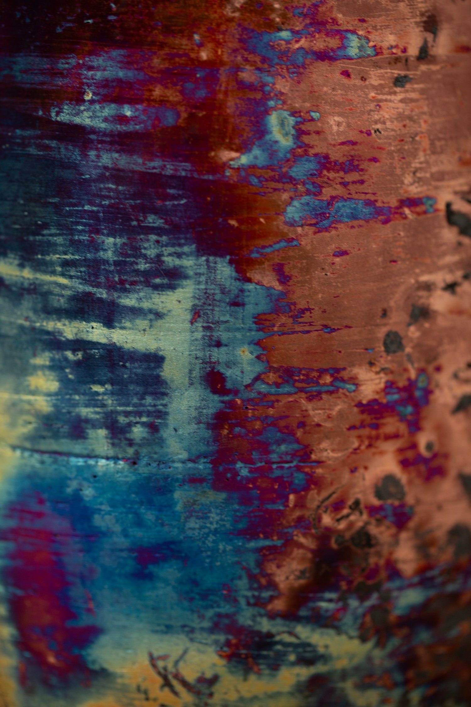 The color is made by the reaction of the metal substance contained in the glaze with ambient air. The glaze is made from Patagonian mountain soil, by letting it ferment during 2-3 months.