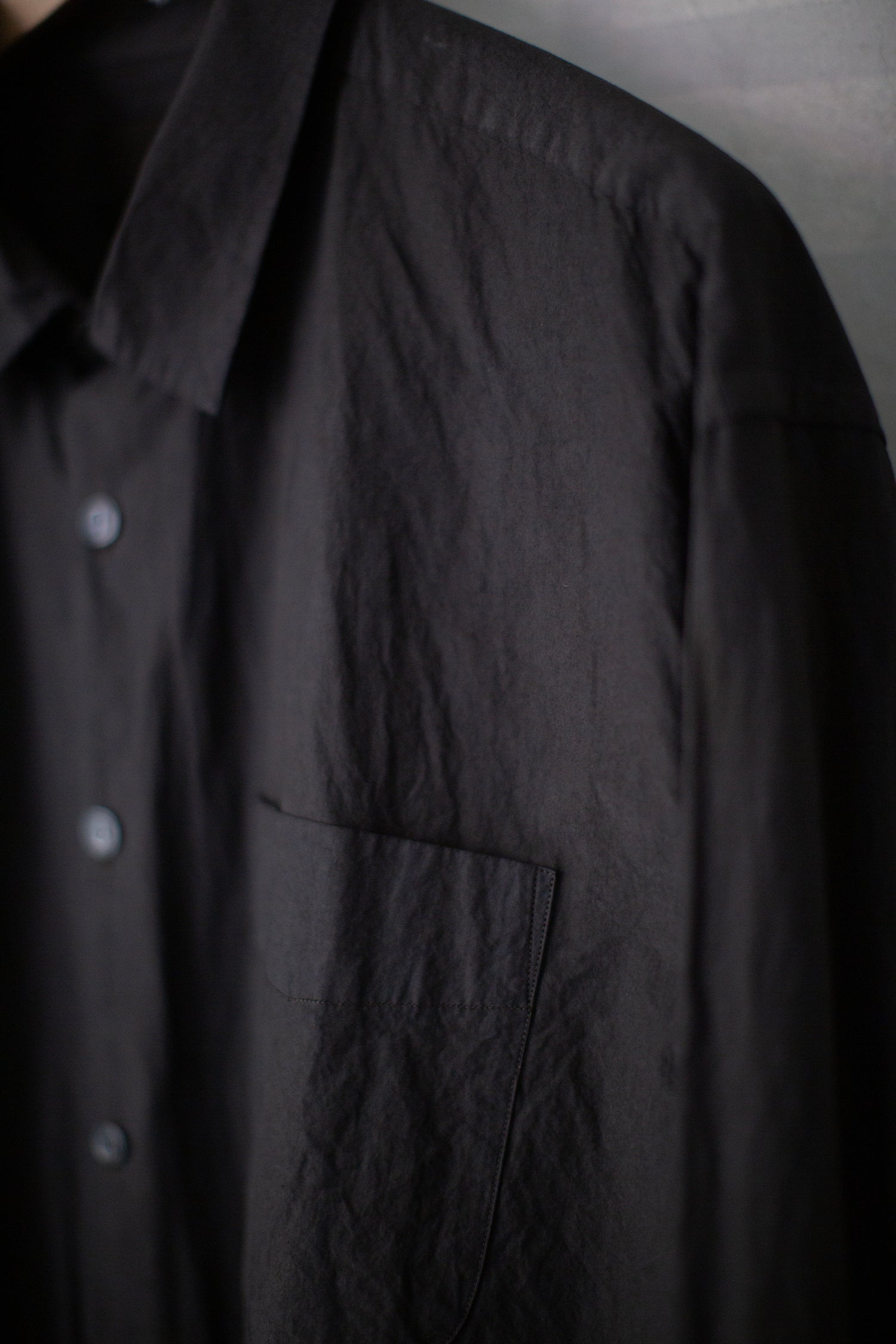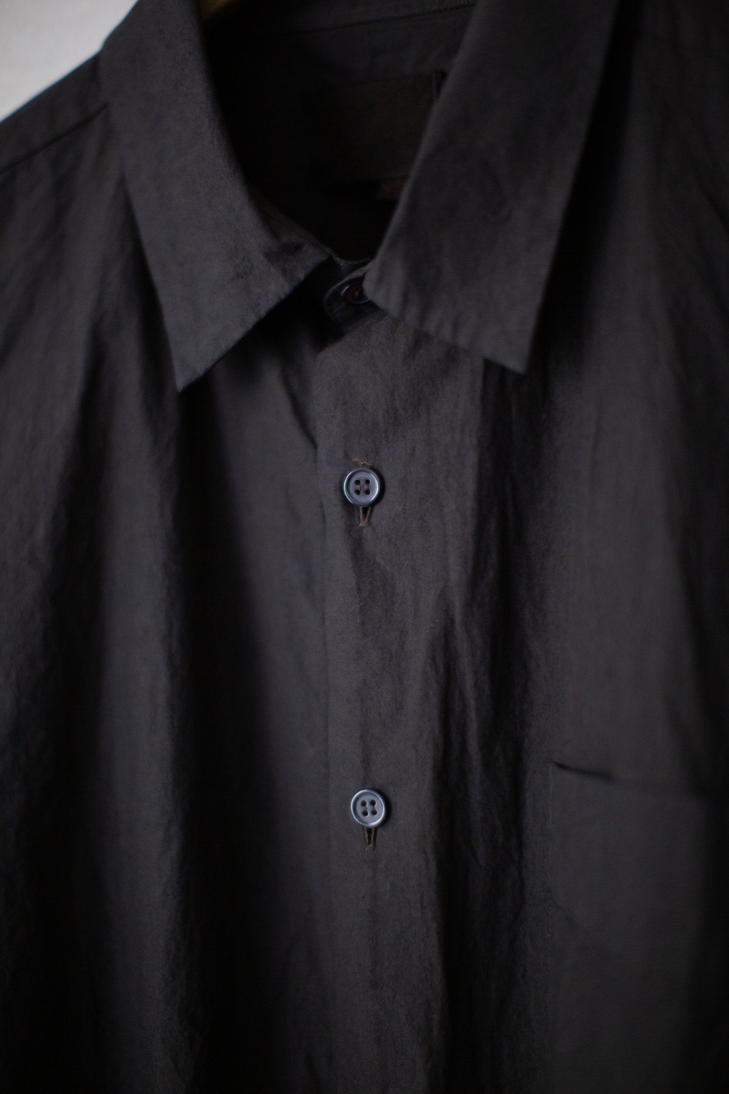 All-season regular collar shirt by Yoko Sakamoto in natural kakishibu (persimmon tannin) dyed max high count typewriter with moderately dropped shoulder line, relaxed fit, patched breast pocket, adjustable sleeve cuffs and two pleats in the back.