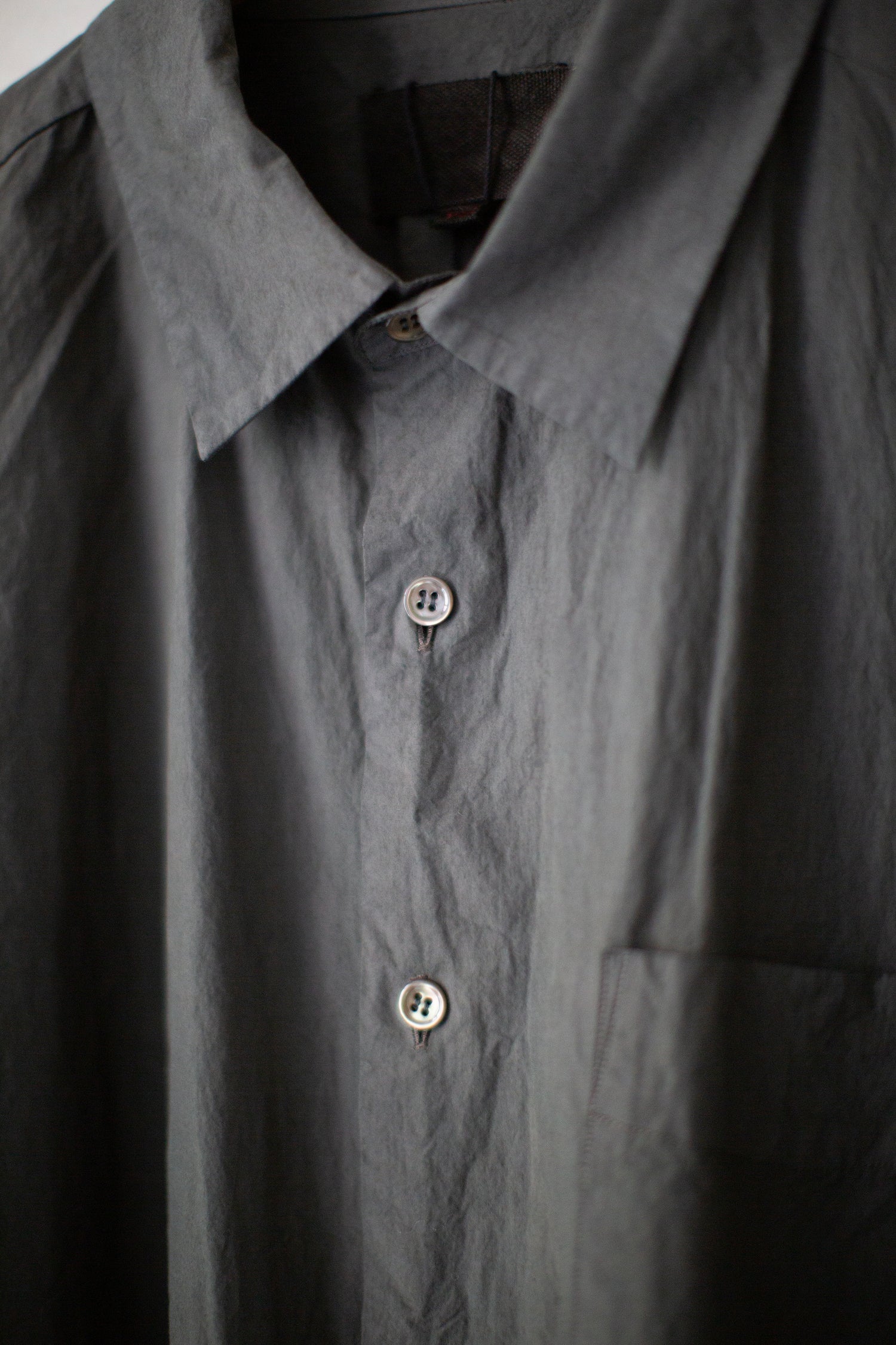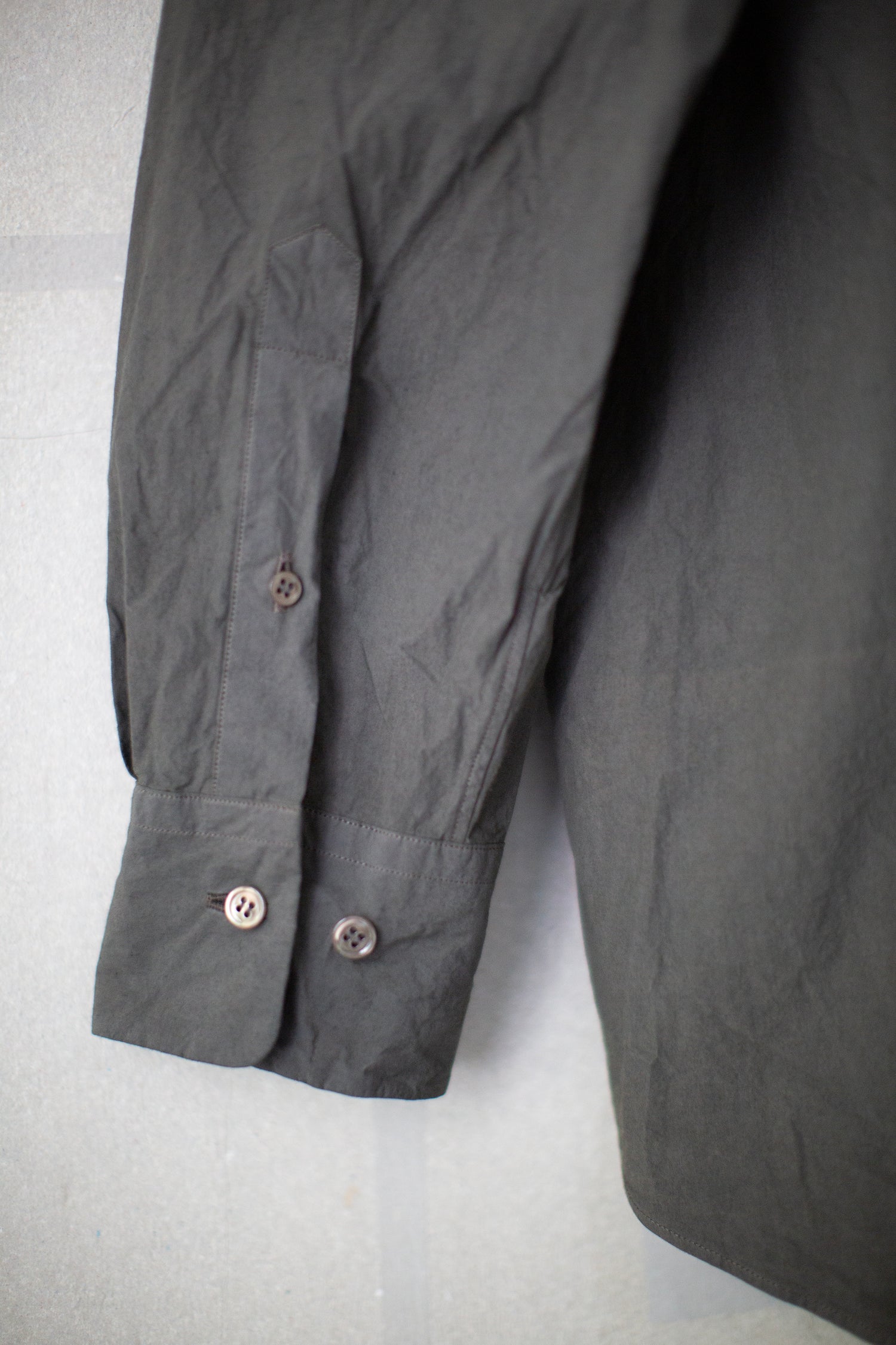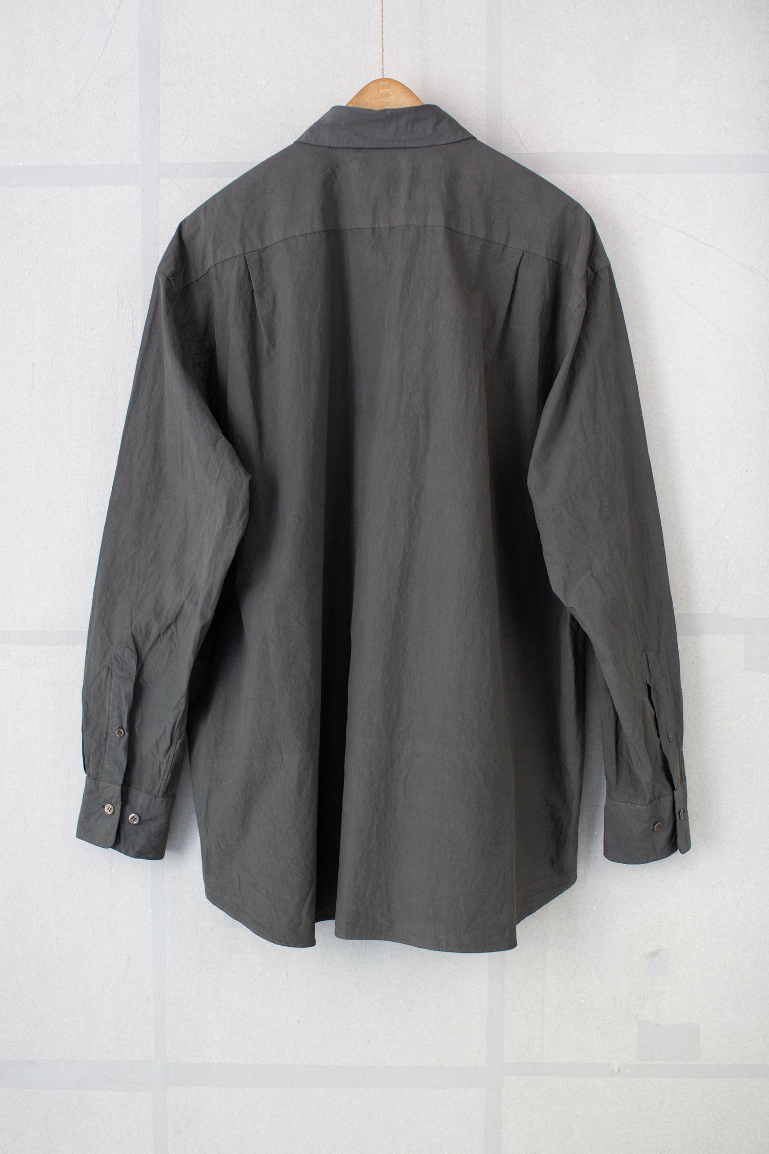All-season regular collar shirt by Yoko Sakamoto in natural zakuro (stone pomegranate) dyed max high count typewriter with moderately dropped shoulder line, relaxed fit, patched breast pocket, adjustable sleeve cuffs and two pleats in the back.
