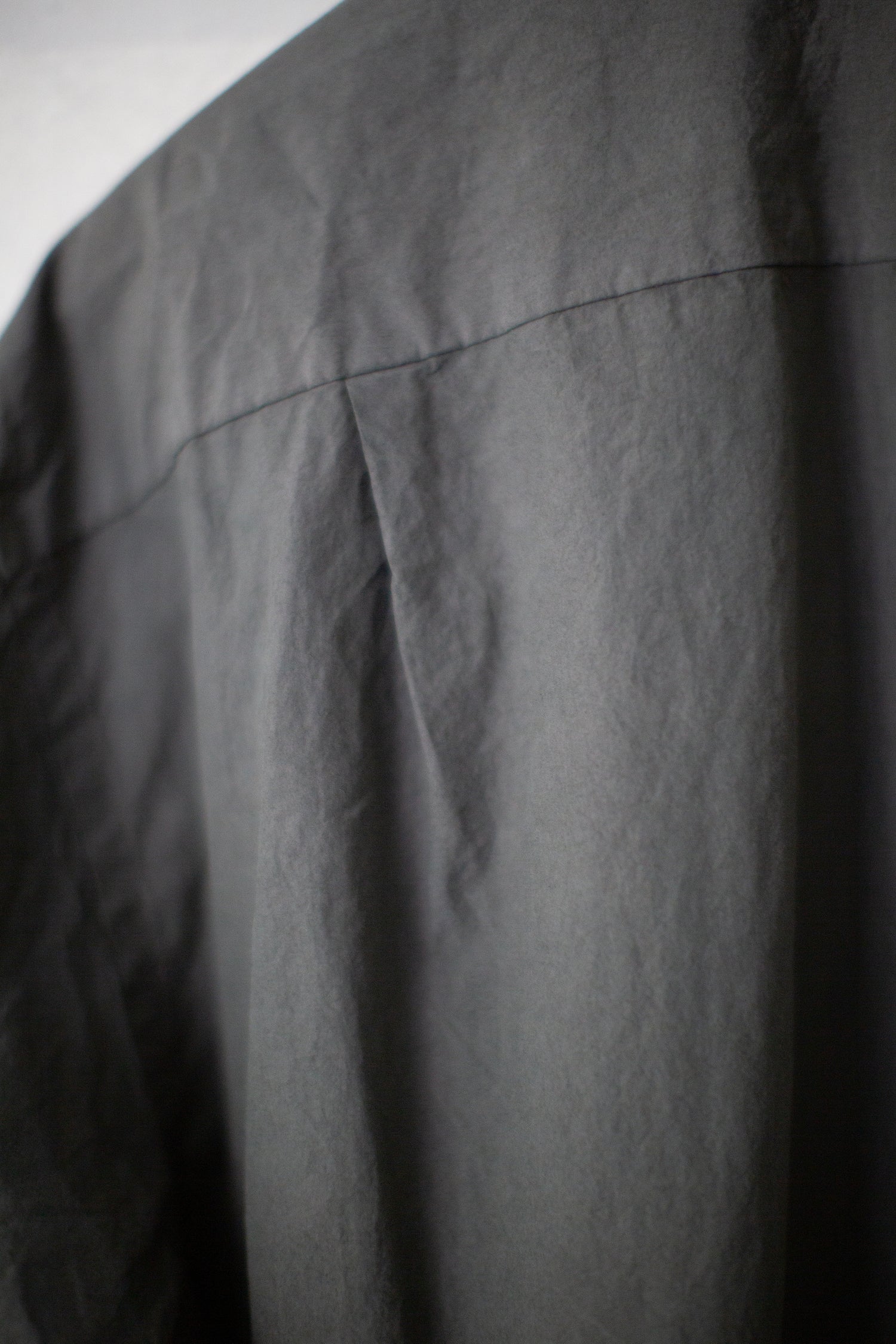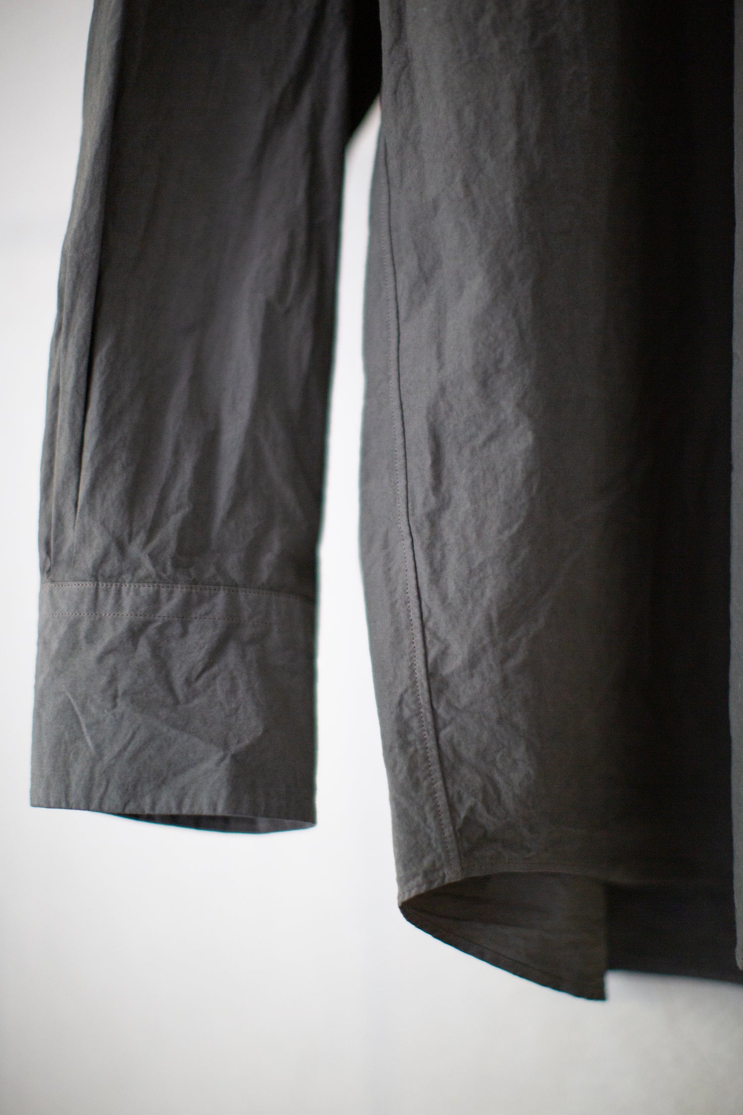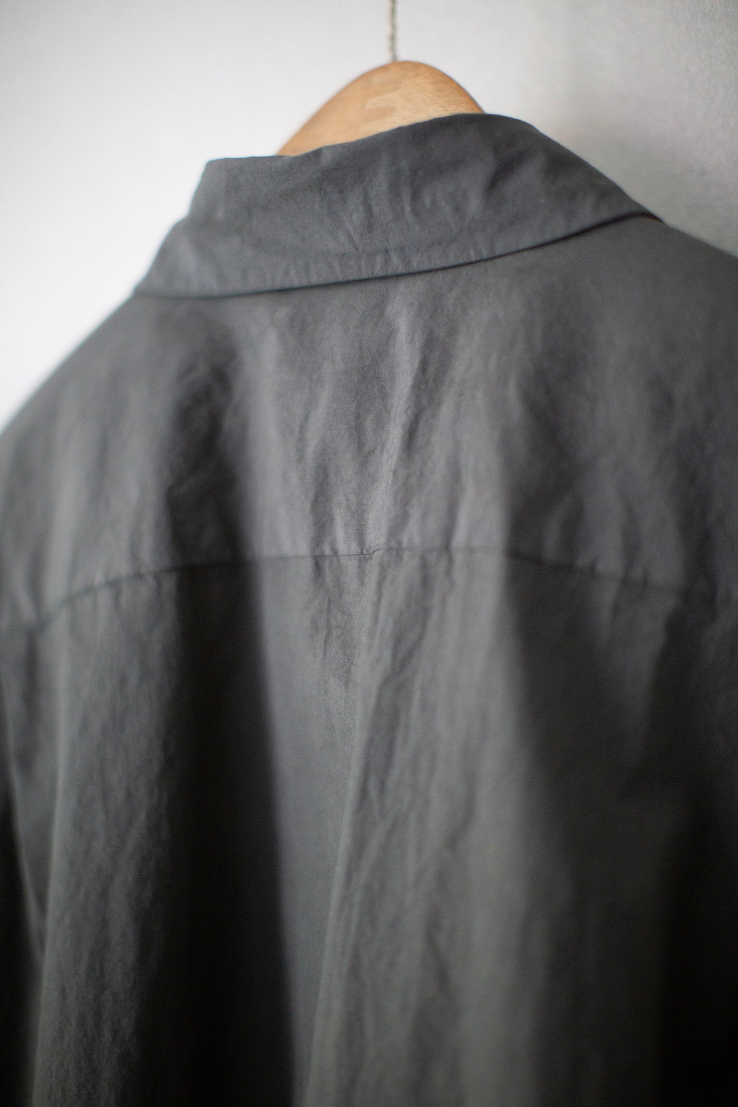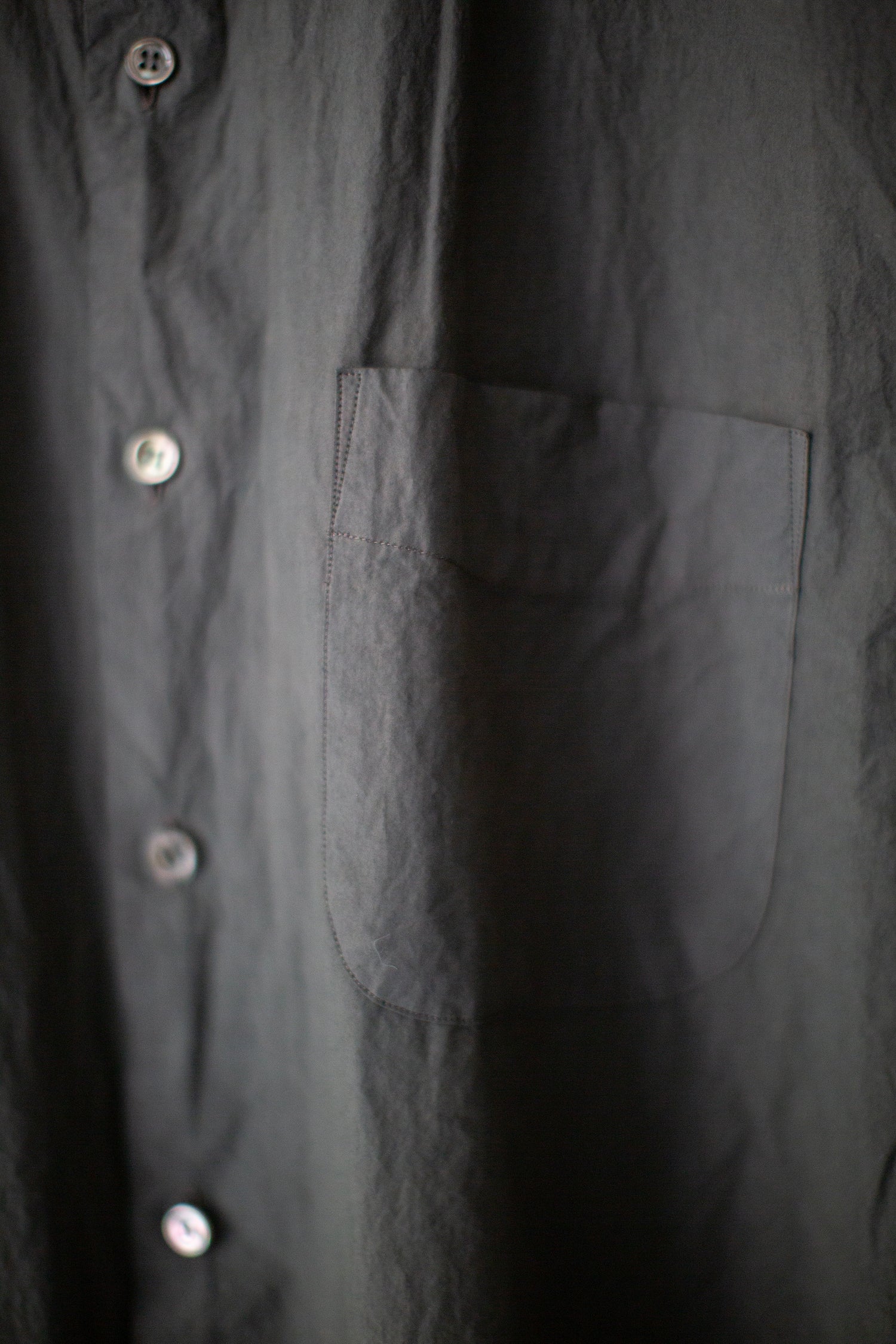 All-season regular collar shirt by Yoko Sakamoto in natural zakuro (stone pomegranate) dyed max high count typewriter with moderately dropped shoulder line, relaxed fit, patched breast pocket, adjustable sleeve cuffs and two pleats in the back.