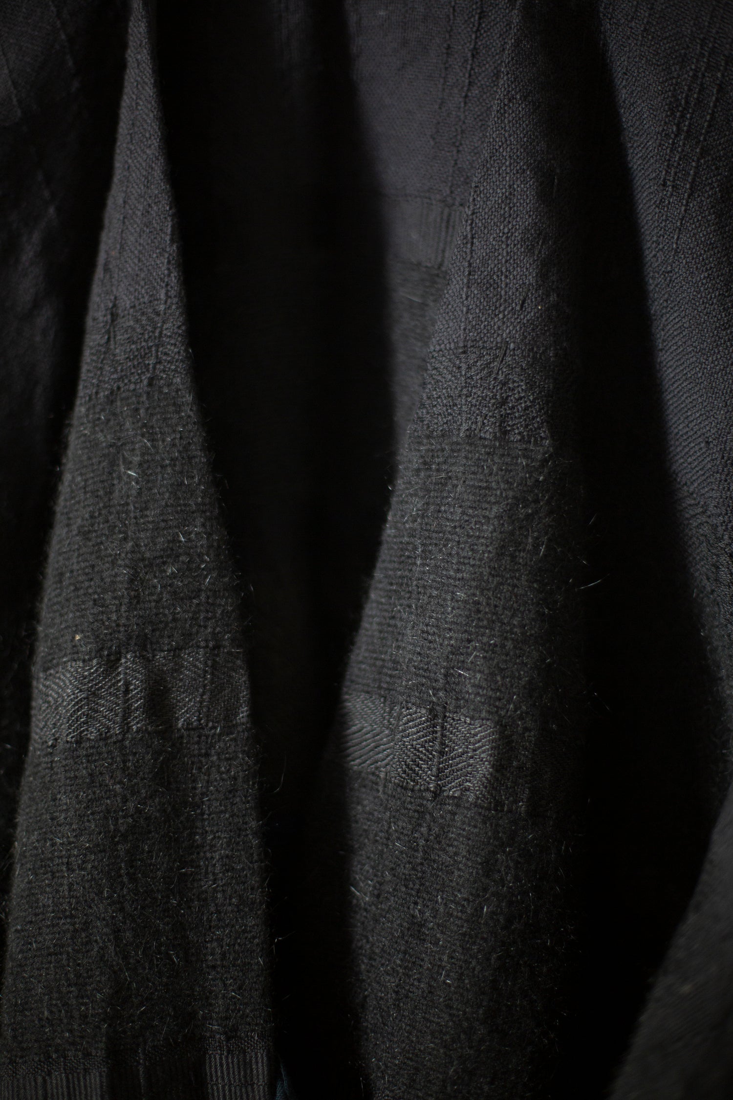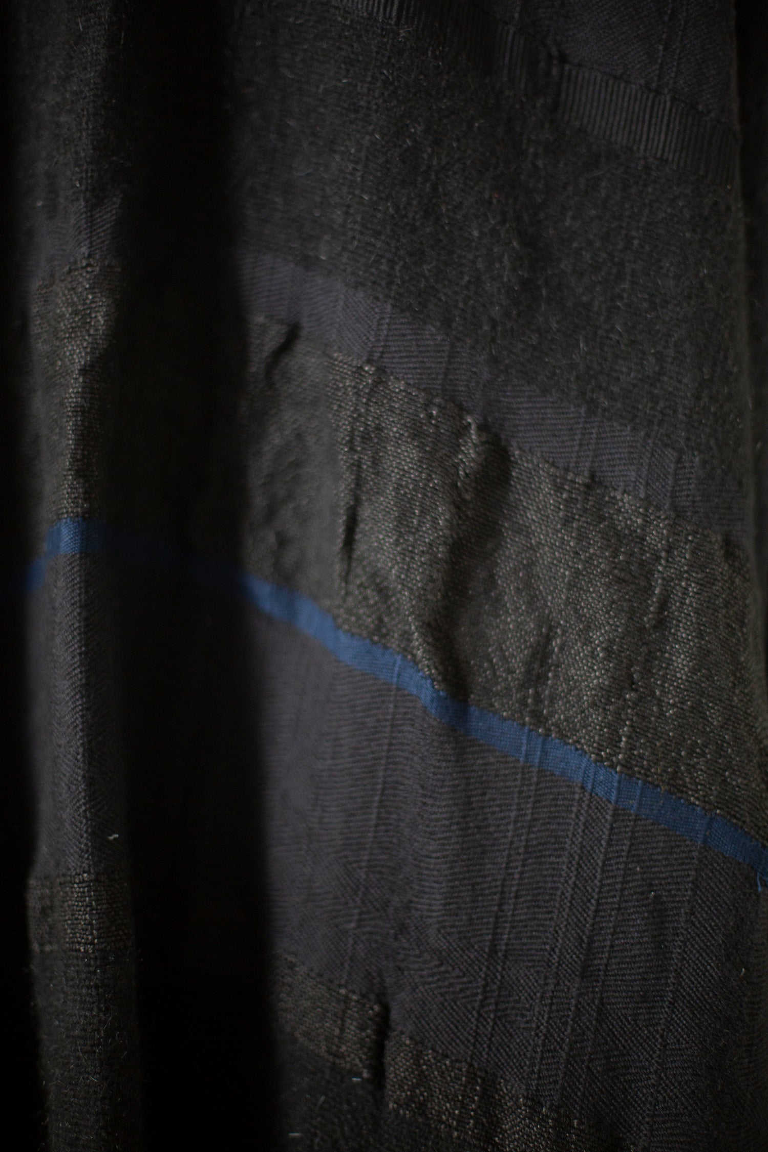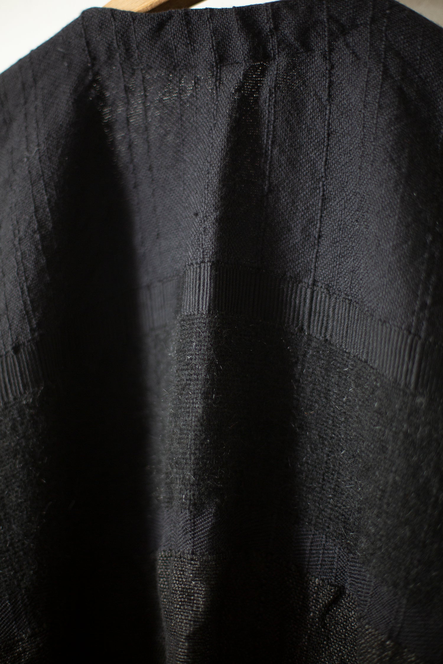 A kimono light weight coat, fully hand woven in merino wool, antique japanese silk & cotton and possum fiber on a cotton warp. The sleeves are made from linen and merino wool woven in crepe and have underarm openings at the connection with the body.