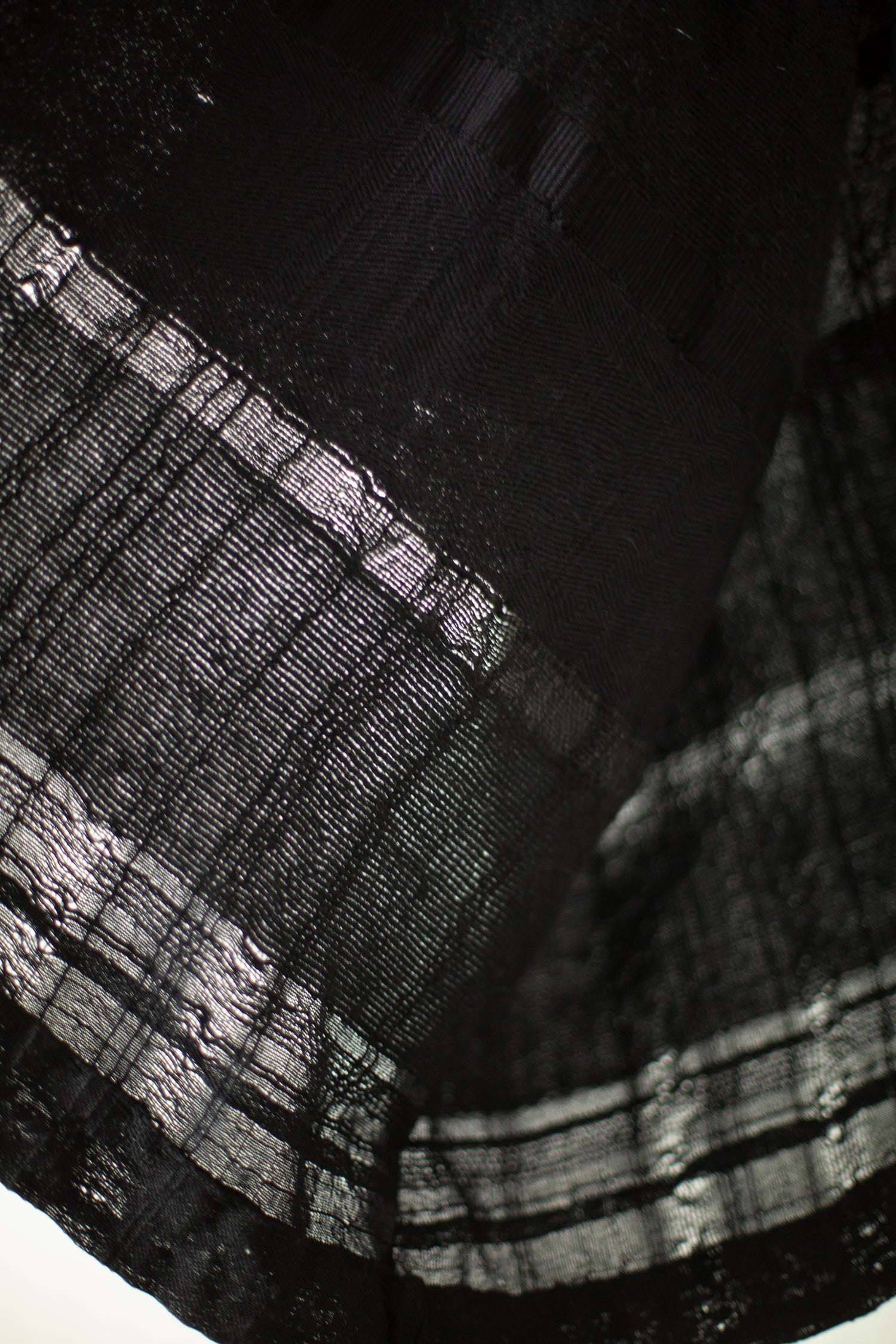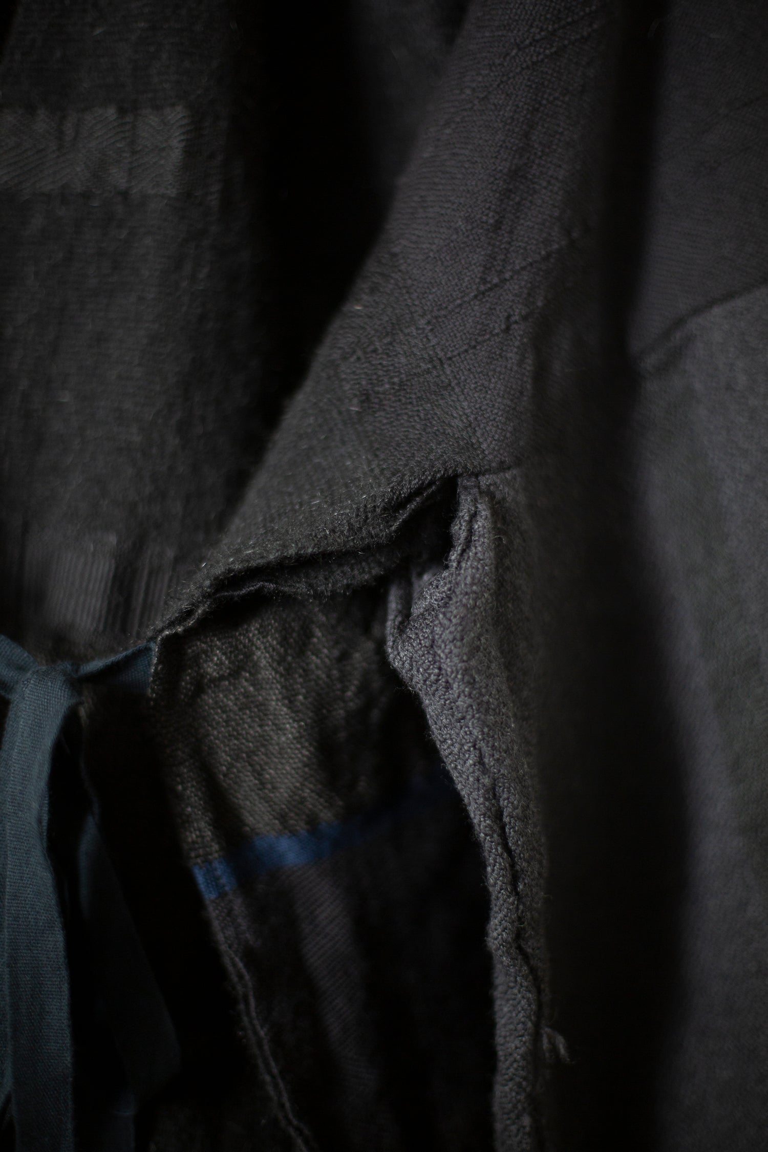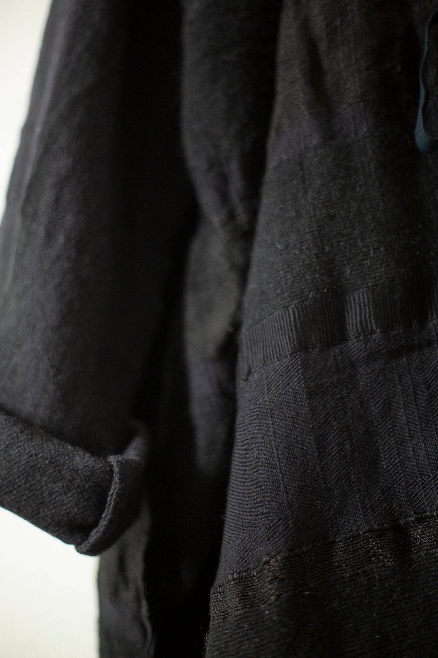 A kimono light weight coat, fully hand woven in merino wool, antique japanese silk & cotton and possum fiber on a cotton warp. The sleeves are made from linen and merino wool woven in crepe and have underarm openings at the connection with the body.