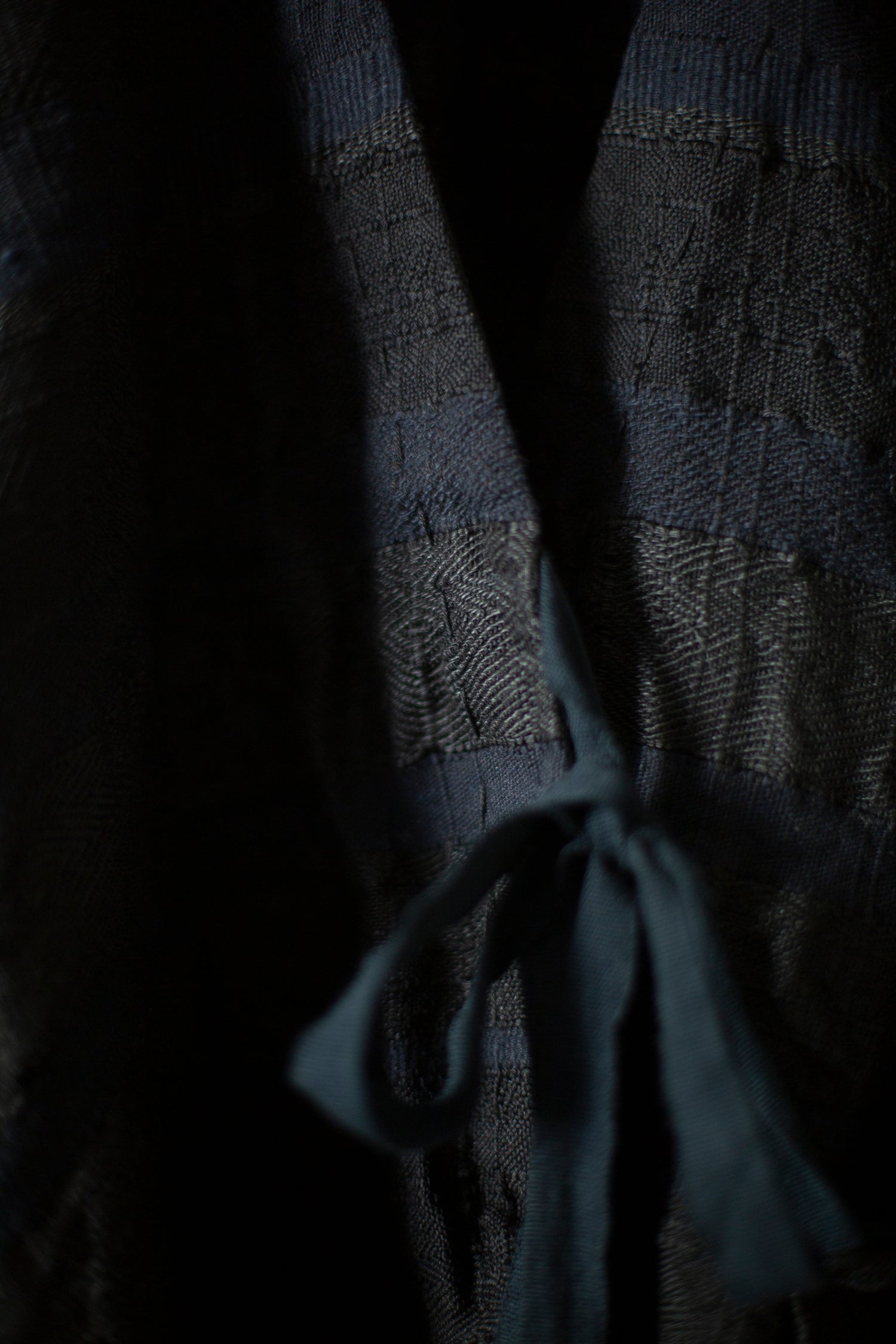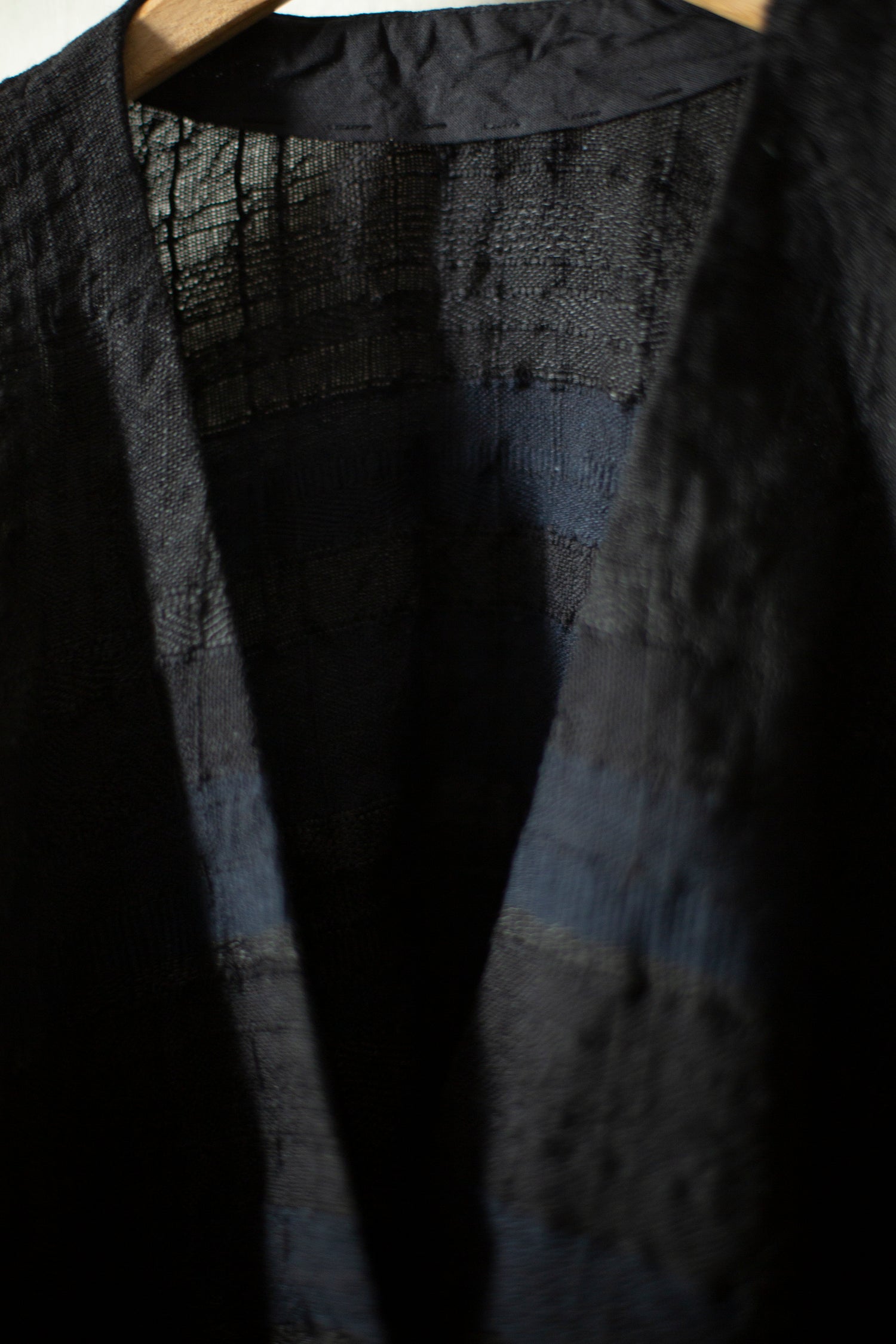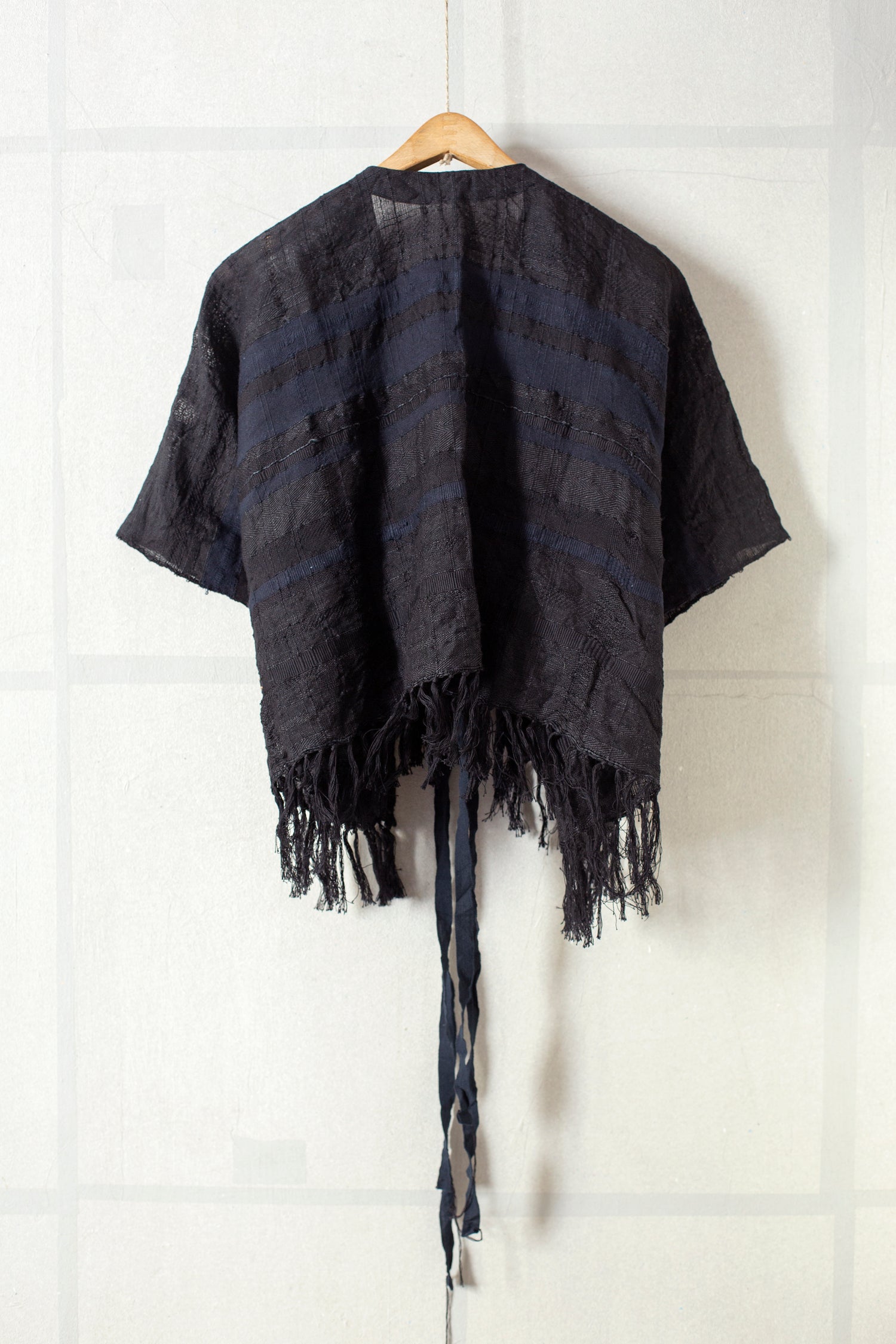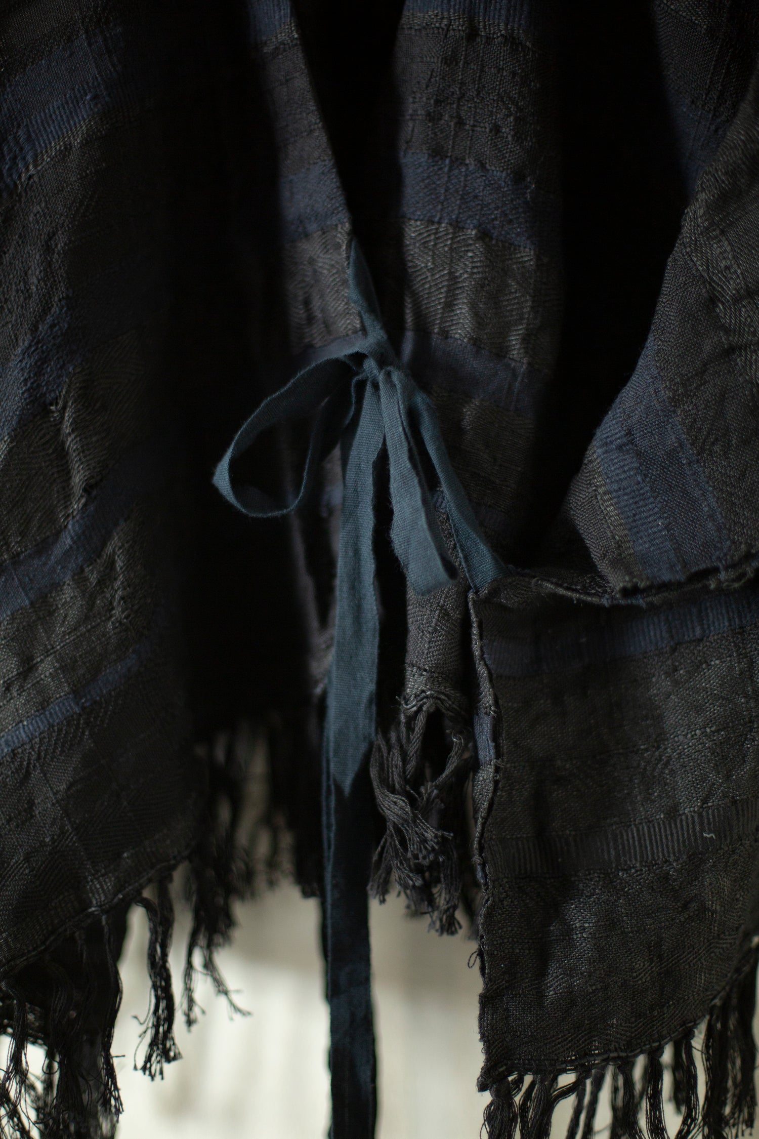 This cropped kimono vest is woven through a warp of cotton with wefts of linen, cotton, antique japanese silk and jute. Small soumak detail in silk. The neckline and hem are finished by hand. The ties are made with cotton tape. Varying weave structures create a rhythm throughout the textile.