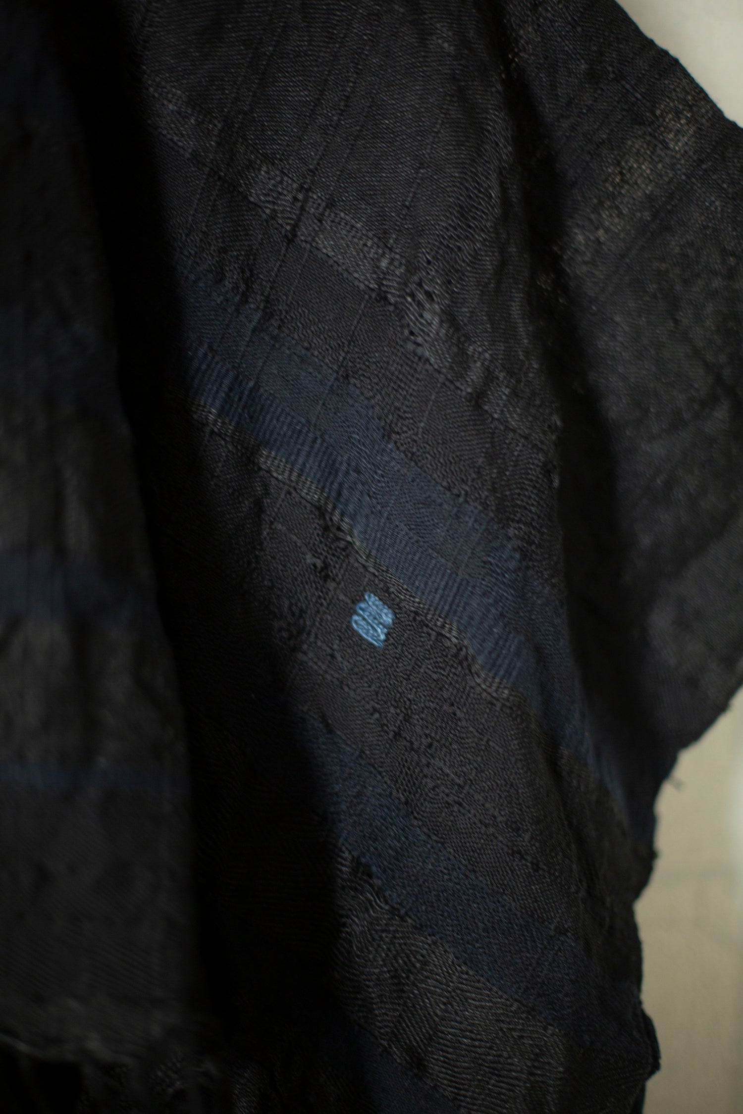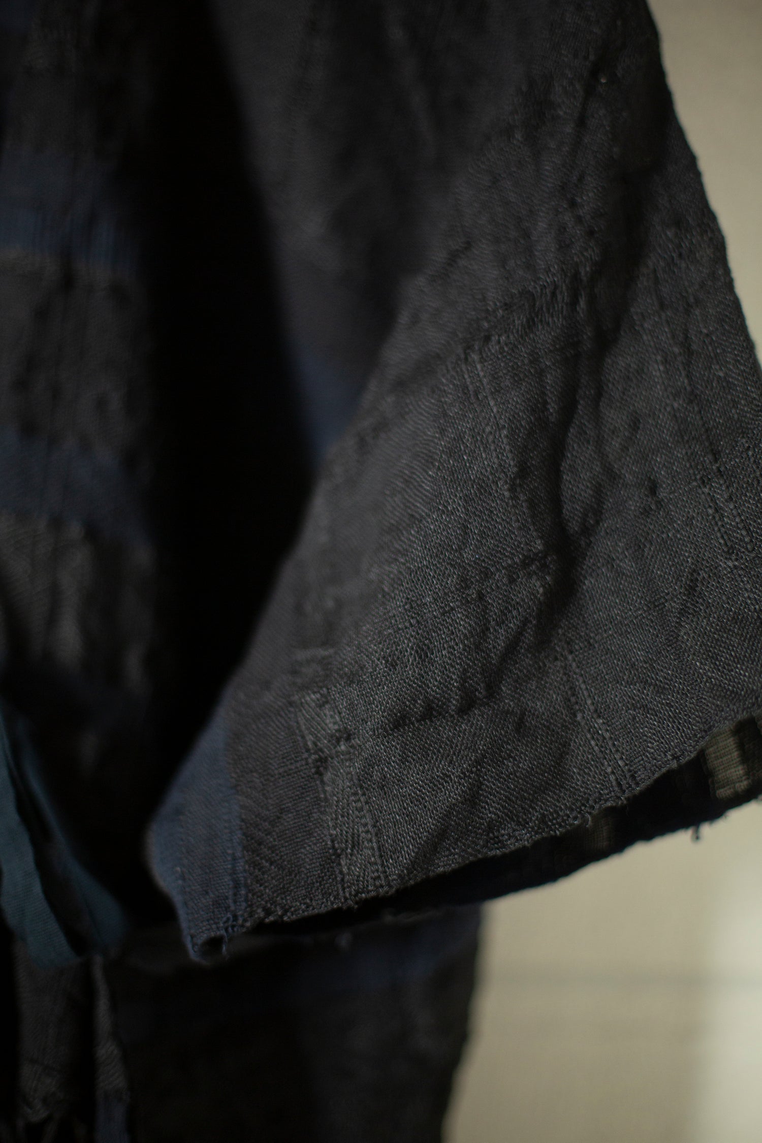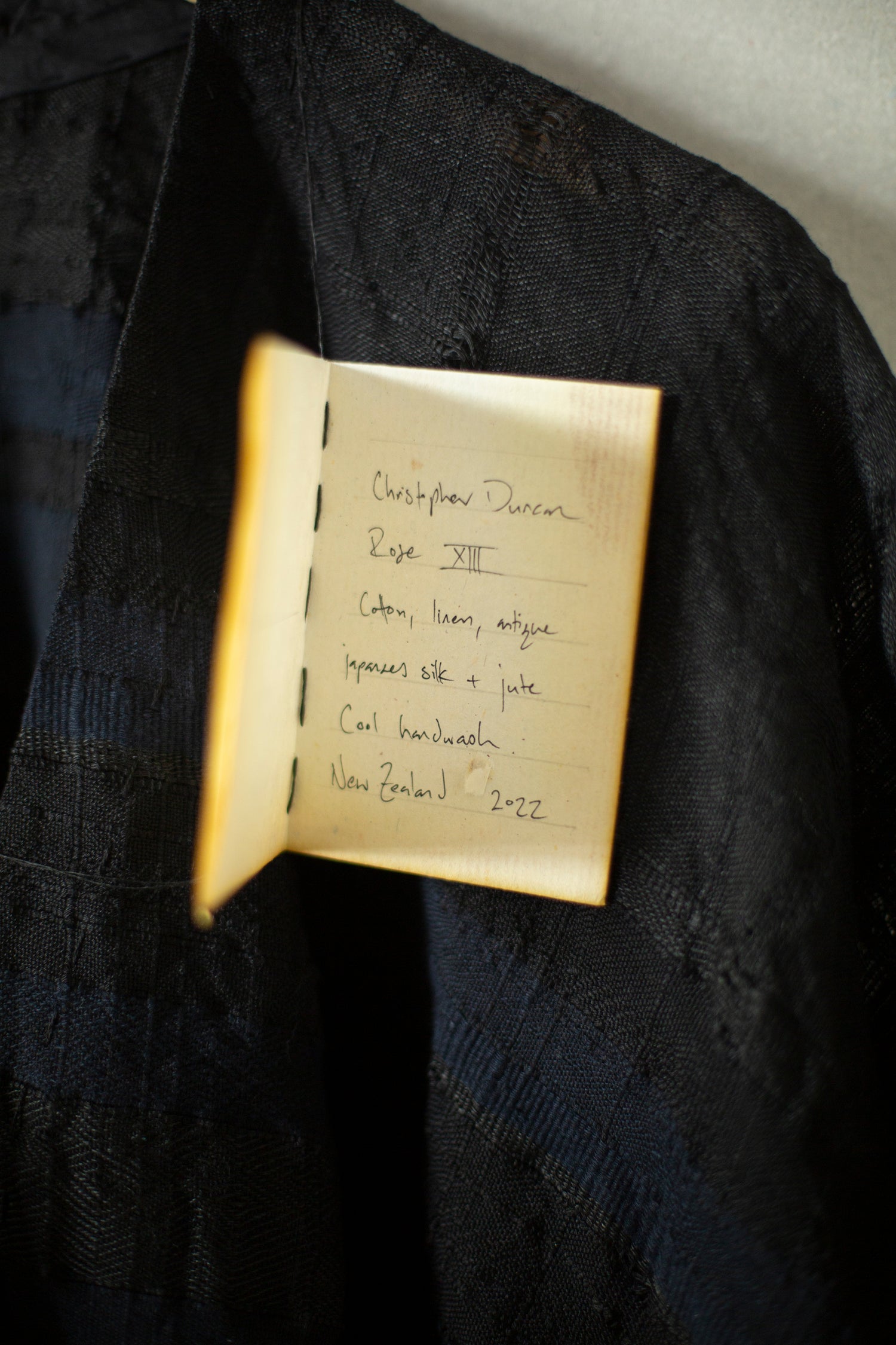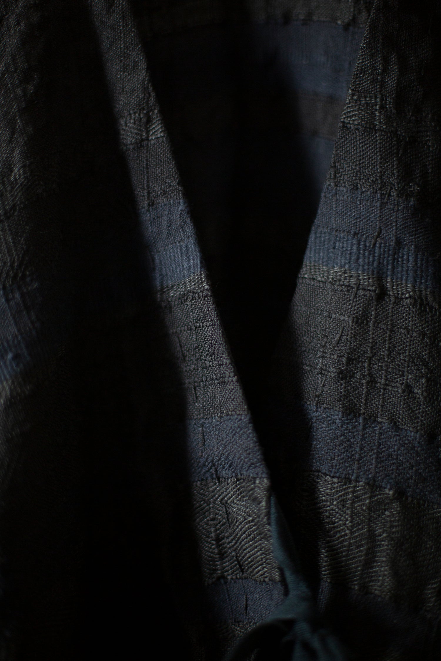 This cropped kimono vest is woven through a warp of cotton with wefts of linen, cotton, antique japanese silk and jute. Small soumak detail in silk. The neckline and hem are finished by hand. The ties are made with cotton tape. Varying weave structures create a rhythm throughout the textile.