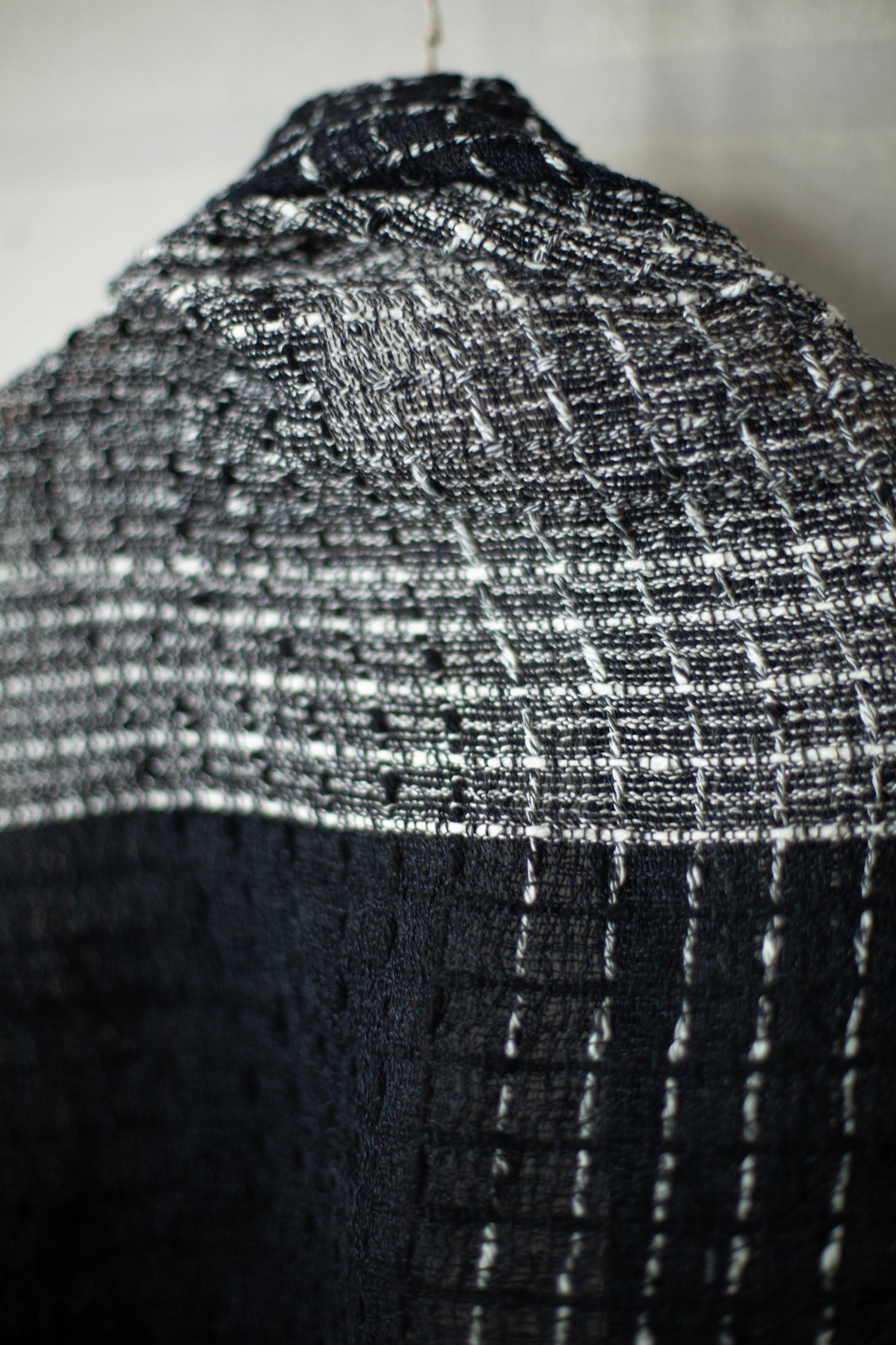 LIGHT AND AIRY, THIS FABRIC IN COTTON AND LINEN, HAS BEEN WOVEN IN JAN-JAN VAN ESSCHE’S STUDIO BY LAMINE DIOUF. ITS BREATHABLE MESH STRUCTURE ALLOWS FOR FURTHER LAYERING OF GARMENTS, AND PLAY WITH TEXTURES AMID HOT SUMMER DAYS. COMBINATION OF OPEN AS WELL AS COMPACT WEAVE STRUCTURES PROMOTES FLUIDITY, WHILE MAINTAINING THE FABRIC’S INTEGRITY AND PROVIDING SUPPORT FOR THE DRAPE.