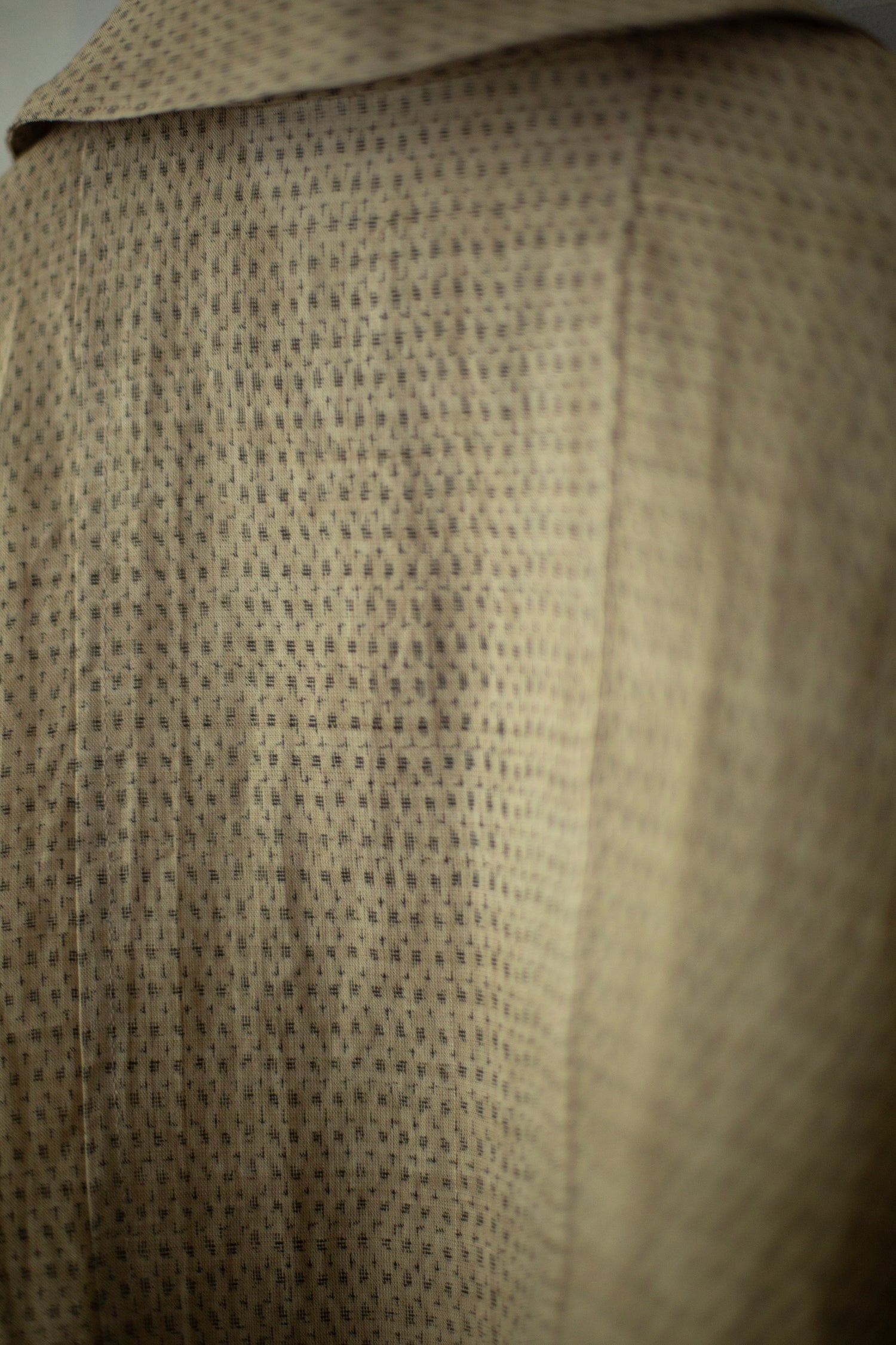 The antique ramie fabric, a type of bast fiber, is unraveled from kimonos woven about 100 years ago. The distinctive, taut texture is unique to hand-spun KARAMUSHI (or CHO MA) and the hand-woven ikat patterns.