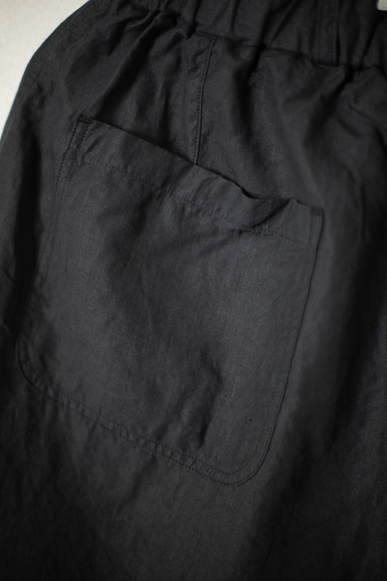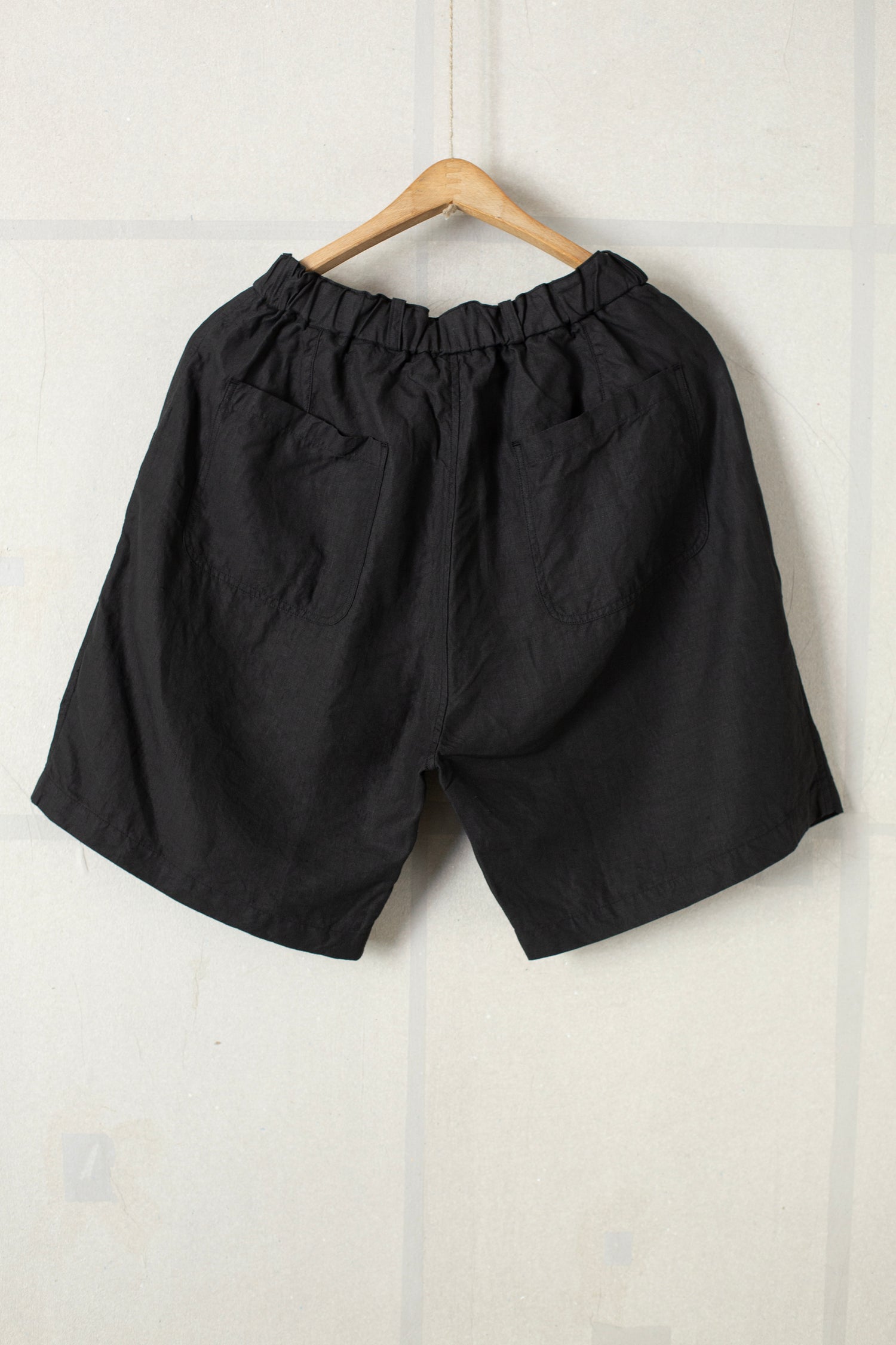 Short loose trousers in black light hemp by MITTAN with draw string, side seam pockets and patched pockets in the back.