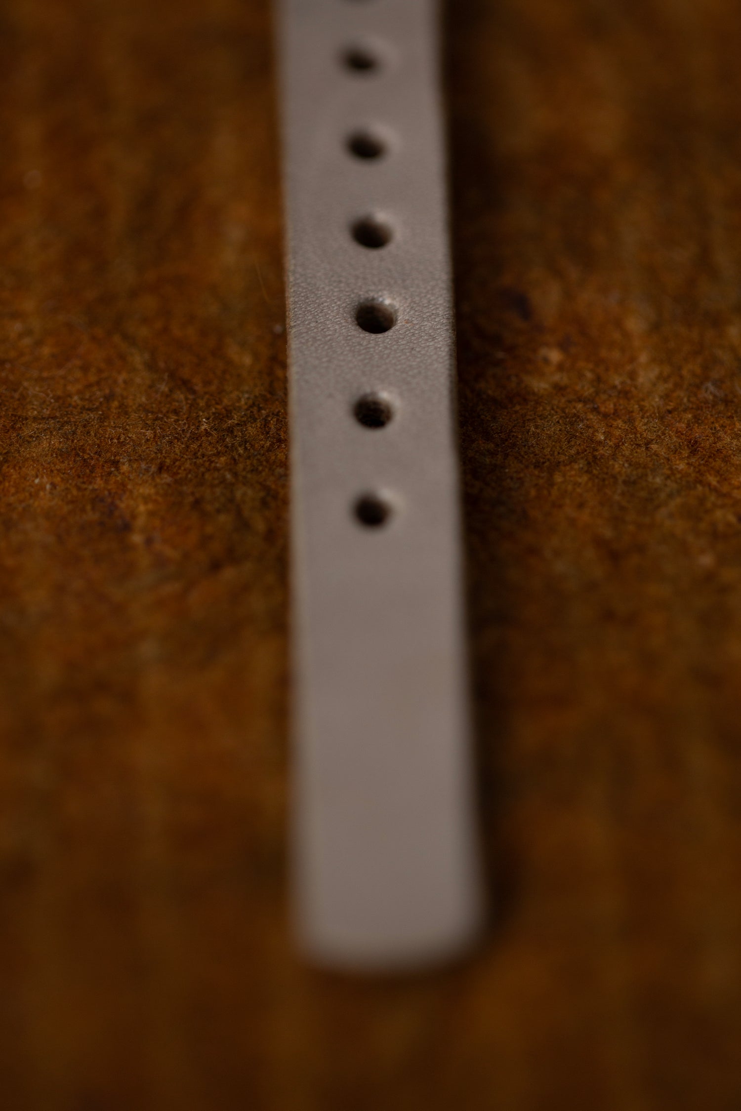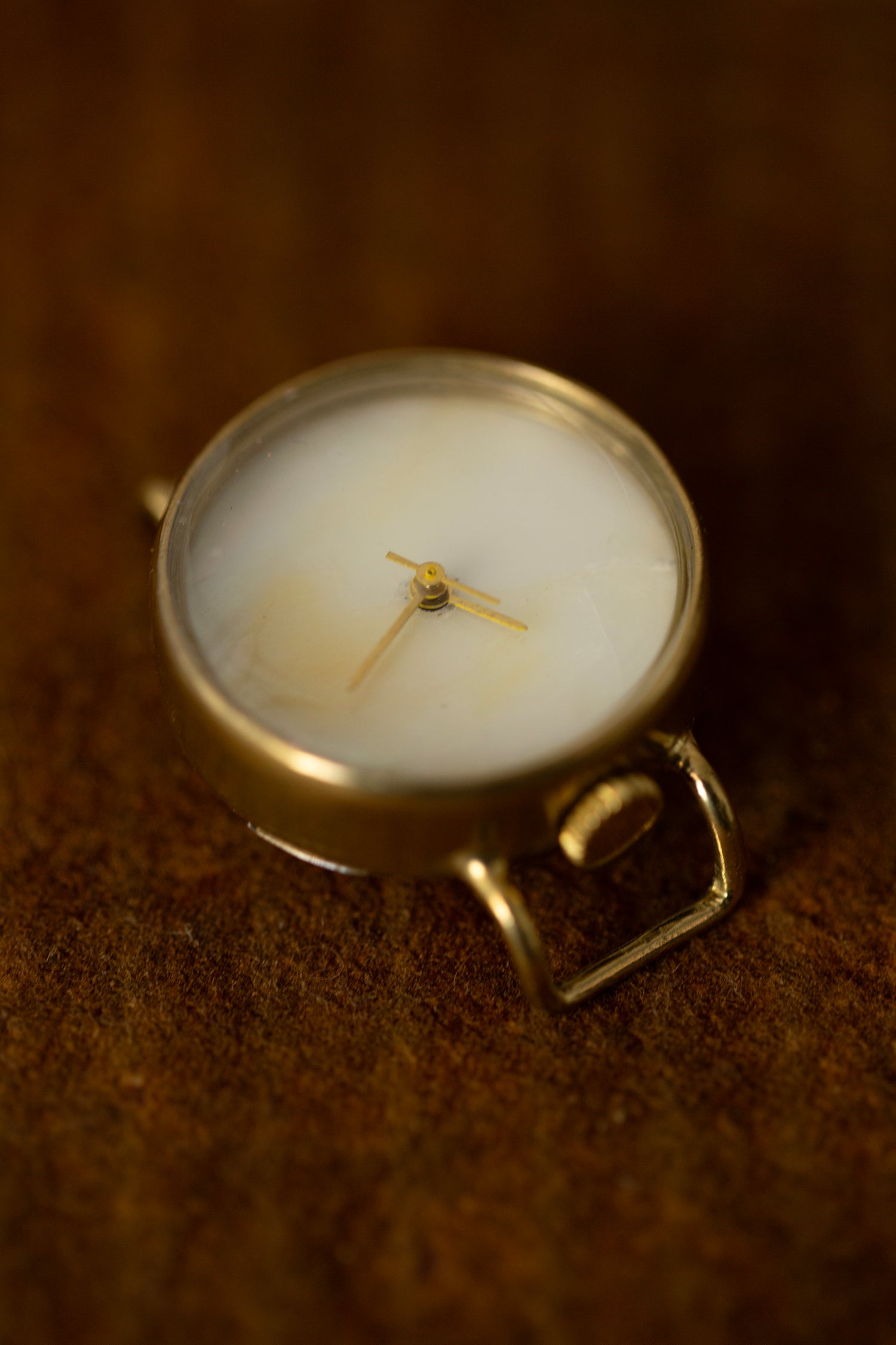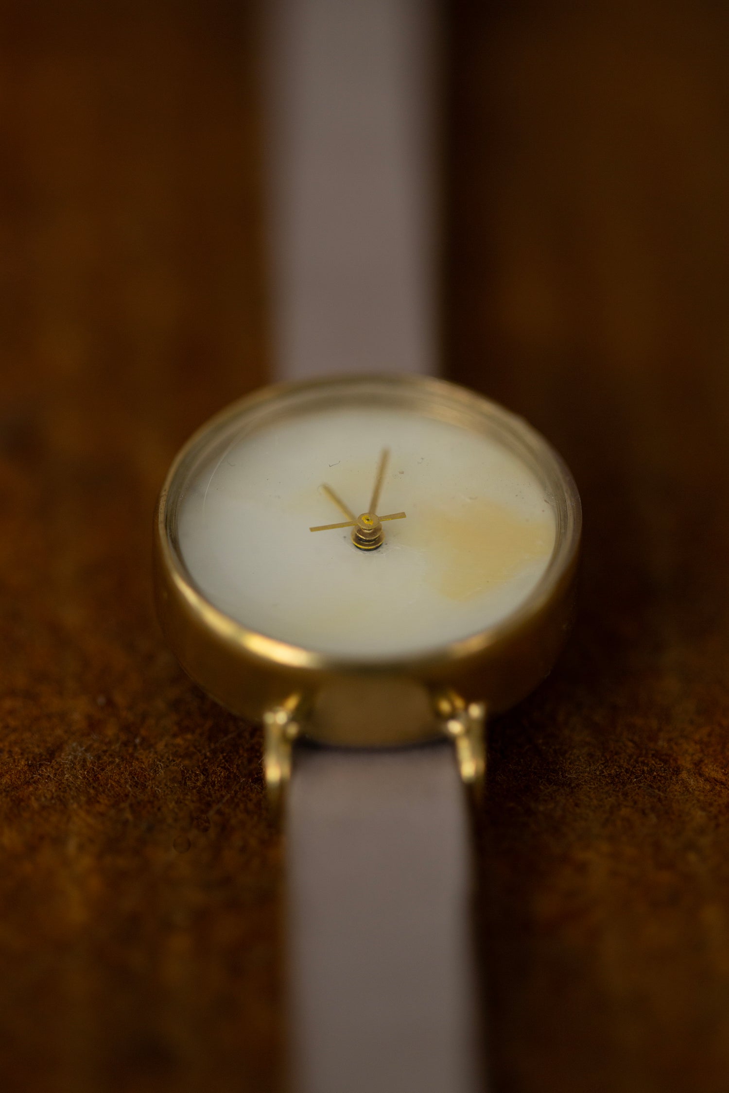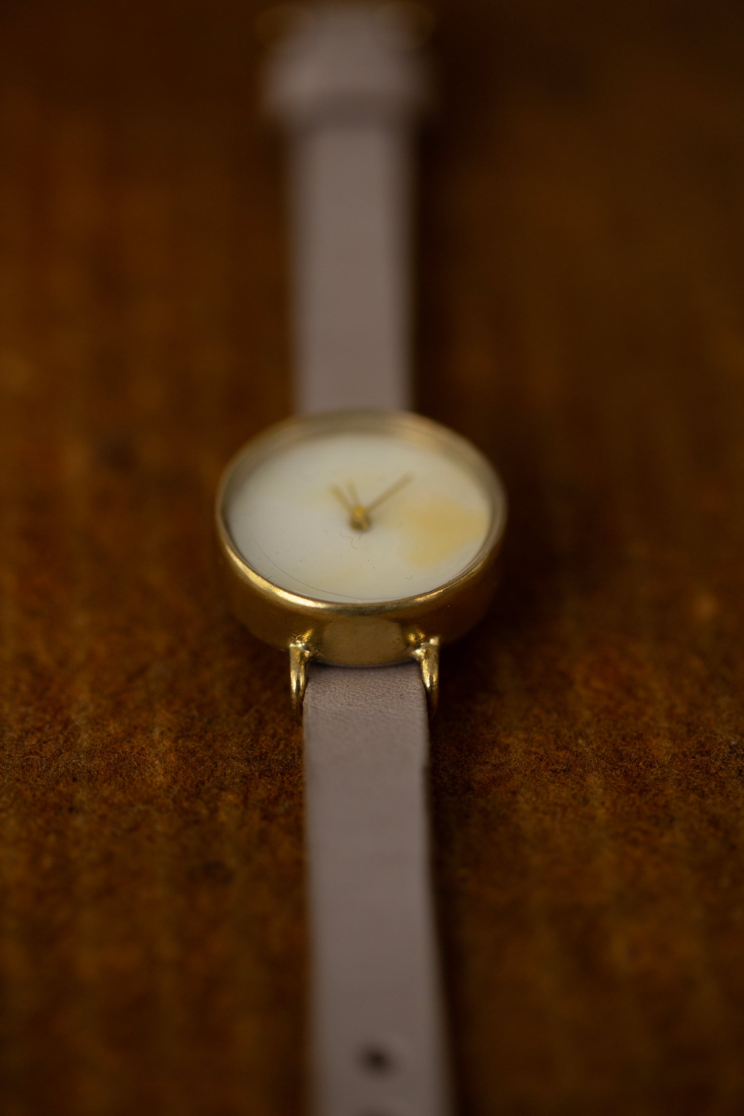 Handmade watch with grey leather bracelet, shell dial and brass case and buckle.