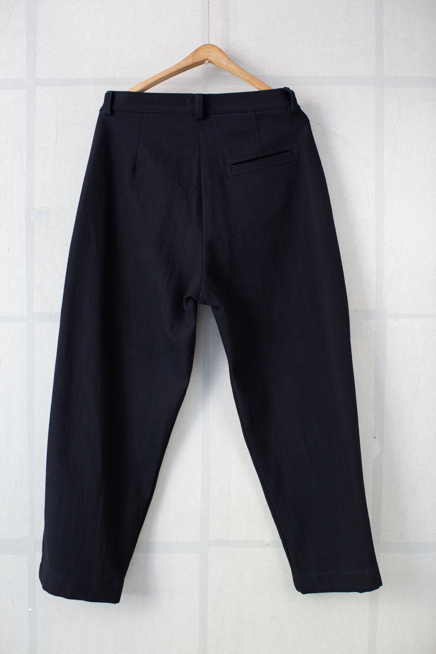 Single pleat, subtly tapered, pant in Black Cotton Kersey by Evan Kinori with side seam pockets, one jetted back pocket and a doubled hem.