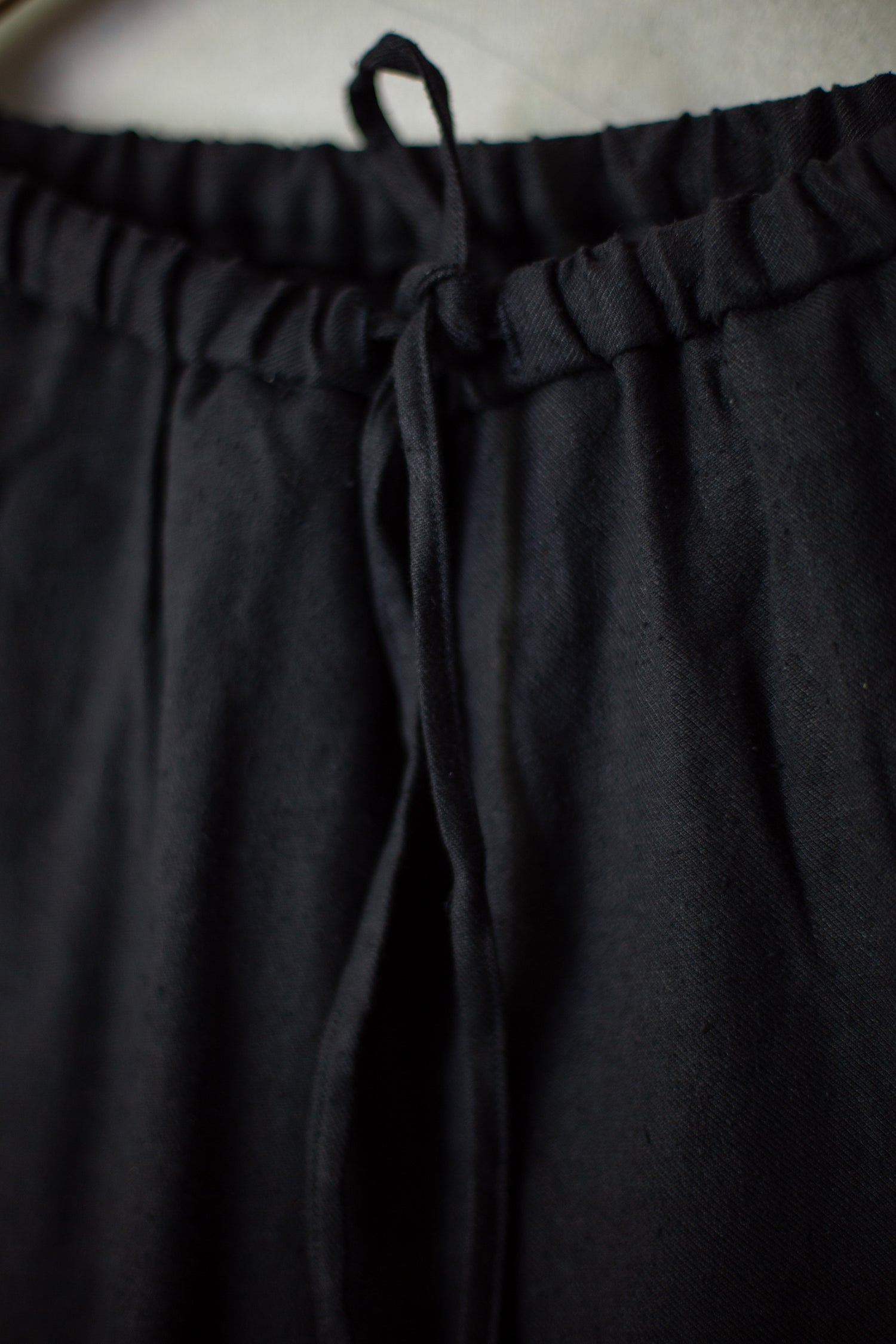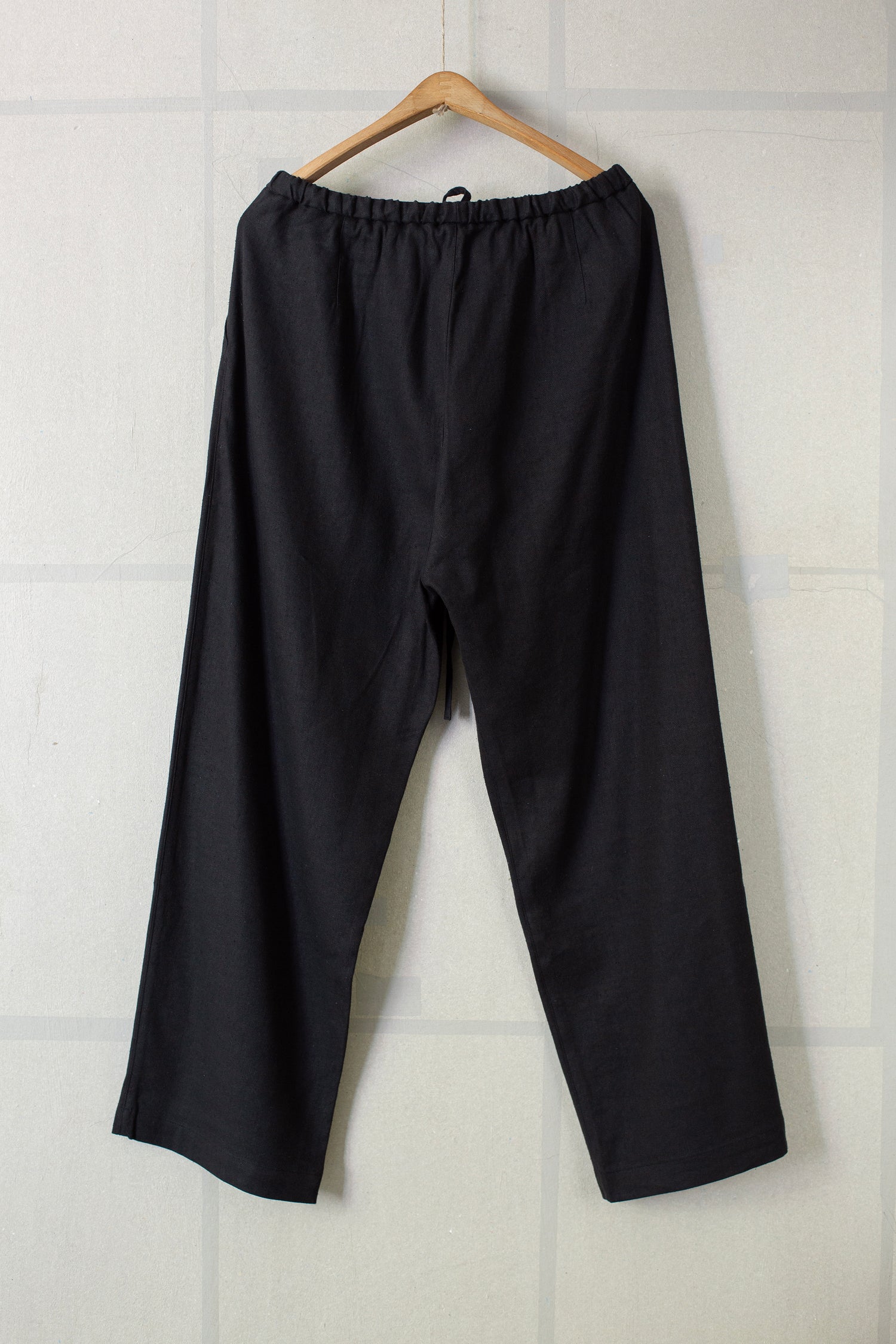 Straight long pants in black silk linen twill by MITTAN with elasticated waist, matching waist string, side pockets and minimalistic finishing.