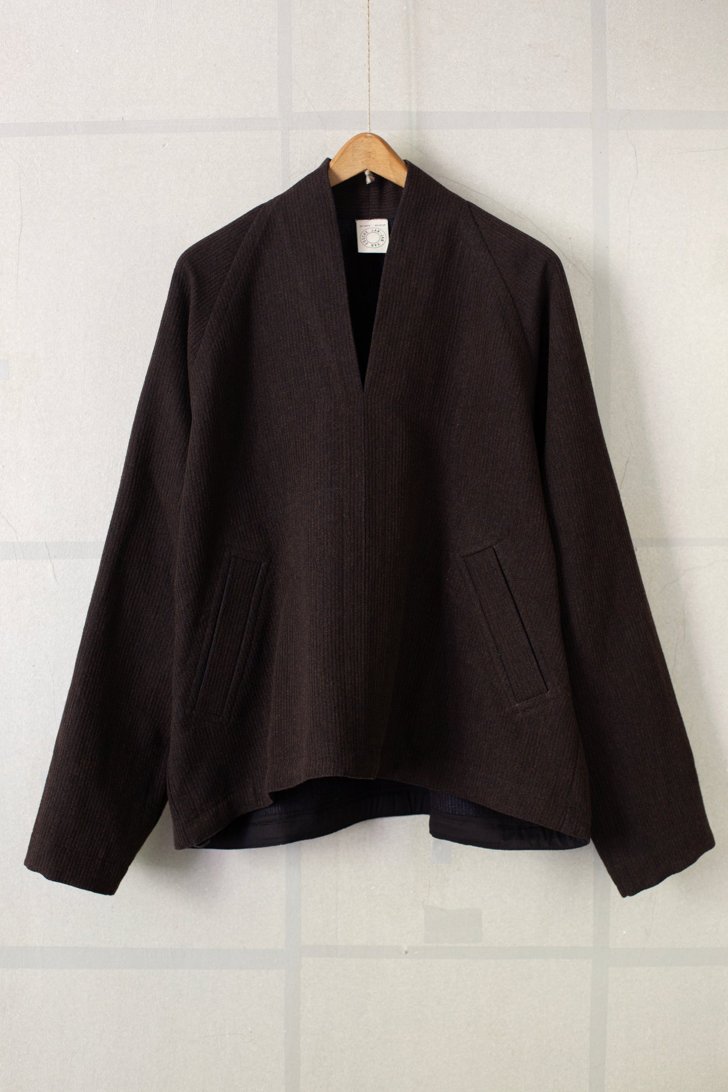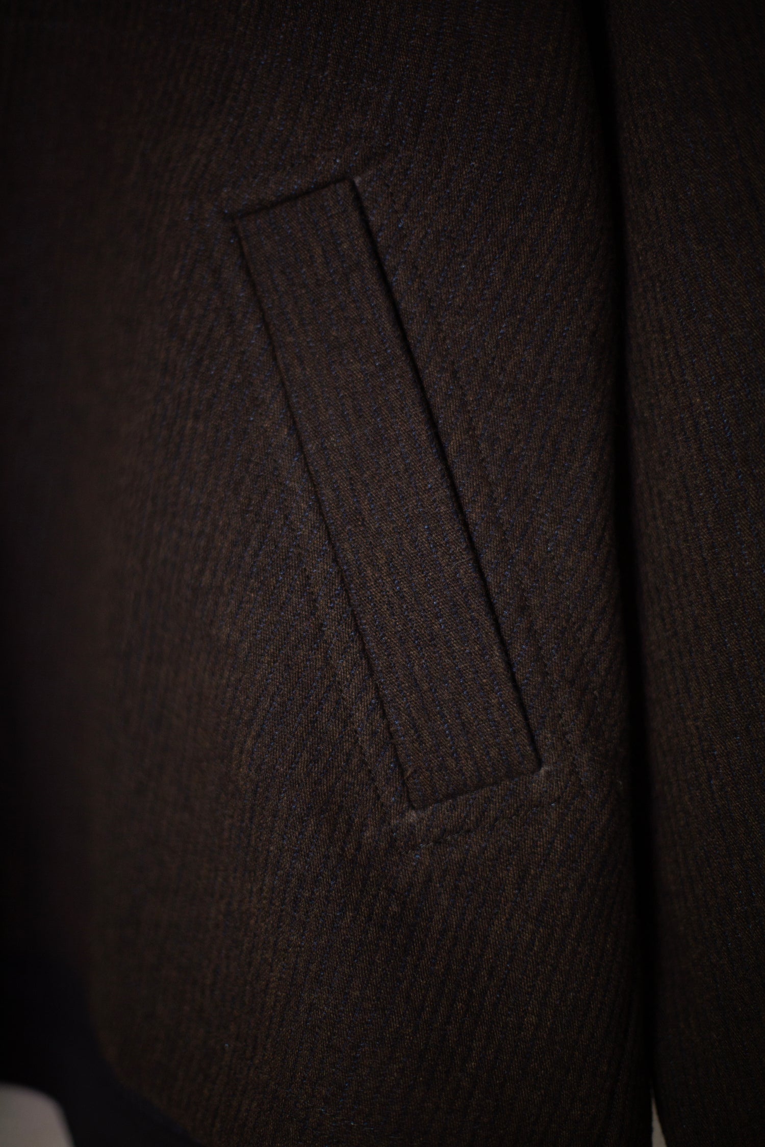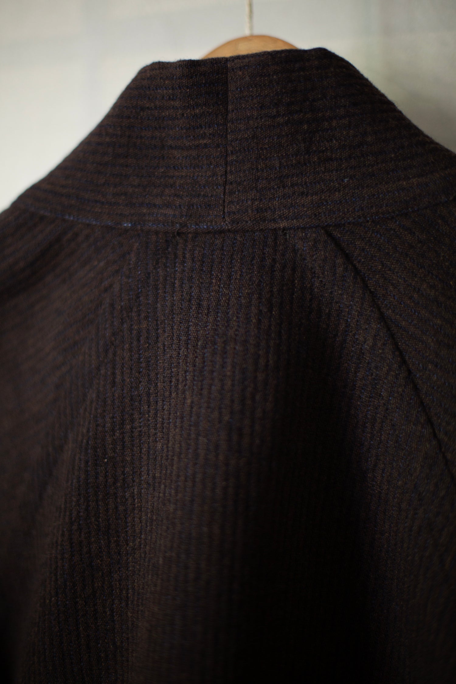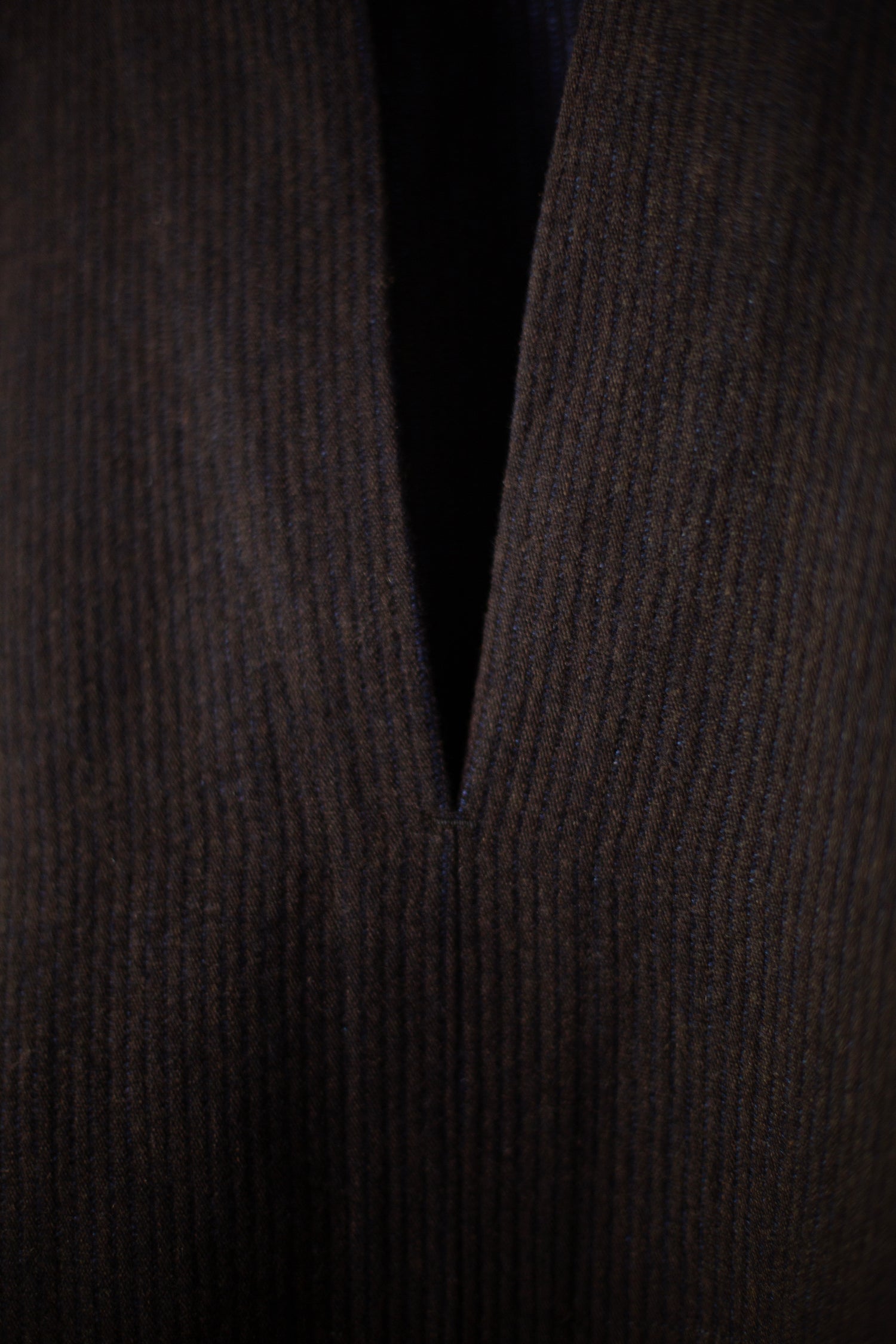 THIS CORDUROY-LIKE FABRIC IS MADE UP OF A DENSE AND TEXTURED BROWN WOOL AND CASHMERE FRONT, WITH A SPARSELY WOVEN BACKING OF LINEN THREADS IN BLUE. AS THE FABRIC MOVES, HINTS OF INDIGO-TONED BLUE PIERCE THROUGH WITH ITS SHEEN.