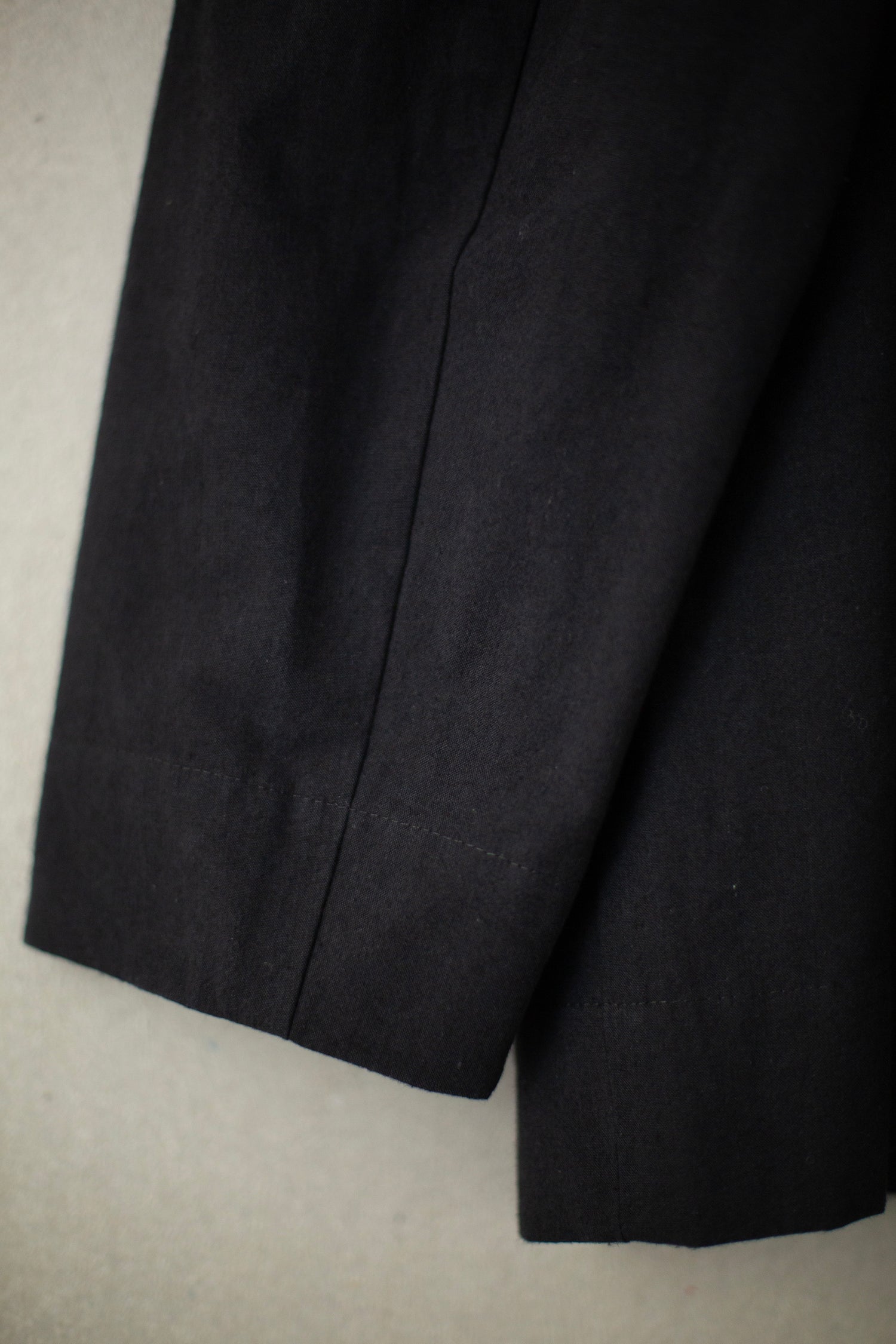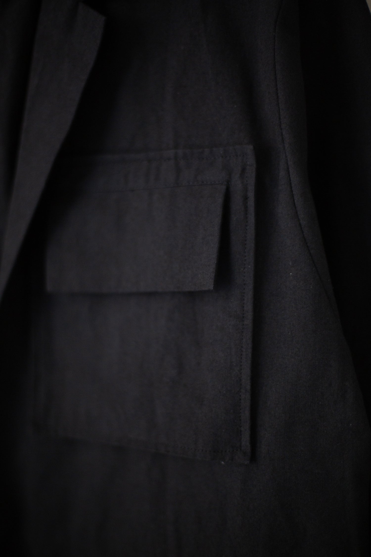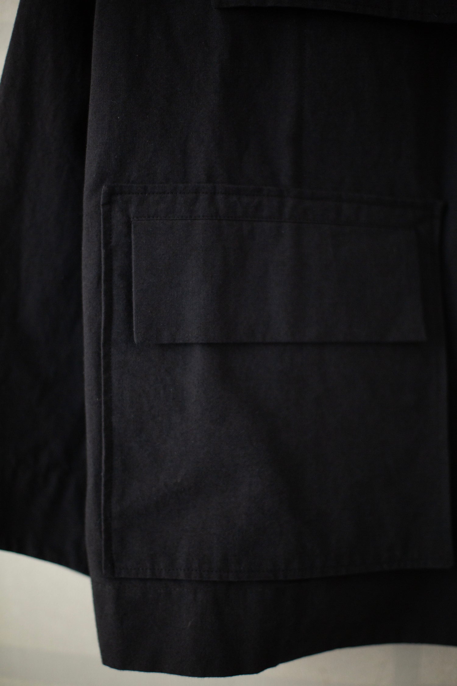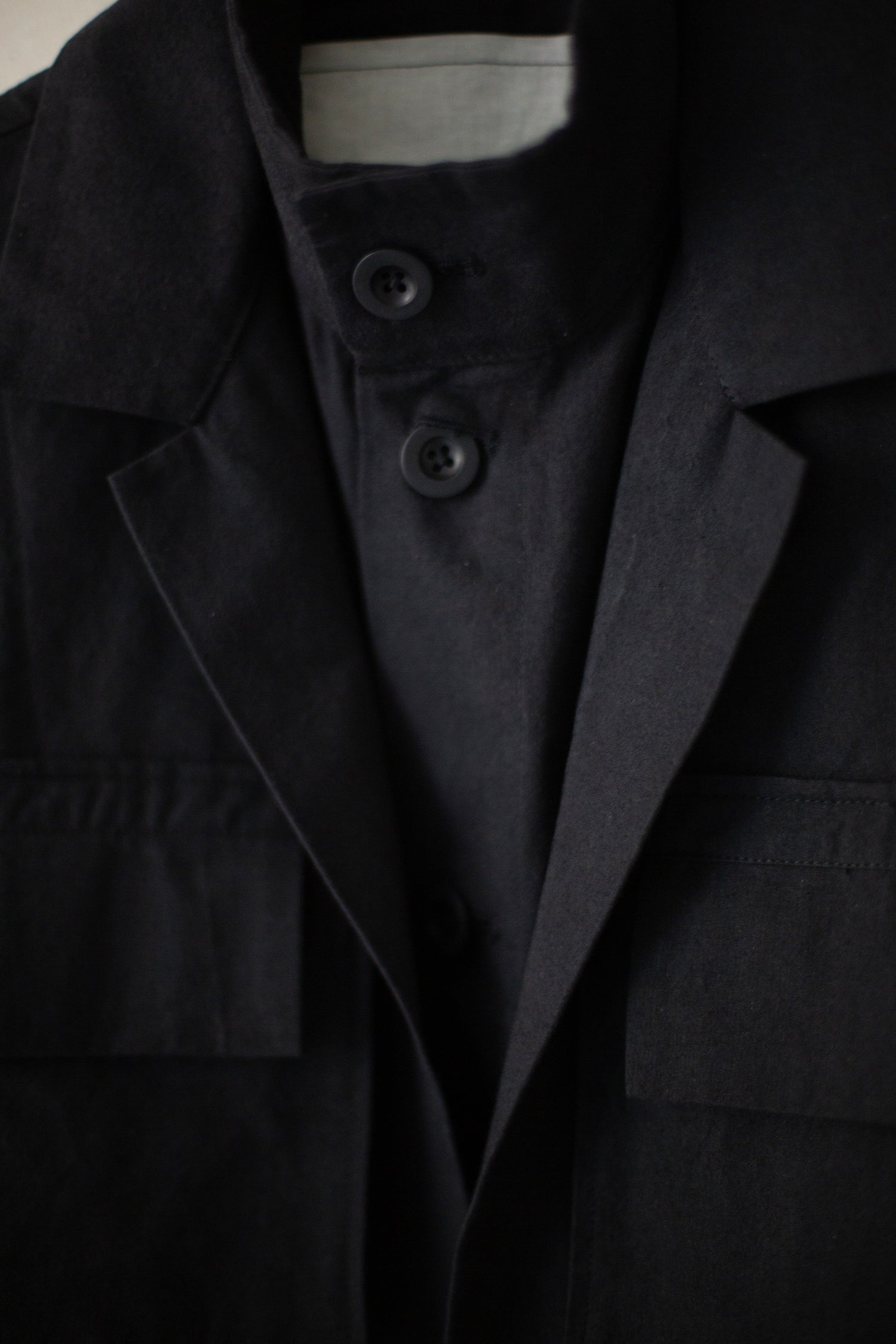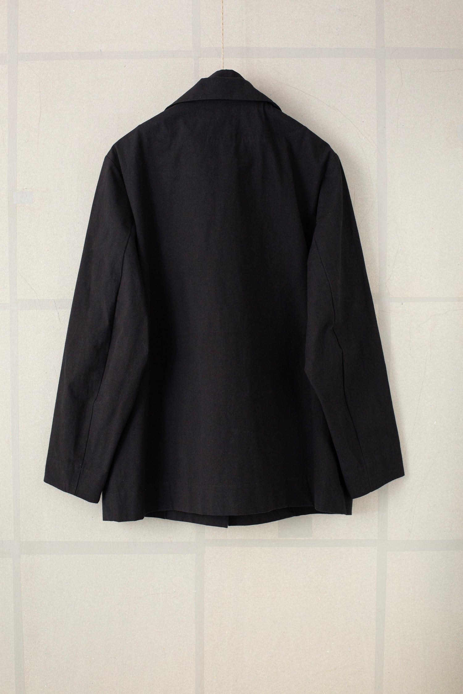 The Forager jacket by toogood in black strong cotton with extra lapel detail and 4 flap closure patch pockets.