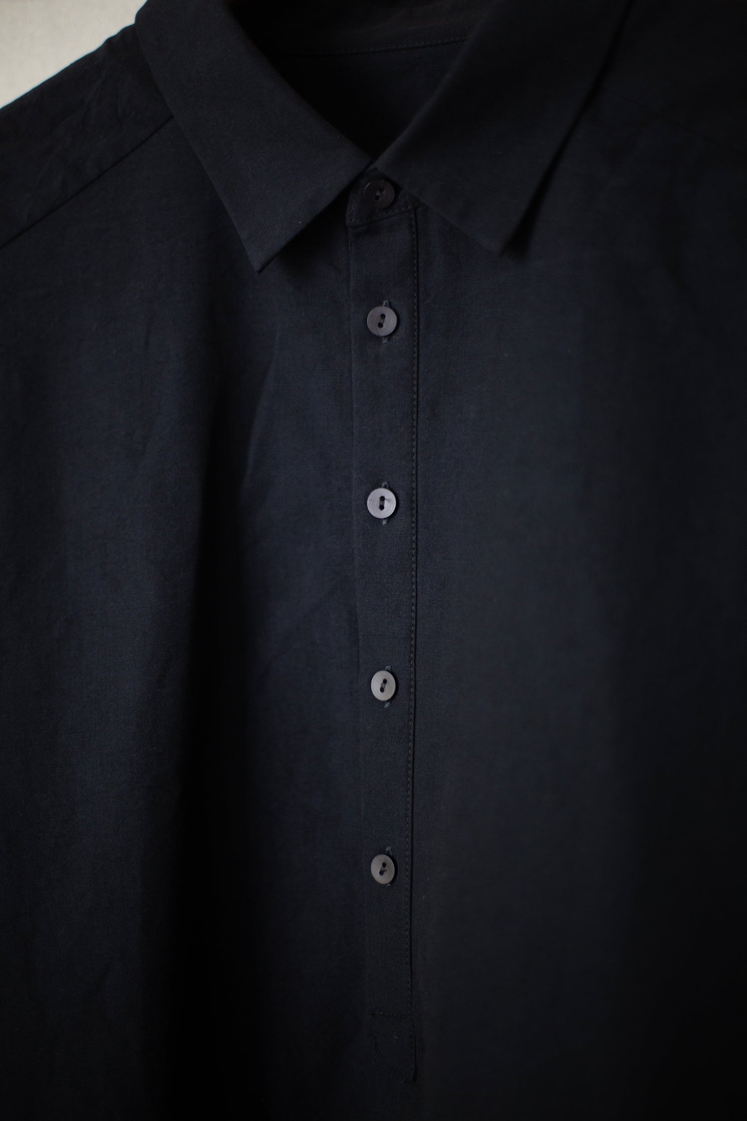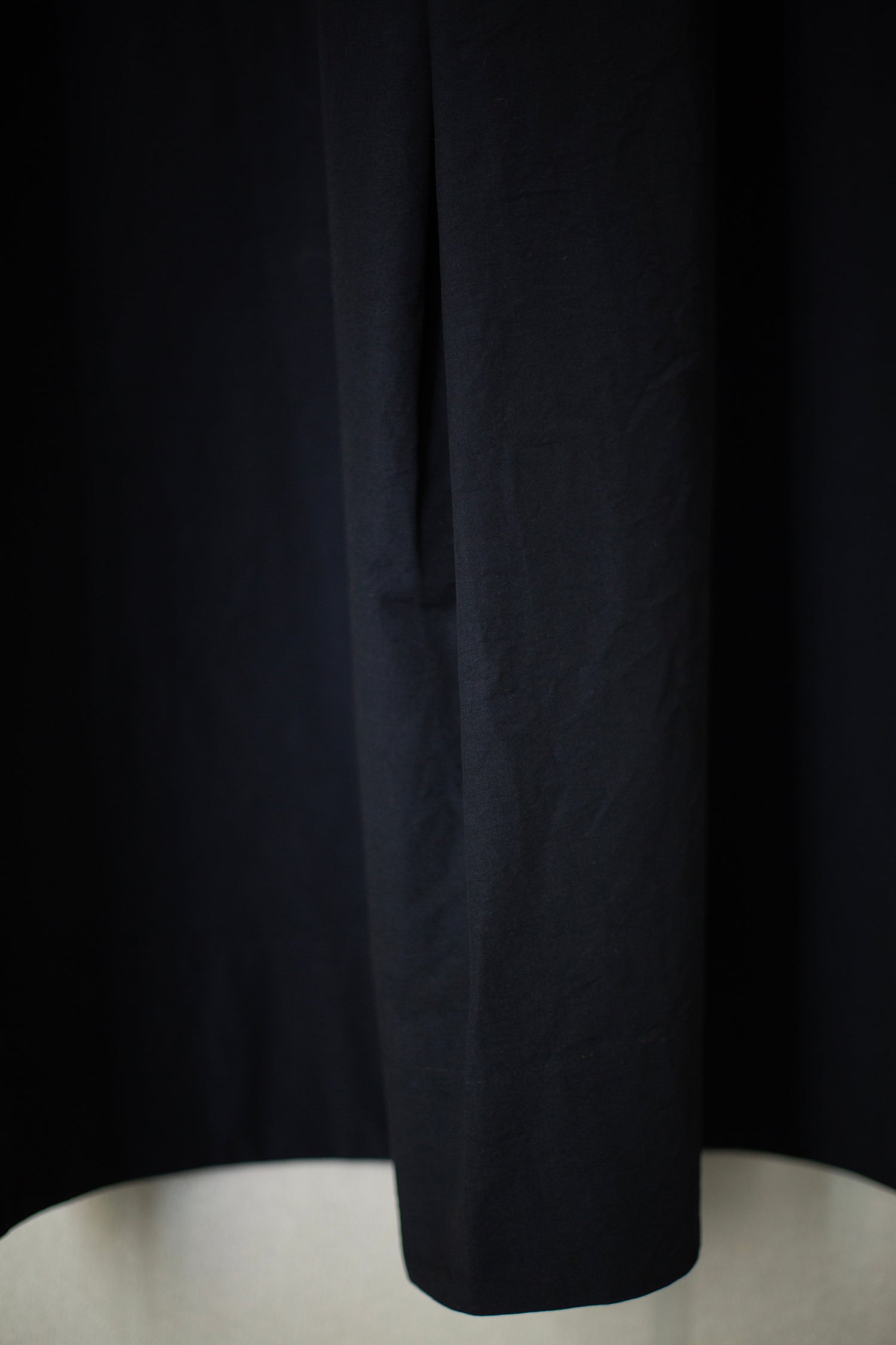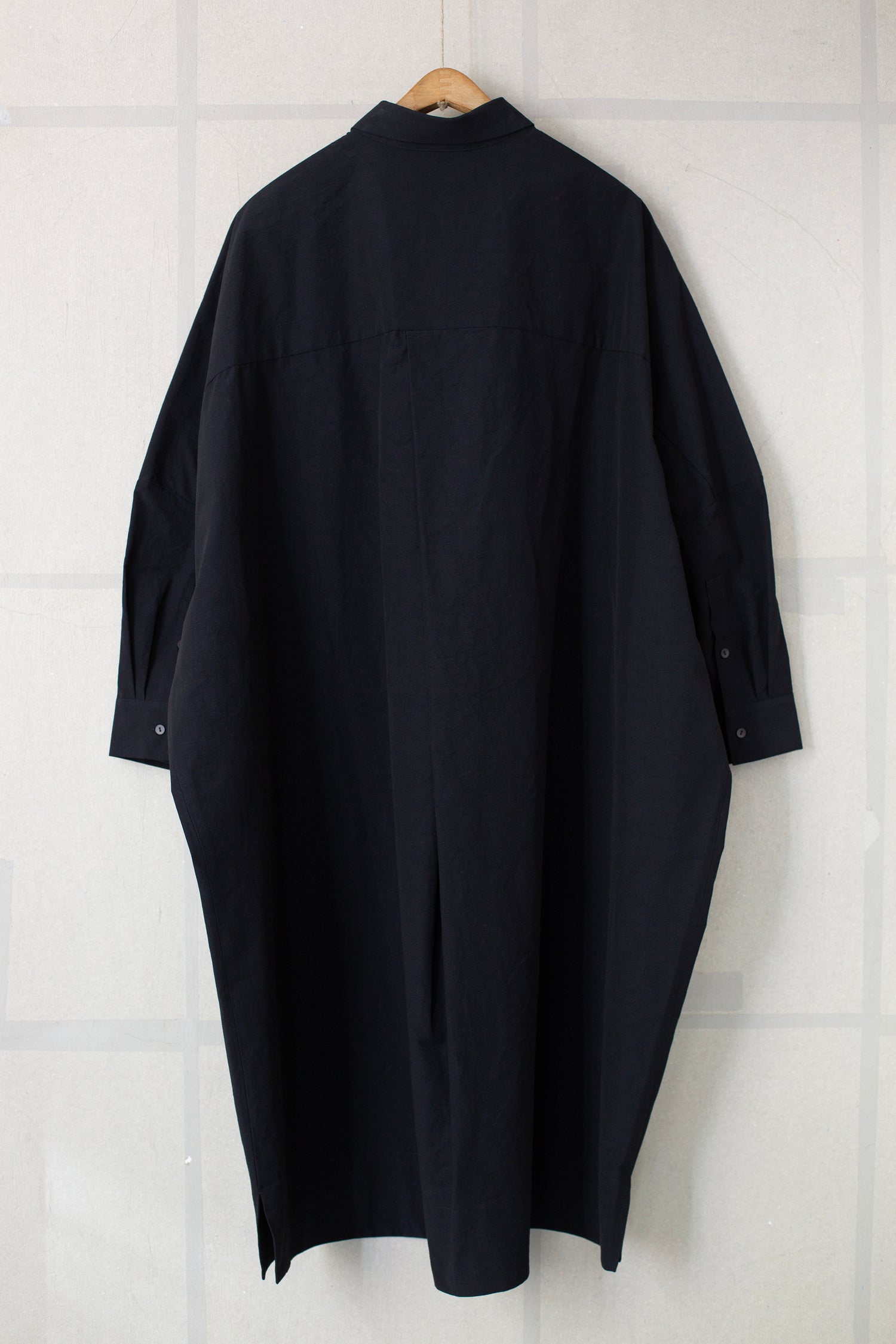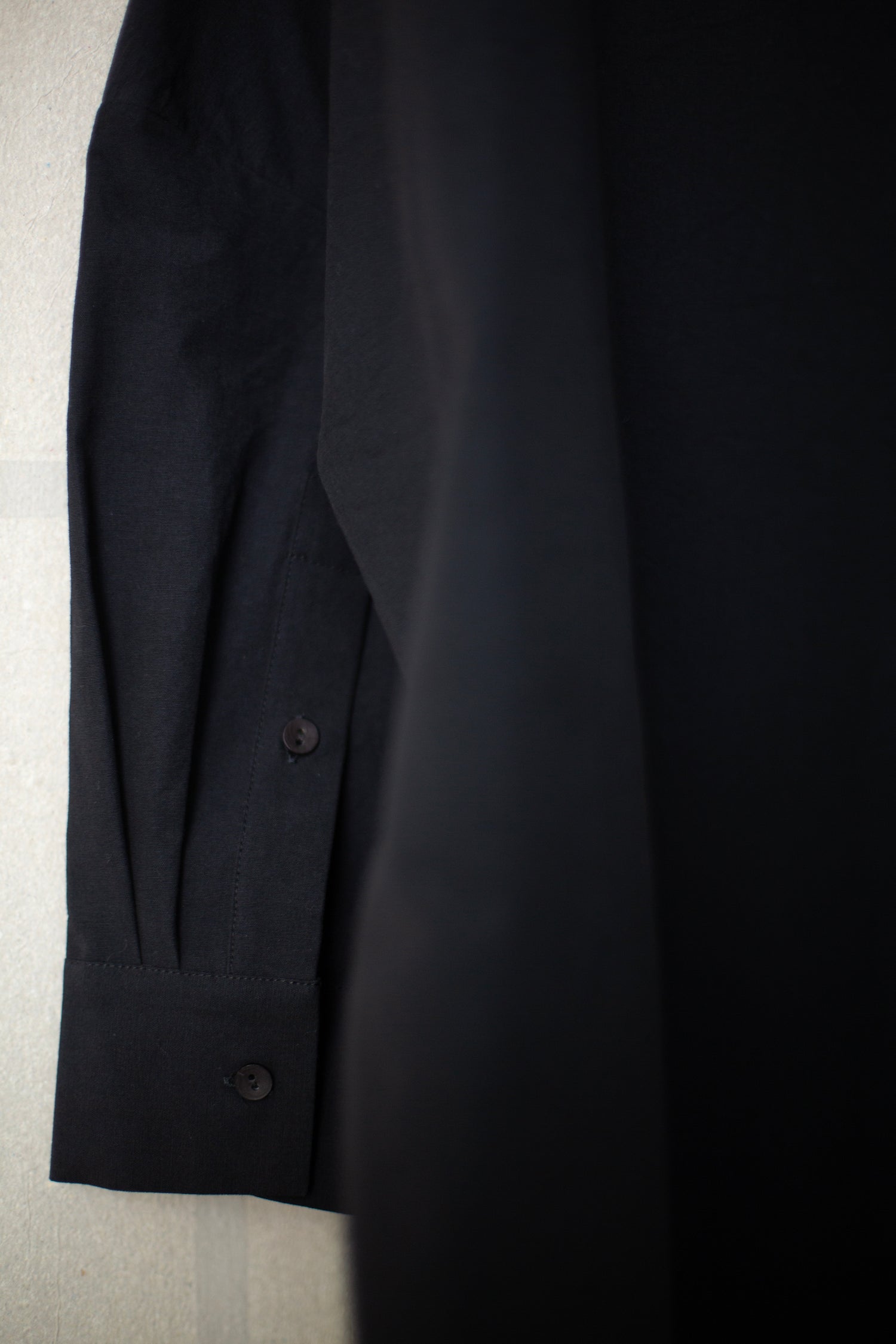 The framer dress by Toogood in black structured cotton with a sculptural quality, part button closure, shirt collar, half shirt sleeve, patch pockets and knife pleat in back.