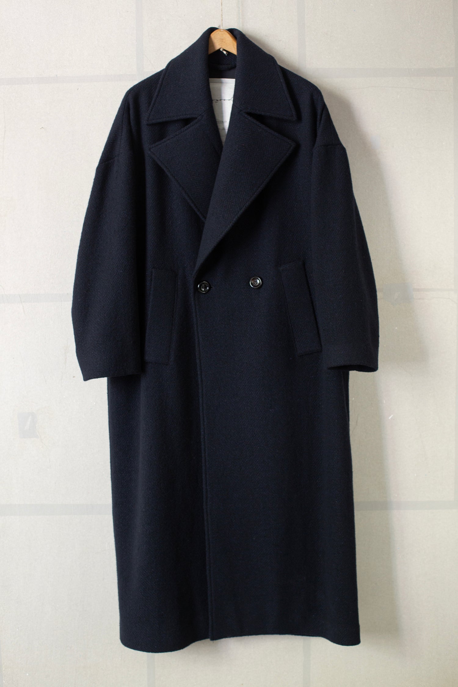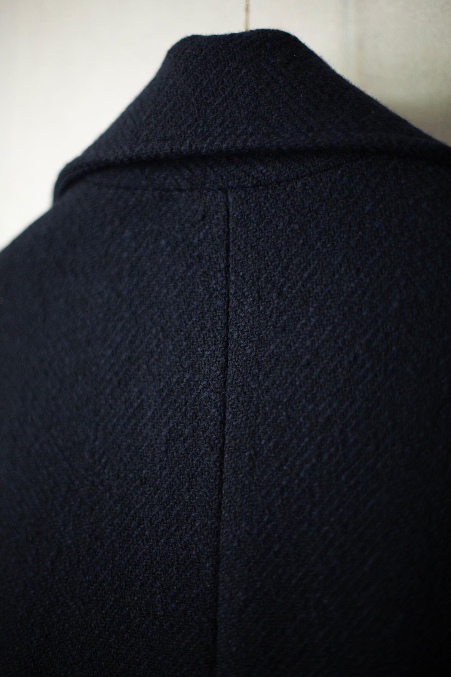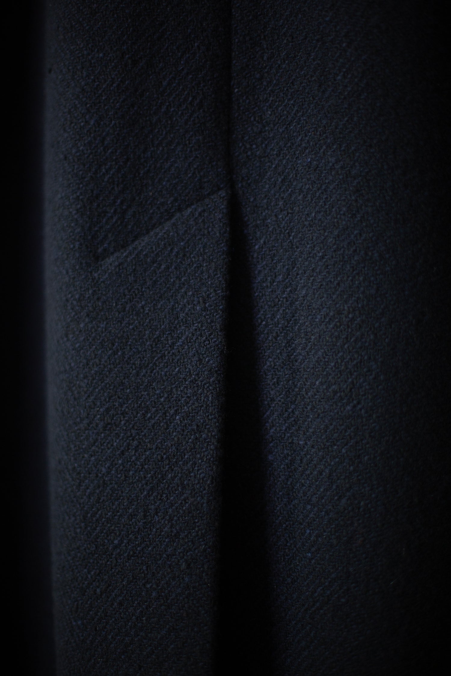 The Groundsman coat by Toogood in ink cashmere herringbone with double breasted closure, two front pockets, back split and lining.