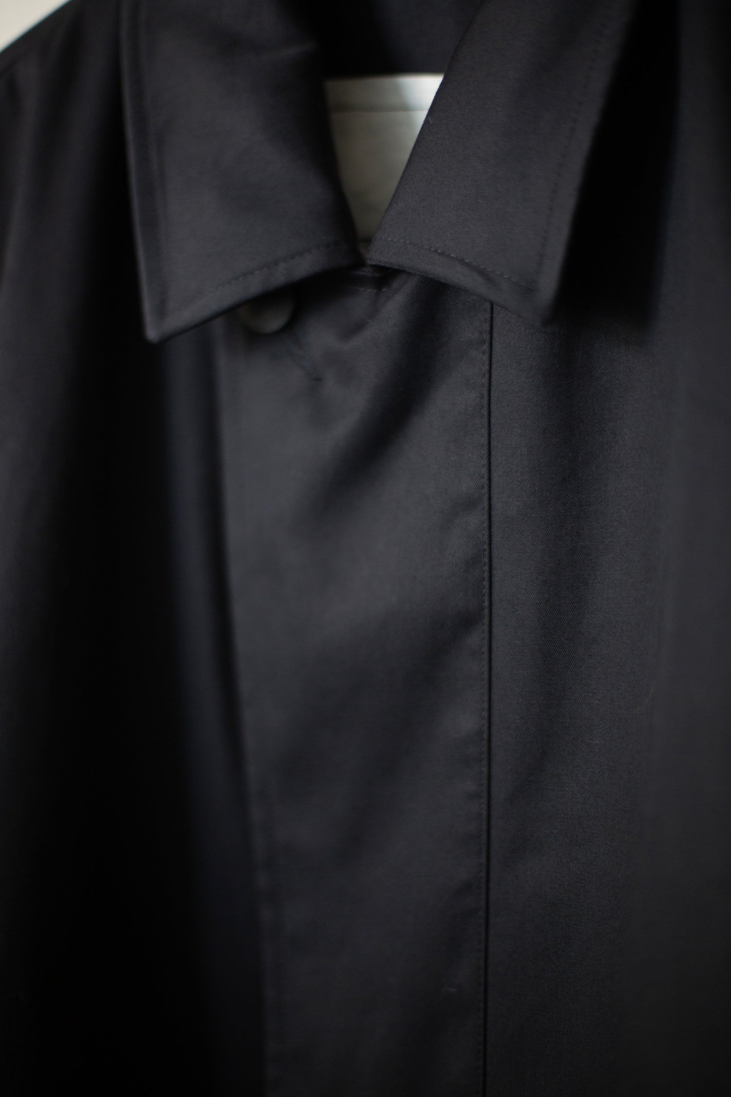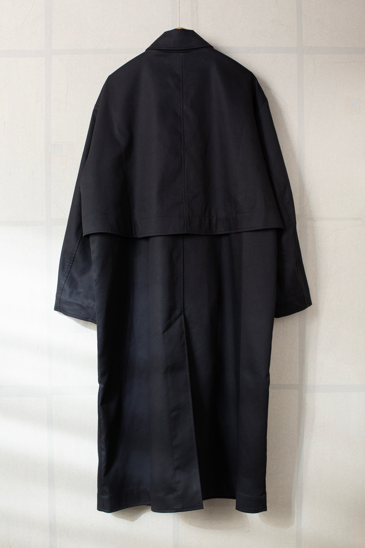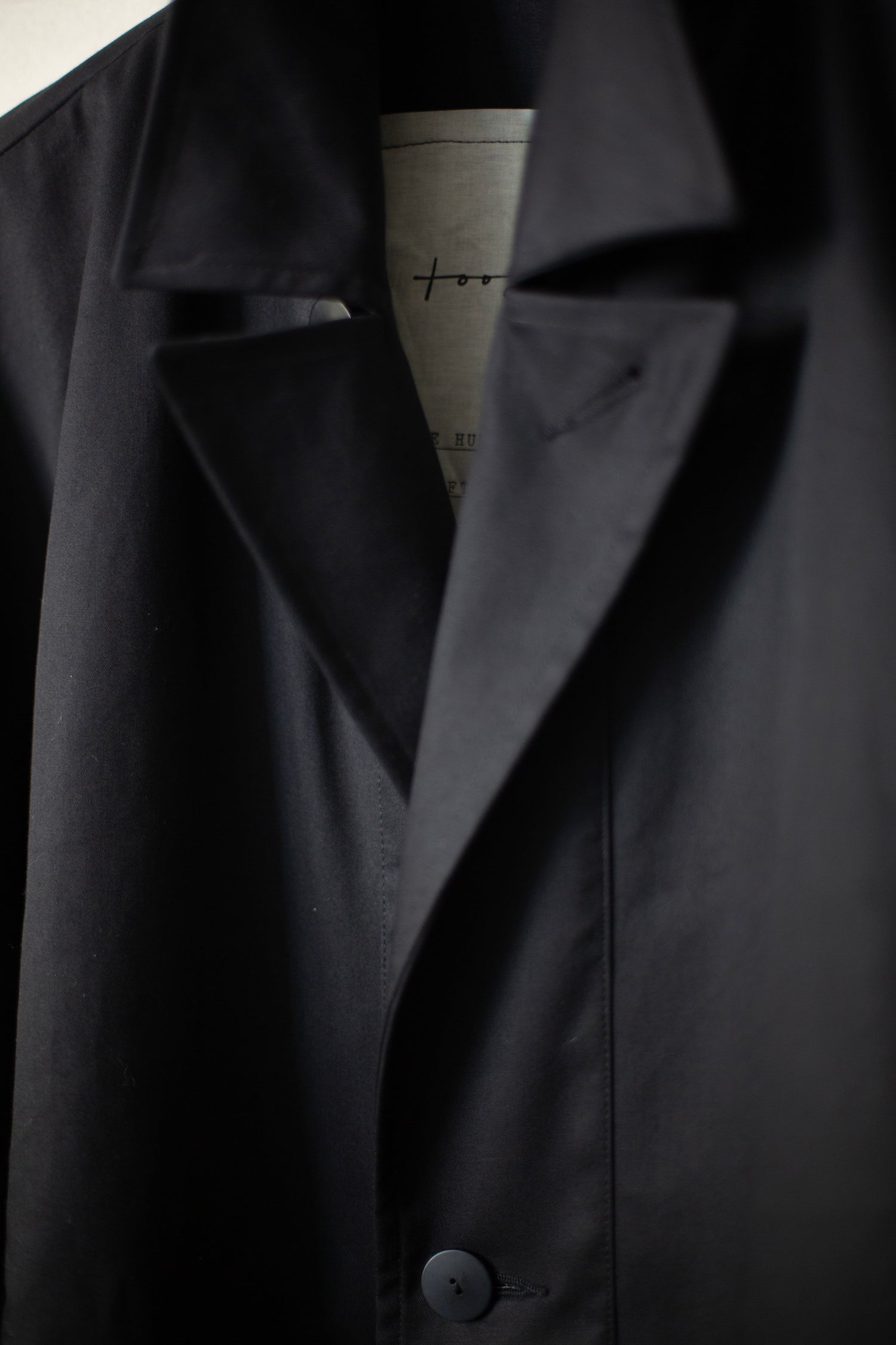 The Hunter coat by toogood in black water repellent bonded gabardine with contrasting sand coloured lining, sofisticated trench coat like construction and split in back.