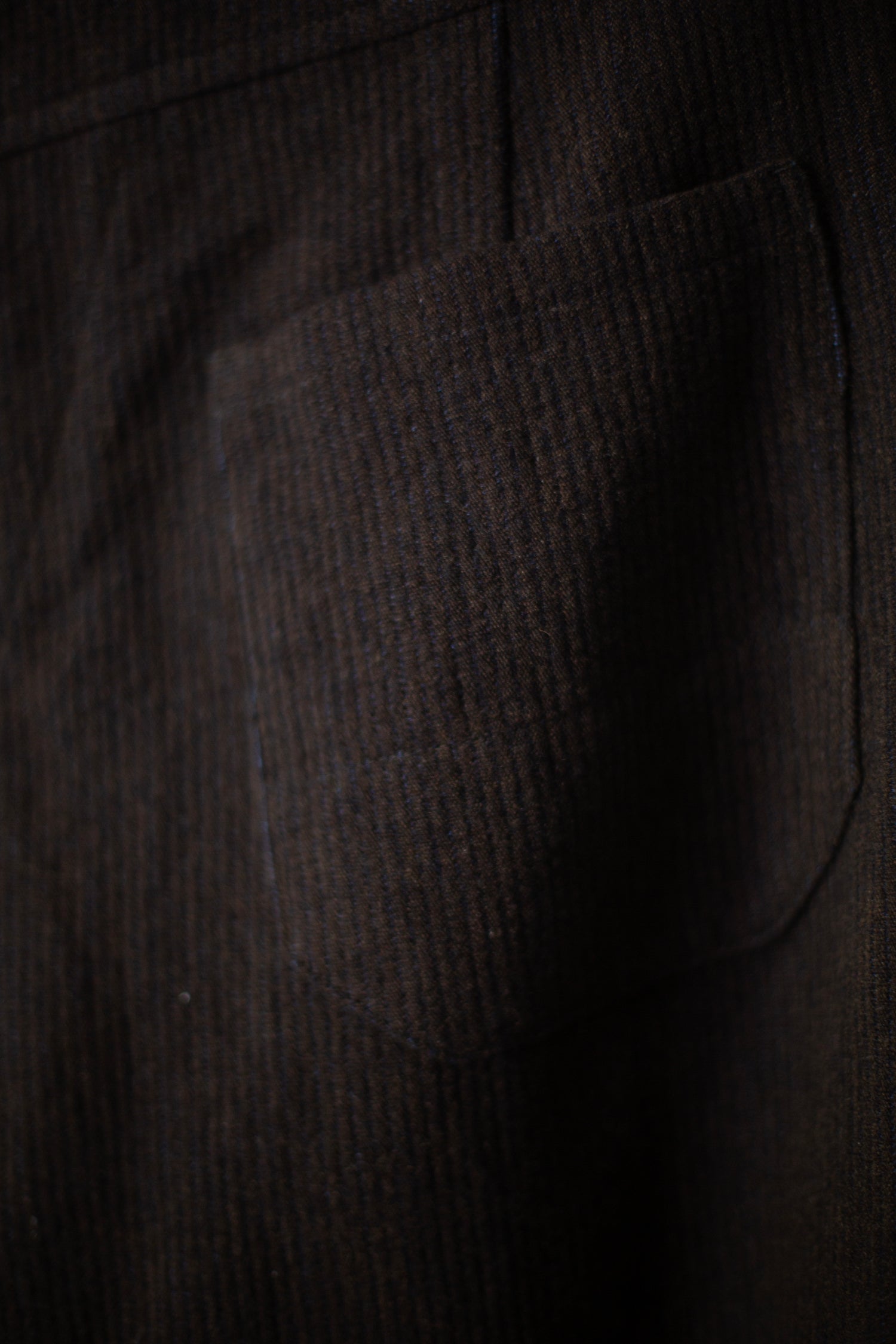 THIS CORDUROY-LIKE FABRIC IS MADE UP OF A DENSE AND TEXTURED BROWN WOOL AND CASHMERE FRONT, WITH A SPARSELY WOVEN BACKING OF LINEN THREADS IN BLUE. AS THE FABRIC MOVES, HINTS OF INDIGO-TONED BLUE PIERCE THROUGH WITH ITS SHEEN.