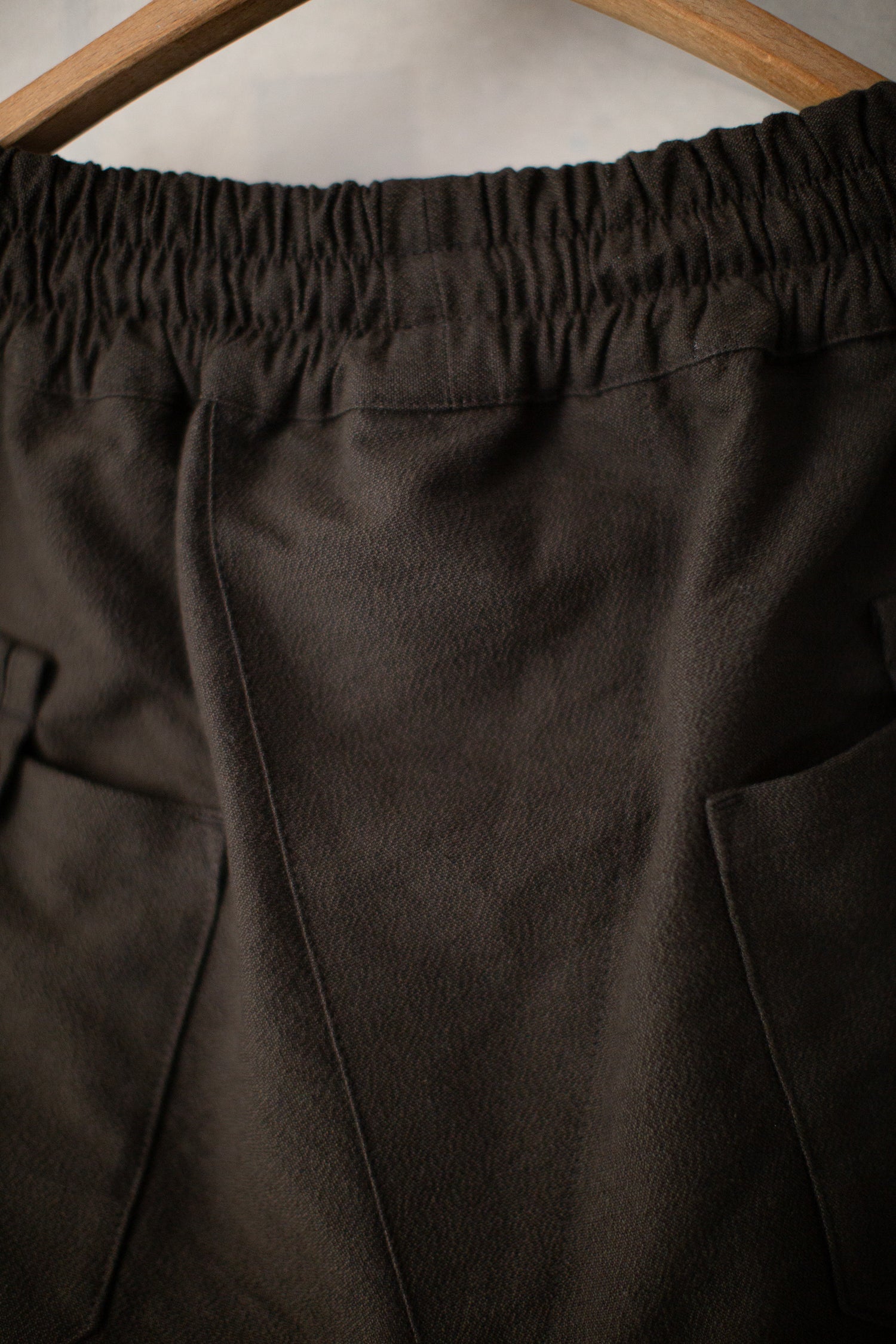 LOOSE FIT, SINGLE PLEATED TROUSERS WITH ELASTIC WAISTBAND, PATCH POCKETS AND DRAWCORD AT HEM FOR GATHERING.