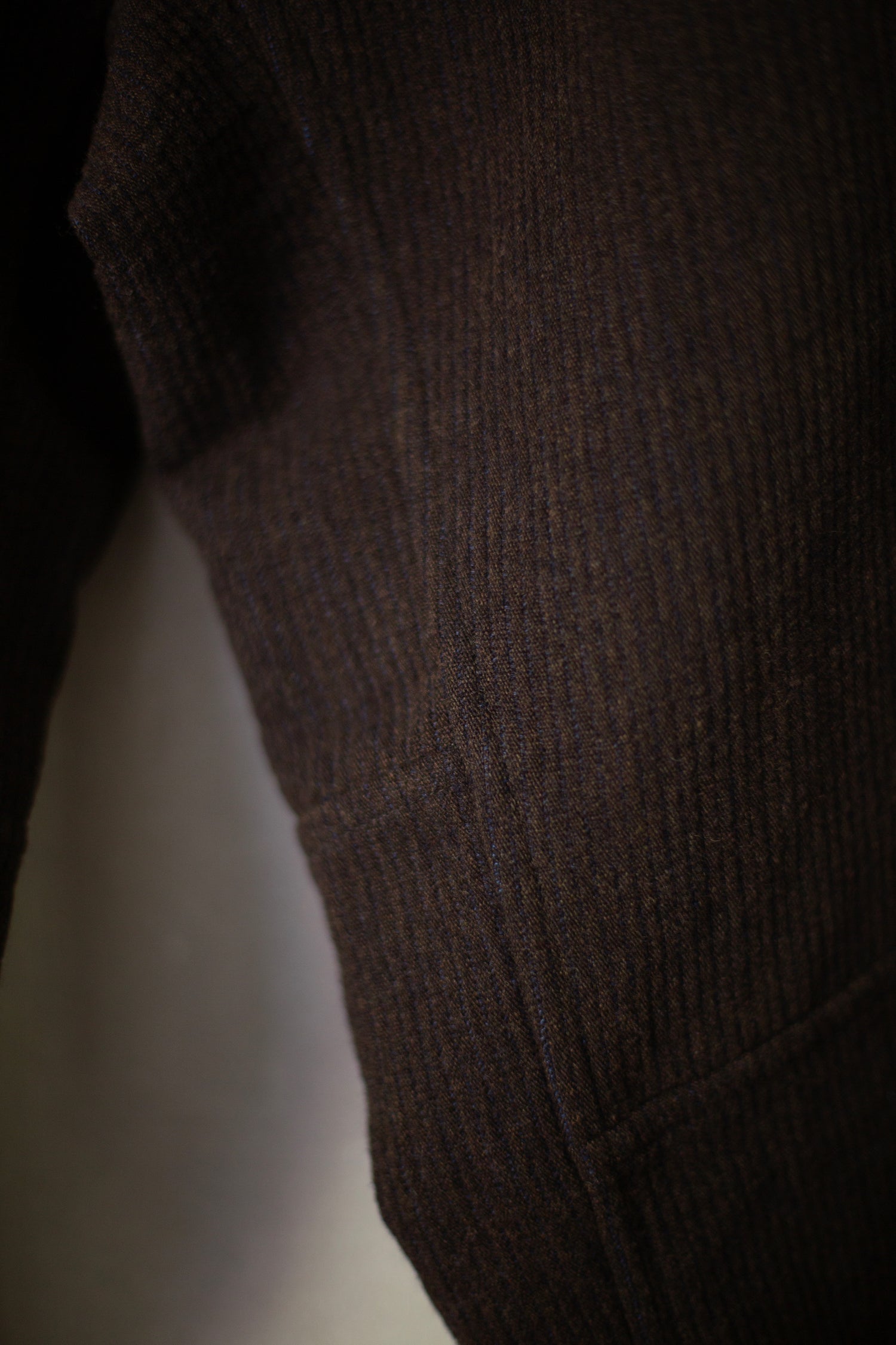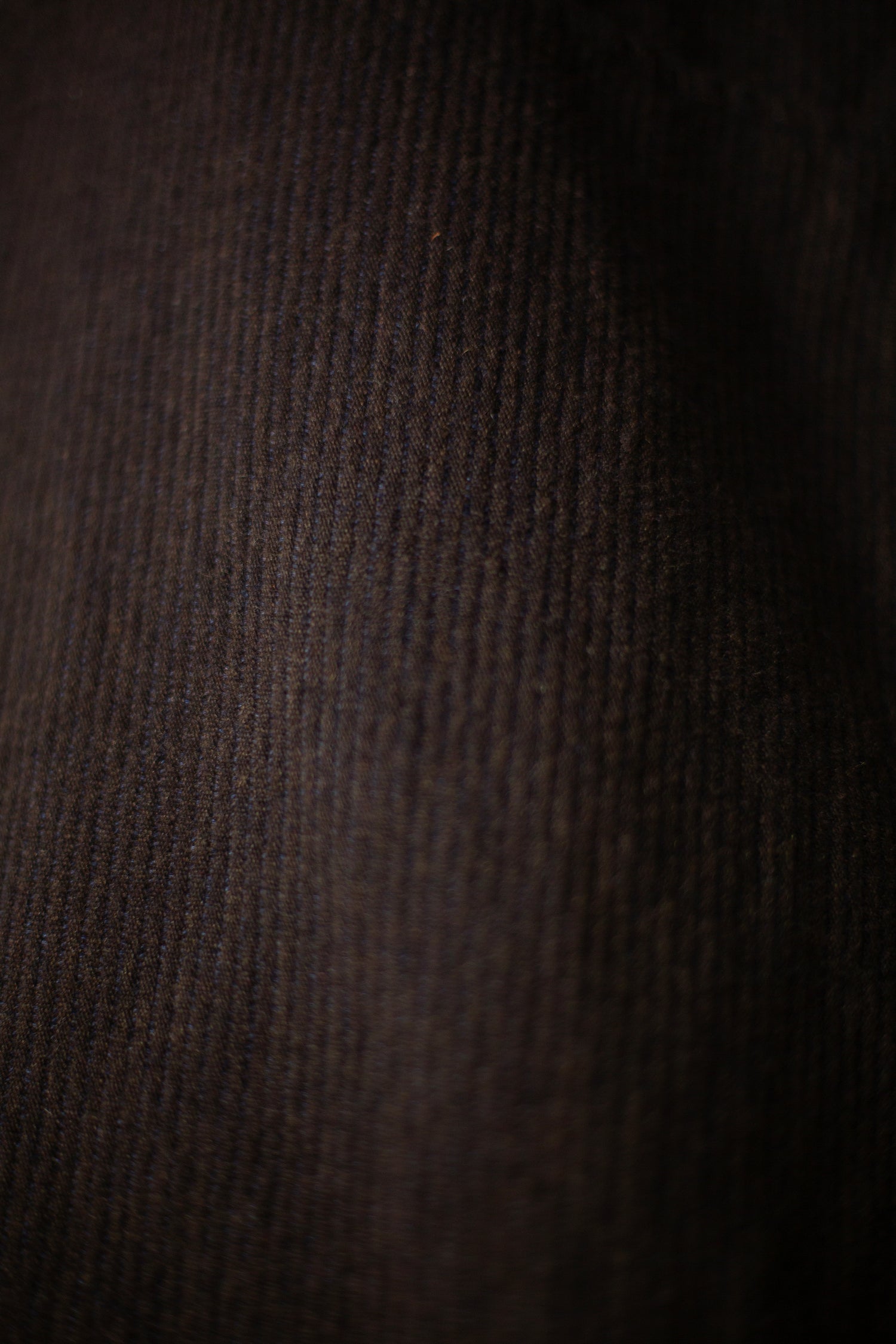 THIS CORDUROY-LIKE FABRIC IS MADE UP OF A DENSE AND TEXTURED BROWN WOOL AND CASHMERE FRONT, WITH A SPARSELY WOVEN BACKING OF LINEN THREADS IN BLUE. AS THE FABRIC MOVES, HINTS OF INDIGO-TONED BLUE PIERCE THROUGH WITH ITS SHEEN.