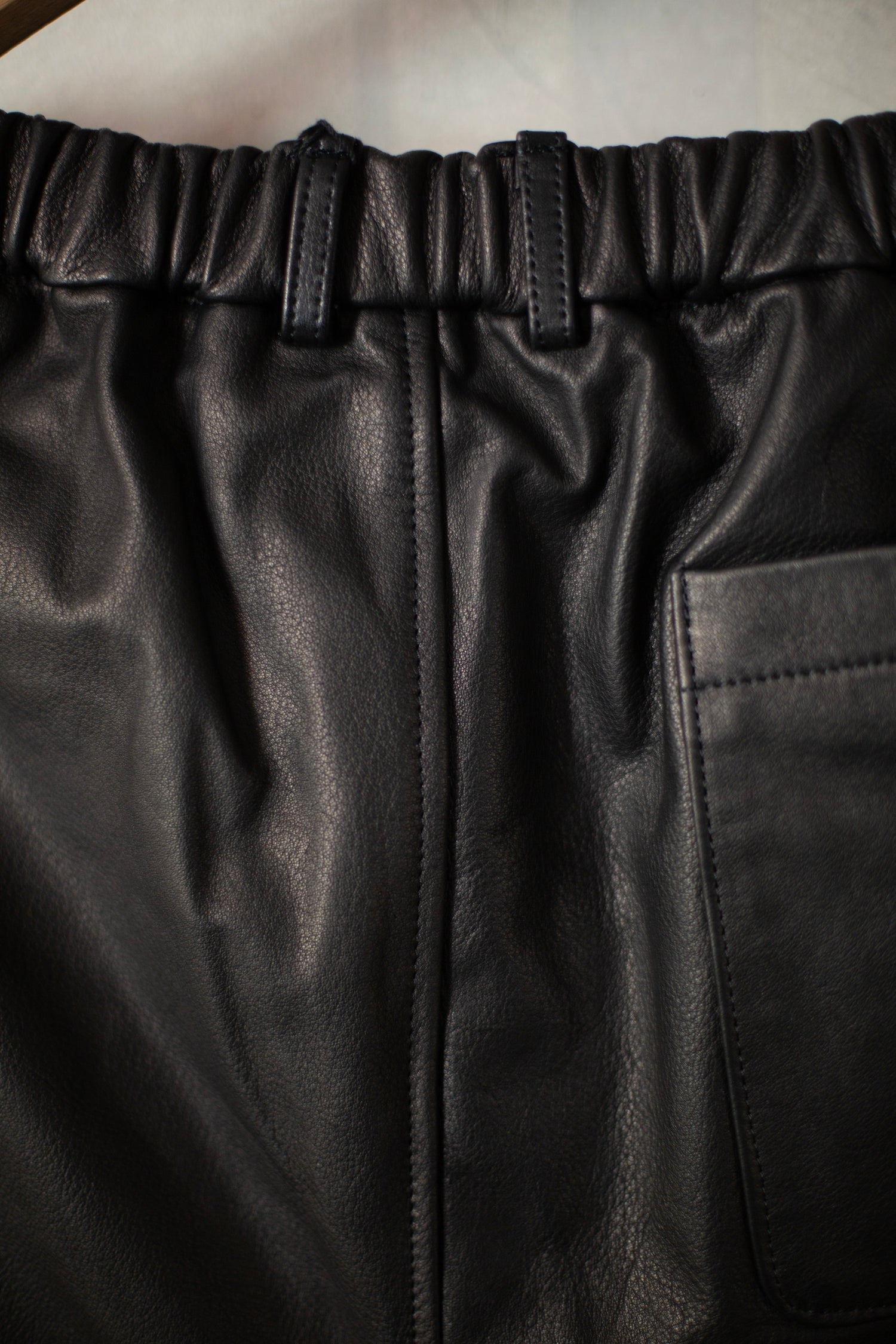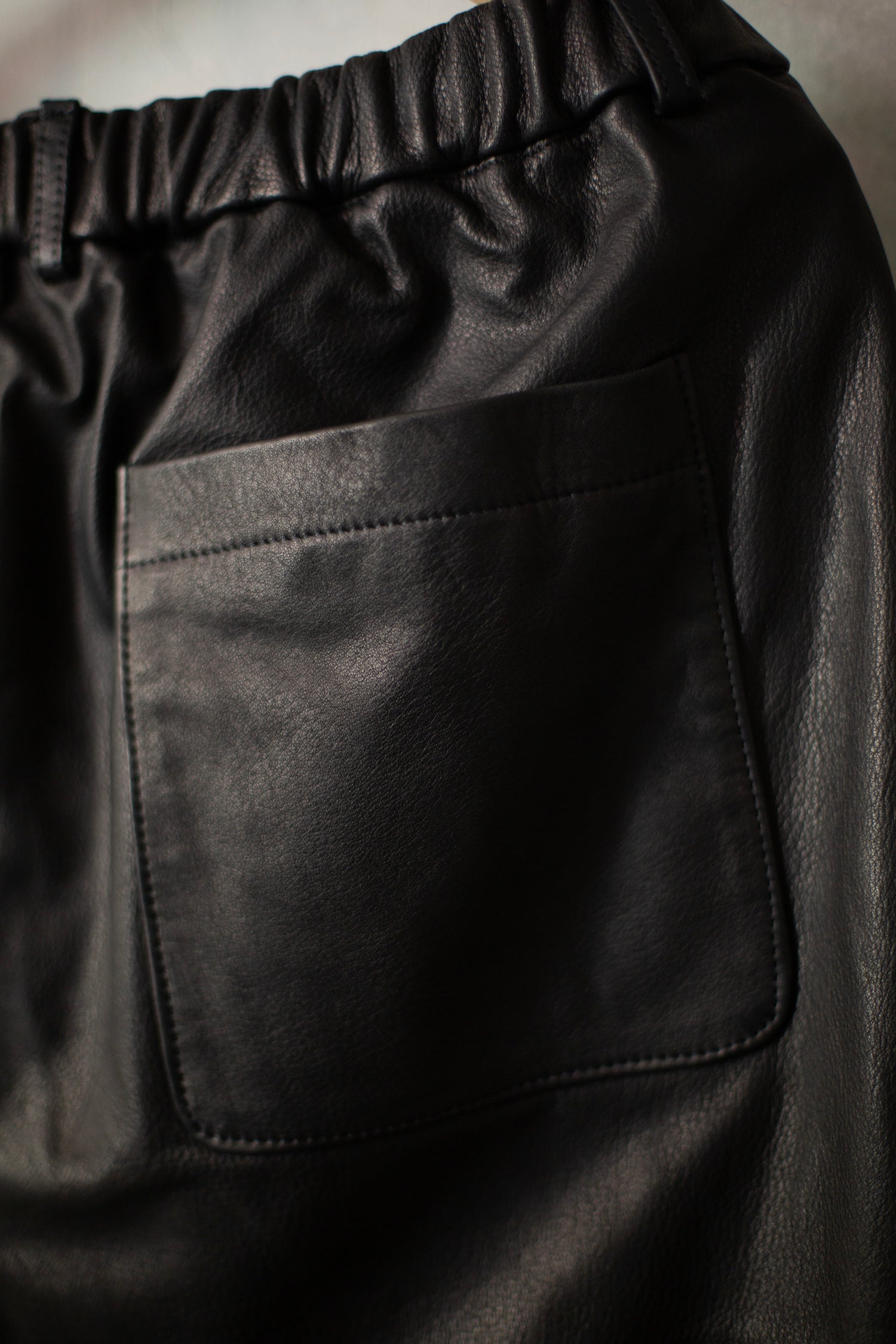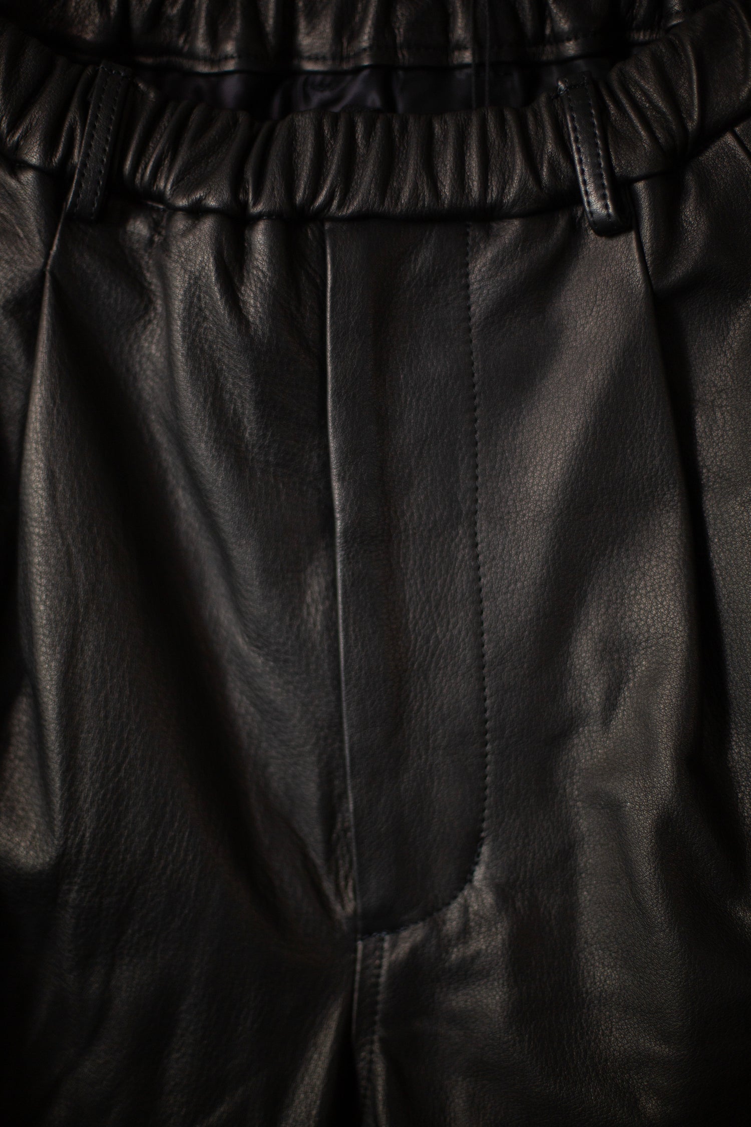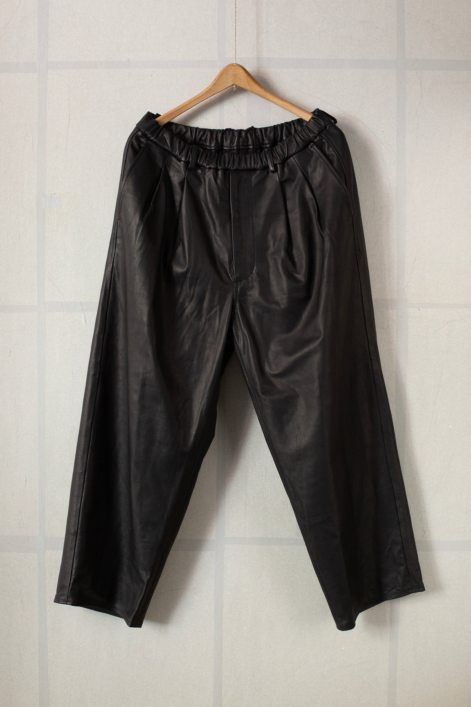 Two Tuck Wide Fit Trousers by Yoko Sakamoto in black full grain leather, with elasticated waistband, lined from waist to knees with 100% cupro.