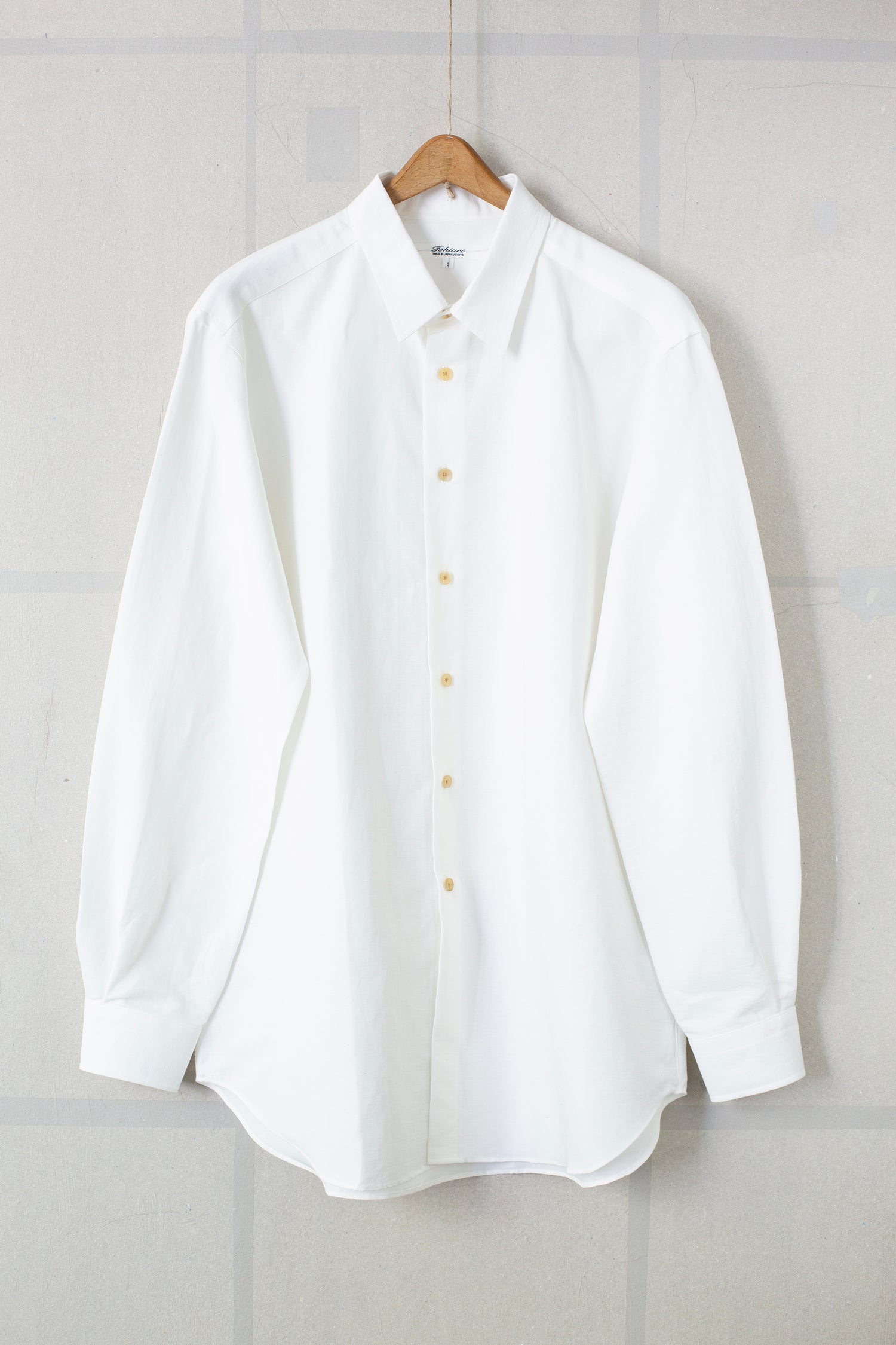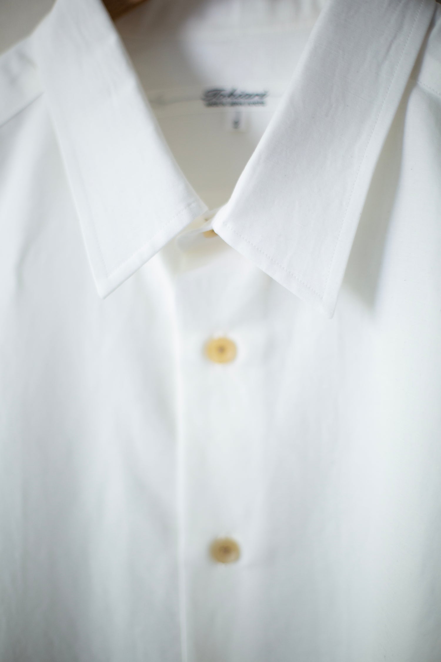 White linen cotton classic shirt by Tokiari with beige buffalo horn buttons and adjustable sleeve cuffs.