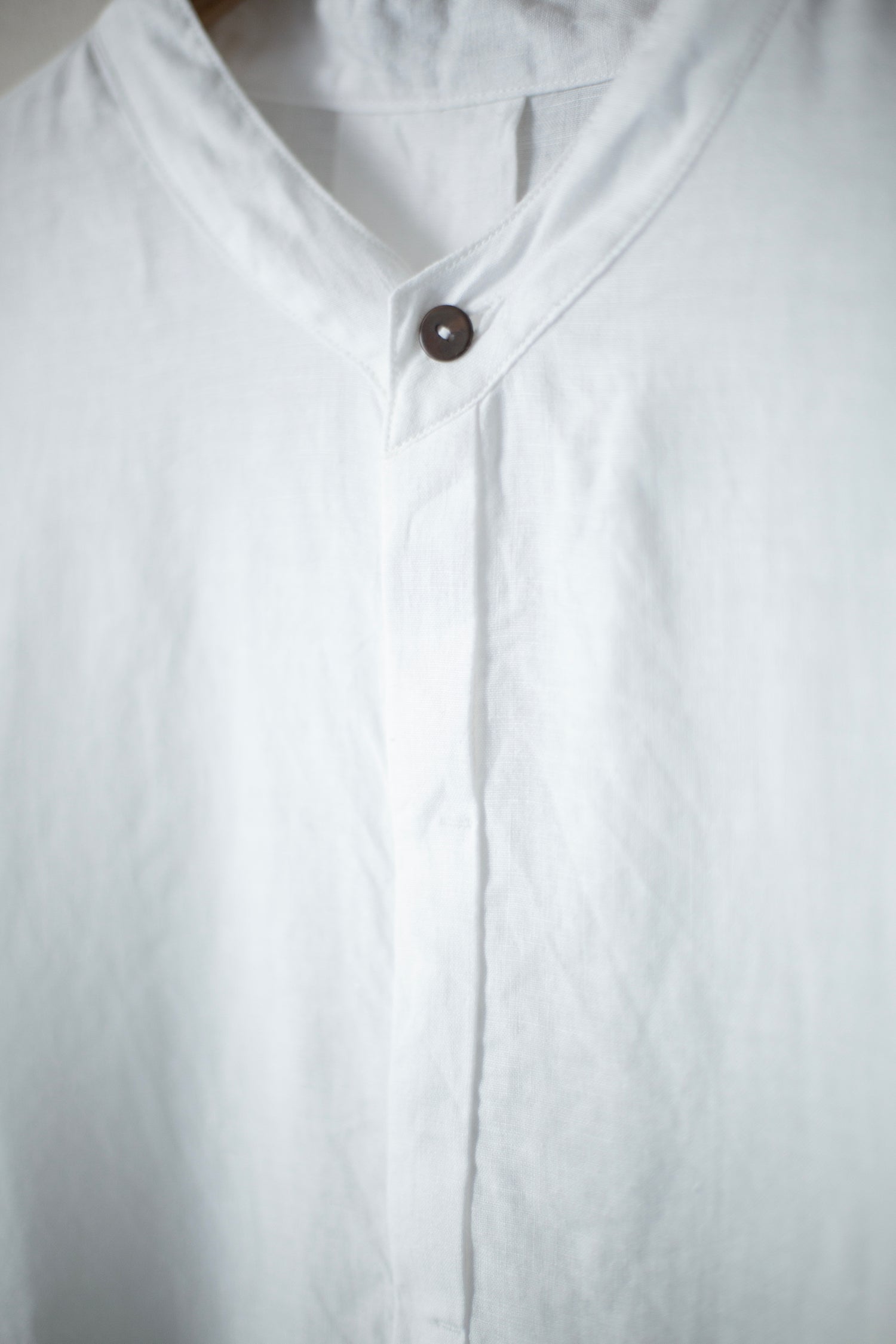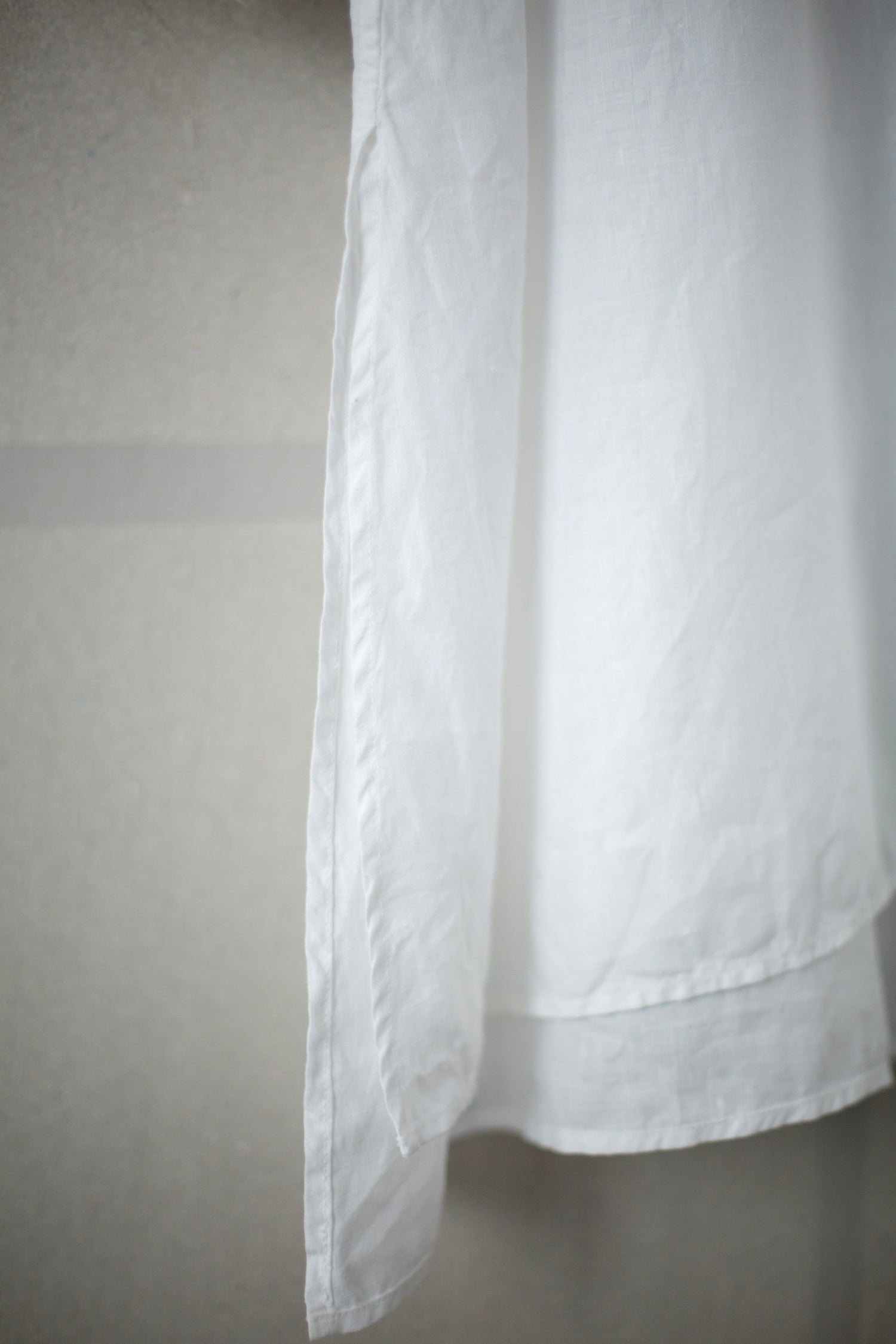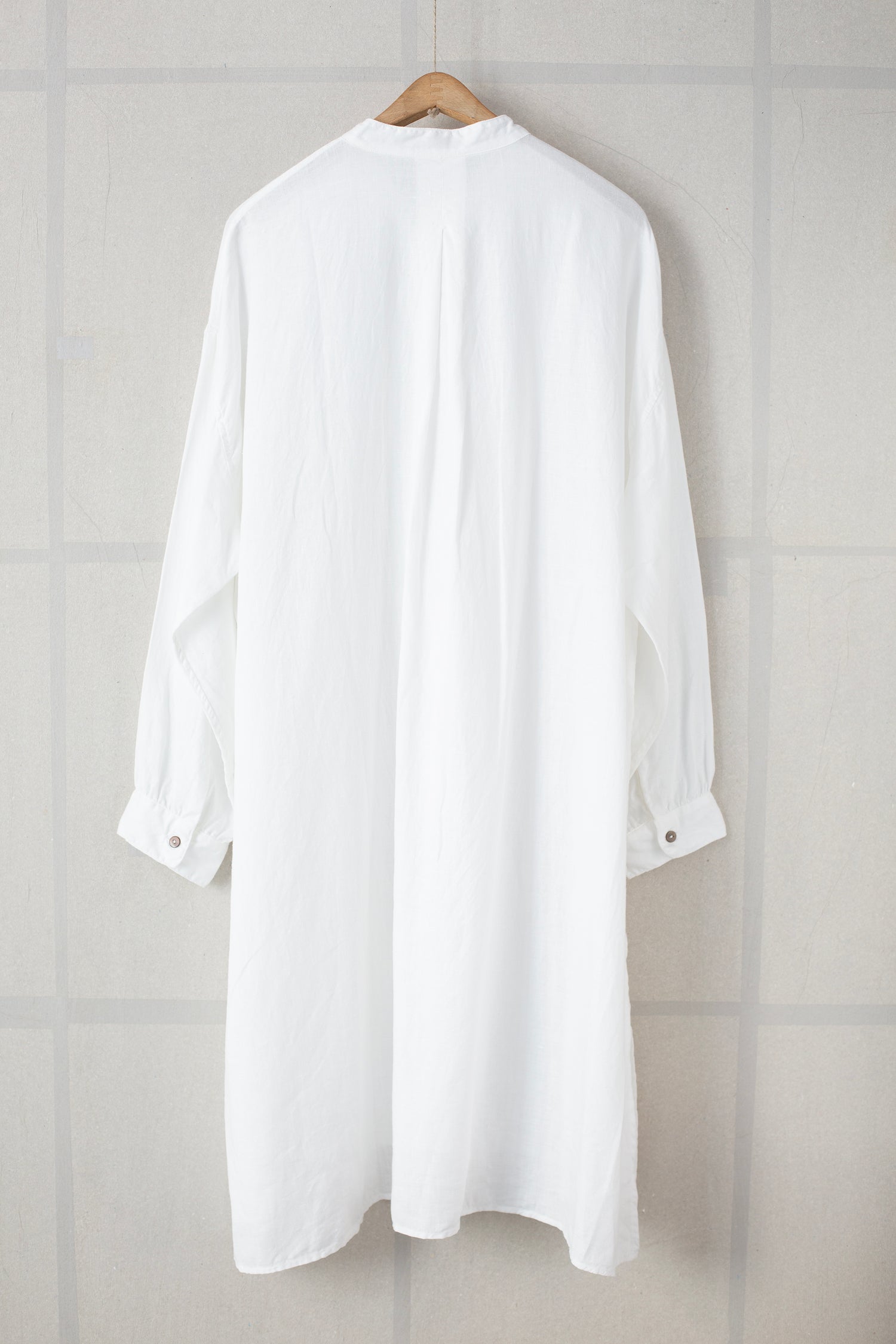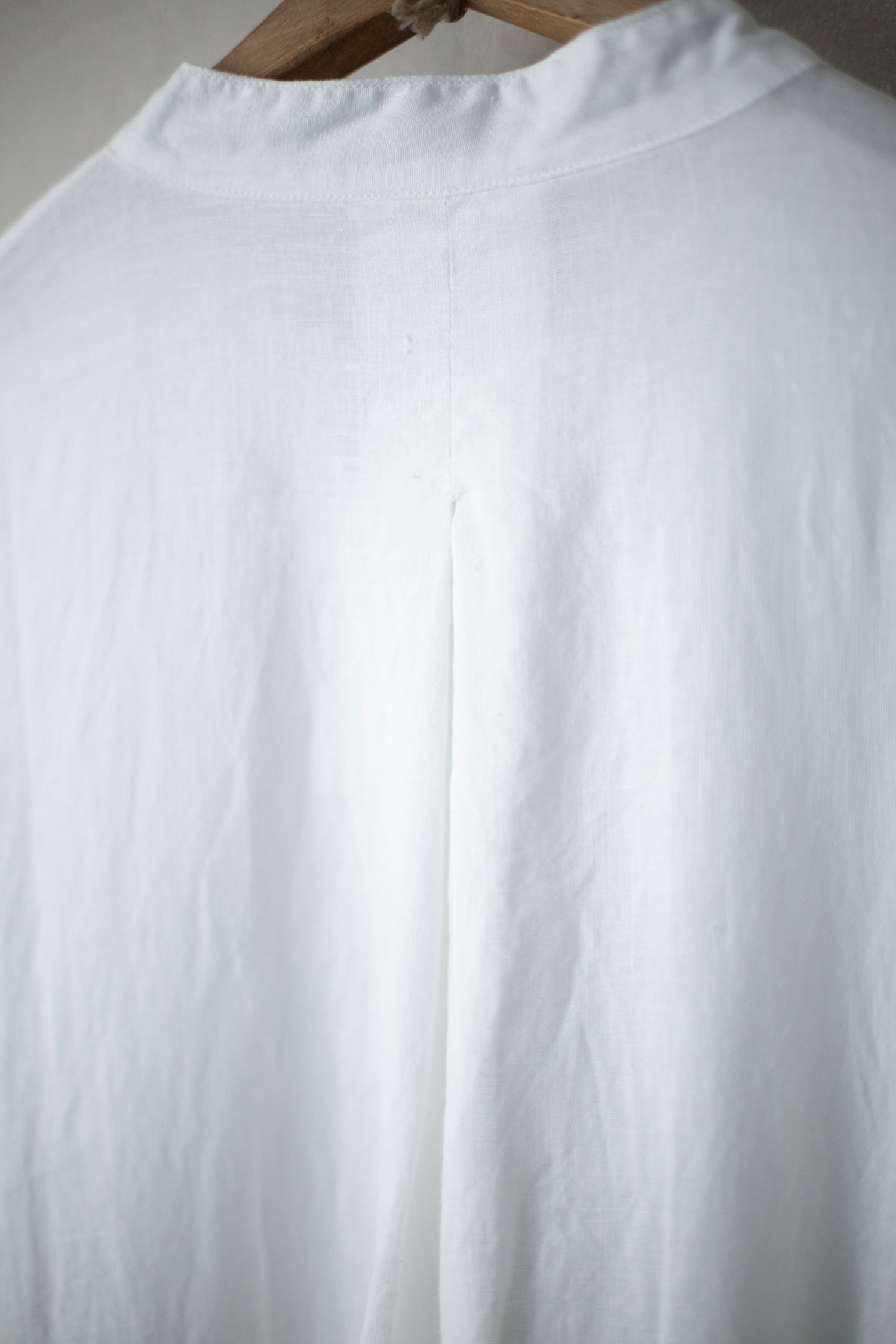 Wide long shirt by Mittan in white soft hemp with no collar, pleat in back and split on the sides.