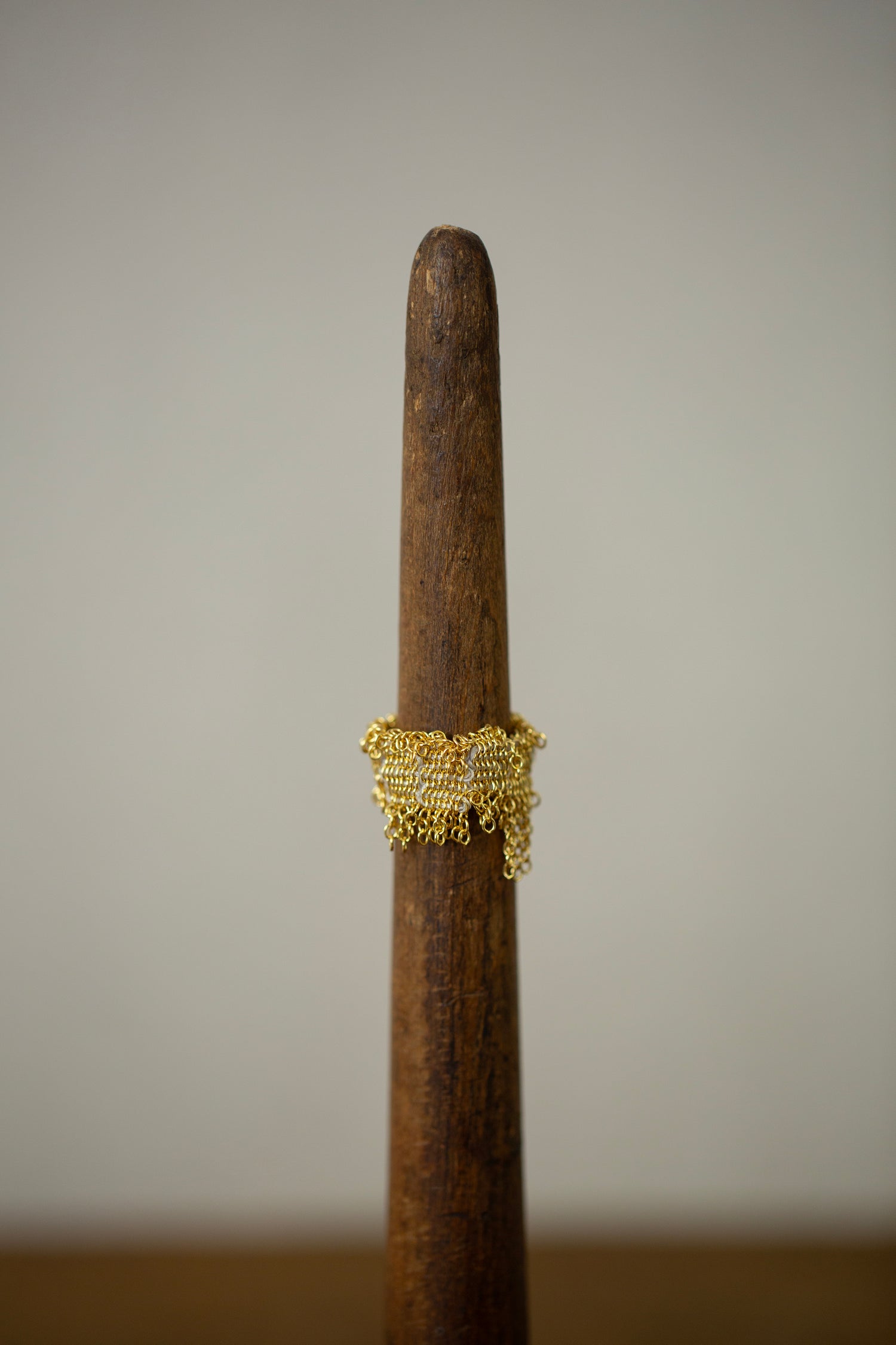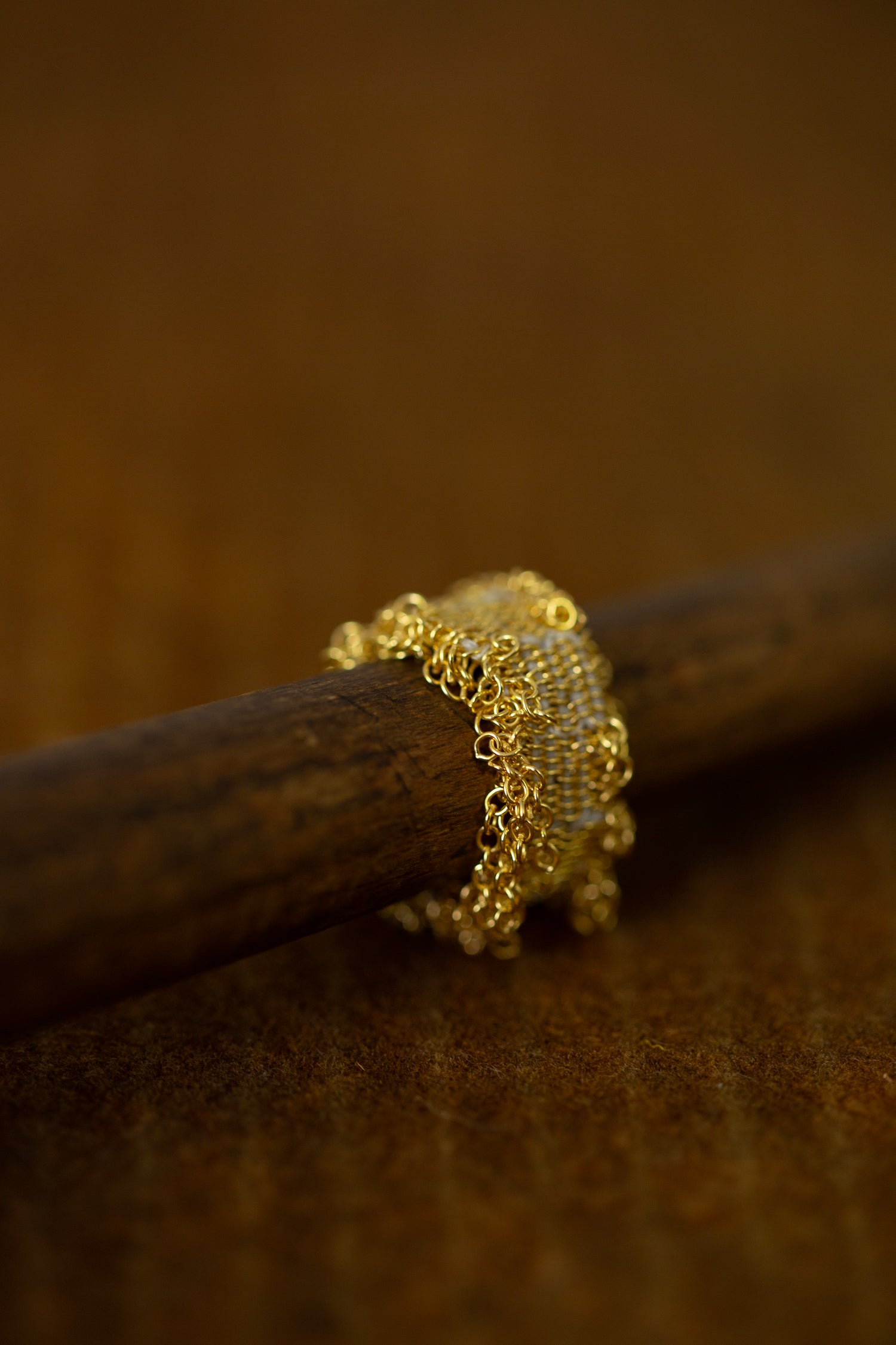 Beautiful wide hand woven ring in gold plated 925 sterling silver chains with silk yarn from '17' by Stephanie Schneider.