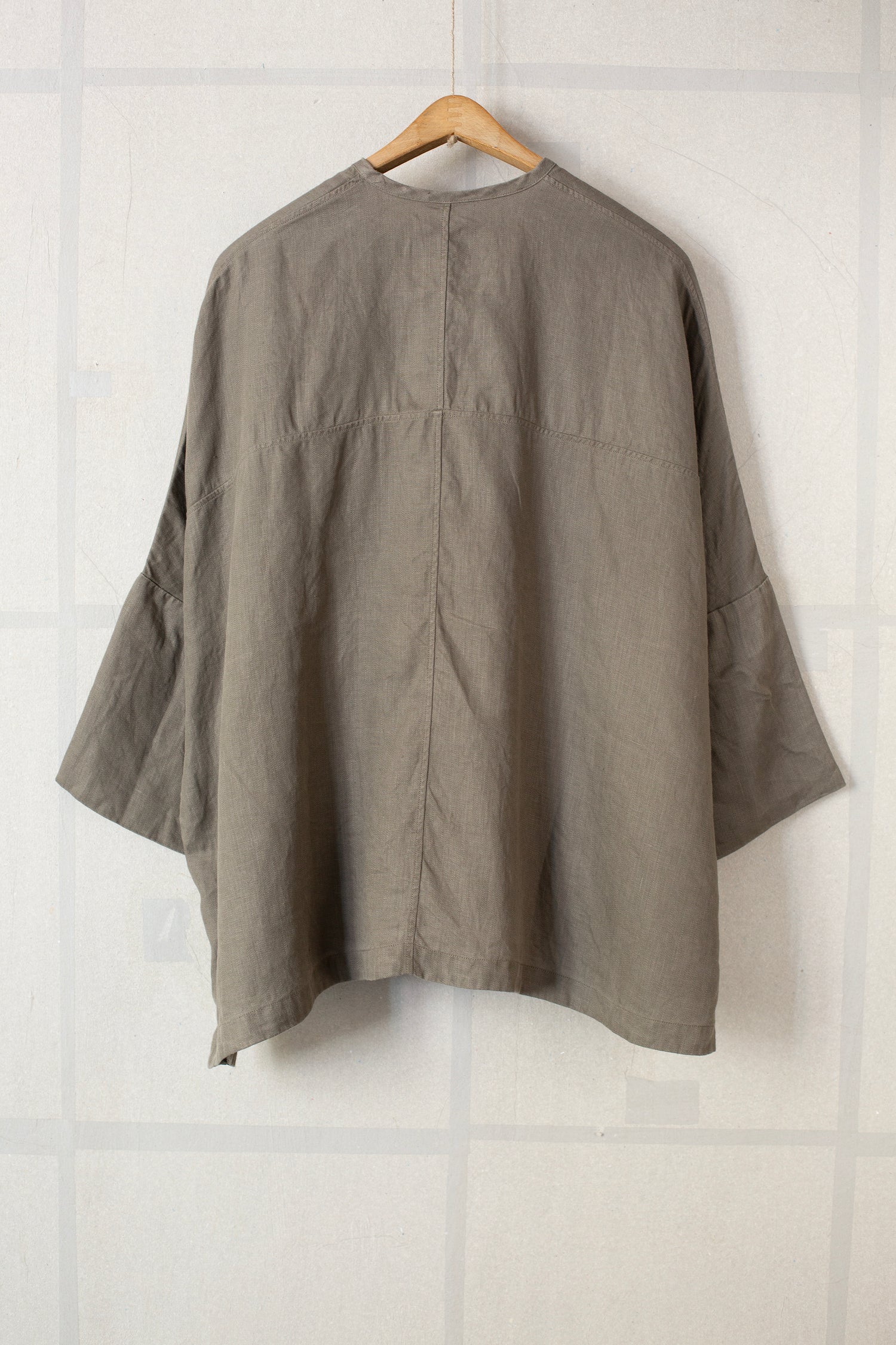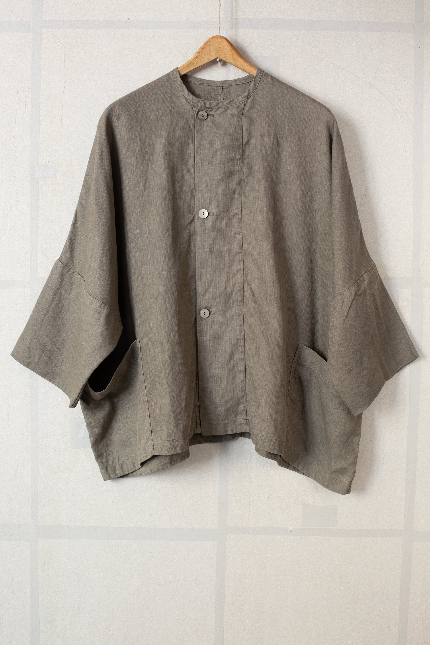 Light, half sleeved, jacket in dark mugwort ripple hemp twill by Mittan with a loose silhouette, patched front pockets and natural shell buttons.